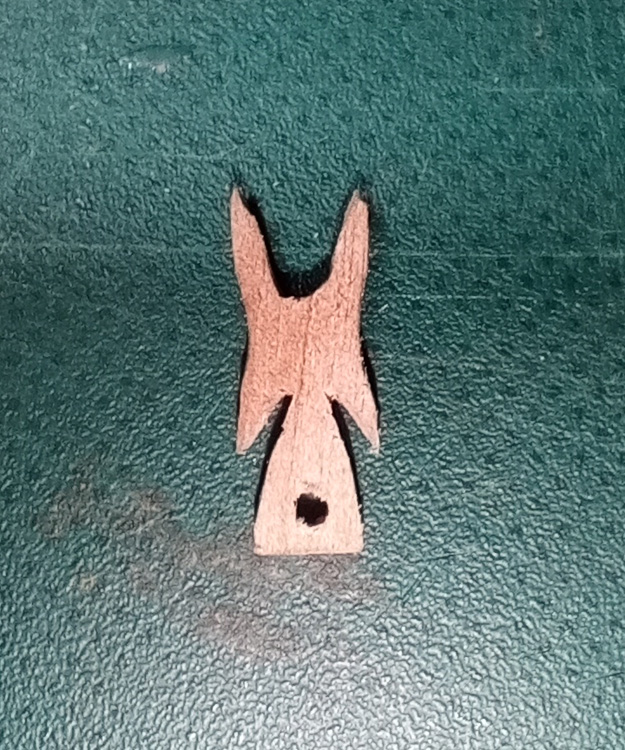 Kolejne duperele, które trza było wyrzeźbić to ściągacze. Ściągacze sztagu i achtersztagu to takie rogate cóś. Początkowo próbowałem wszystko wypiłować raszpelkami, ale nie wychodziło zbytnio. Więc zaangażowałem elektronarzędzia: najcięższy pręcik oklejony glaspapierem i najmniejszą tarczkę-piłę zębatą.