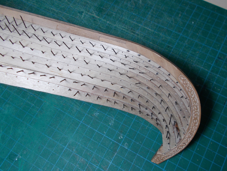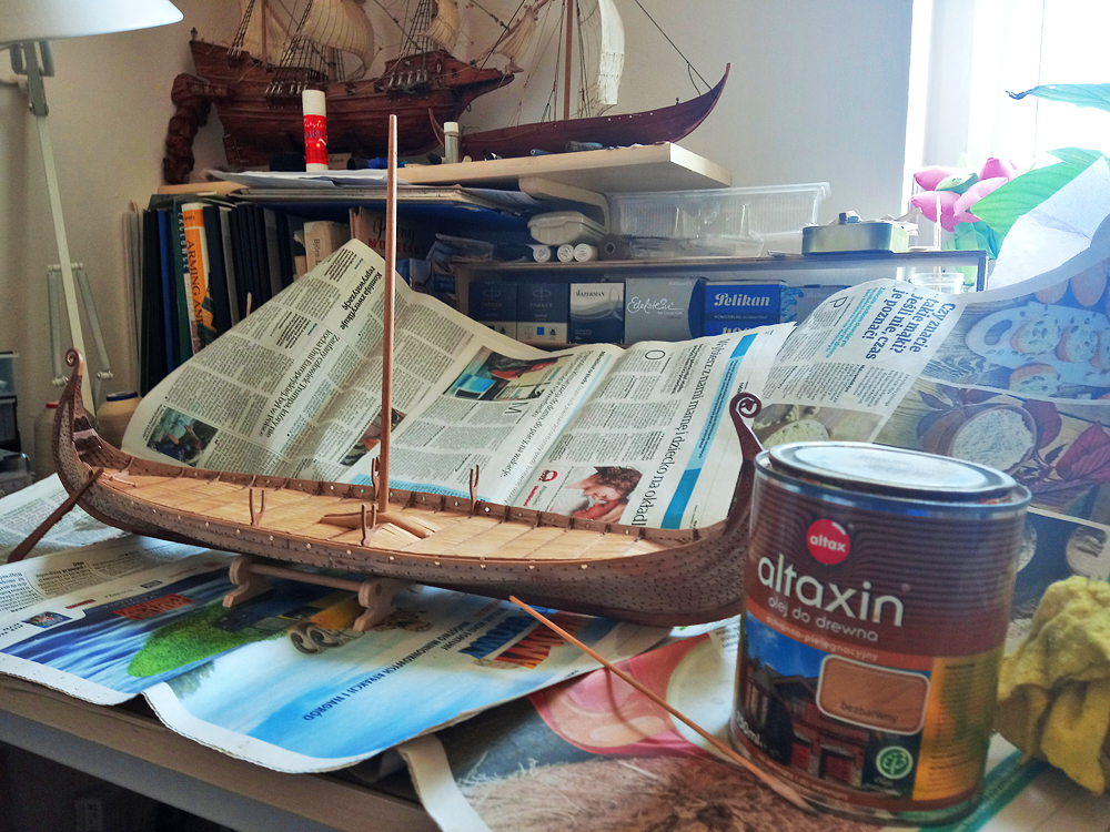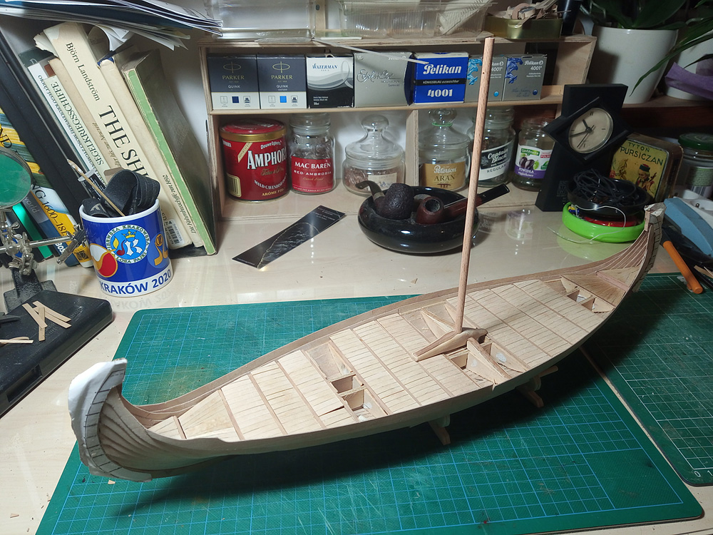 Trochę zaniedbałem relację, czas nadgonić. Poszycie kadłuba gotowe, czas położyć pokład. Tutaj taka ciekawostka, przy bloku masztowym pokład się wznosi, tworzy się taki wał a środku pokładu.