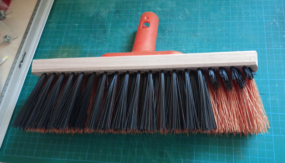 Do czego służy szczotka? No oczywiście do zamiatania. też tak sądziłem, do czasu. Długo zastanawiałem się, jak zrobić imitacje nitów. W modelu ćwiczebnym wklejałem takie mikro kulki, ale był problem z klejem, zostawała otoczka kleju co było widoczne. Szpilki mają za duże łepki, szpilki bez łepków za cieńkie... aż wpadłem na to, aby wykorzystać szczotkę, taką do zamiatania ulicy, z grubszym włosiem. No i nawet jako tako to wyszło.