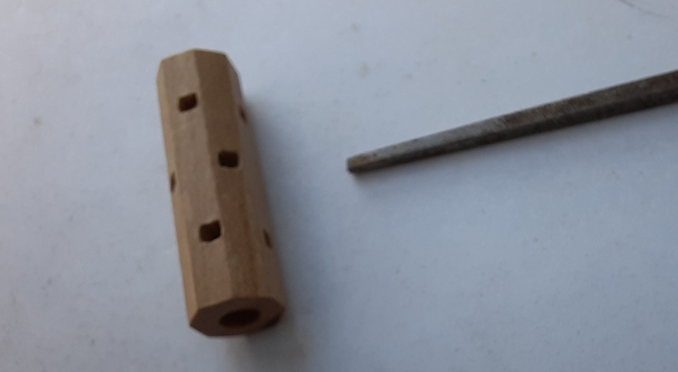 Po takiej informacji od Tomka to nic tylko robić. Z uwagi że to pierwsza połowa XVII w. wybrałem rurę drewnianą. Dla kontrastu wziąłem kołek z orzecha fi2,9 mm i przewierciłem otwór 1,5 mm i ma to udawać rurę drewnianą. Nie tak były one robione ale widać będzie przecież tylko końcówki. Z tym kontrastem to przesadziłem bo wystarczyła by grusza. Jak to wyszło zobaczcie na zdjęciach. Do następnego... Janek