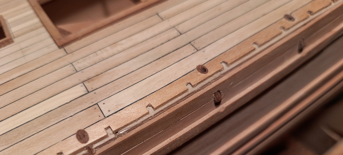 Teraz kiedy burty wystają ponad pokład to rzeczywiście musztarda po obiedzie. A ponadto nie czuję żeby coś w tym miejscu się błyszczało. Podobnie do mnie zrobili godni naśladowania modelarze jak Mati przy swojej papudze czy czeski modelarz Ondras 71 przy Roter Lowe ( relacja na MSW). Drewniane rury pozostaną i dojdą tylko nakładki z gruszy po zewnętrznej stronie burty. Dziękuję ! Janek