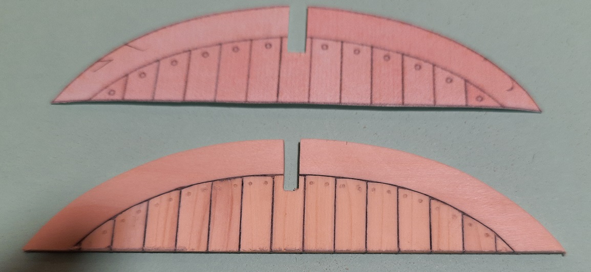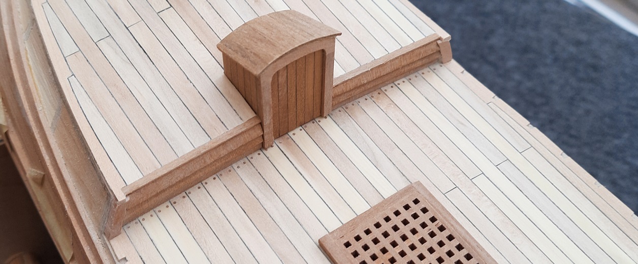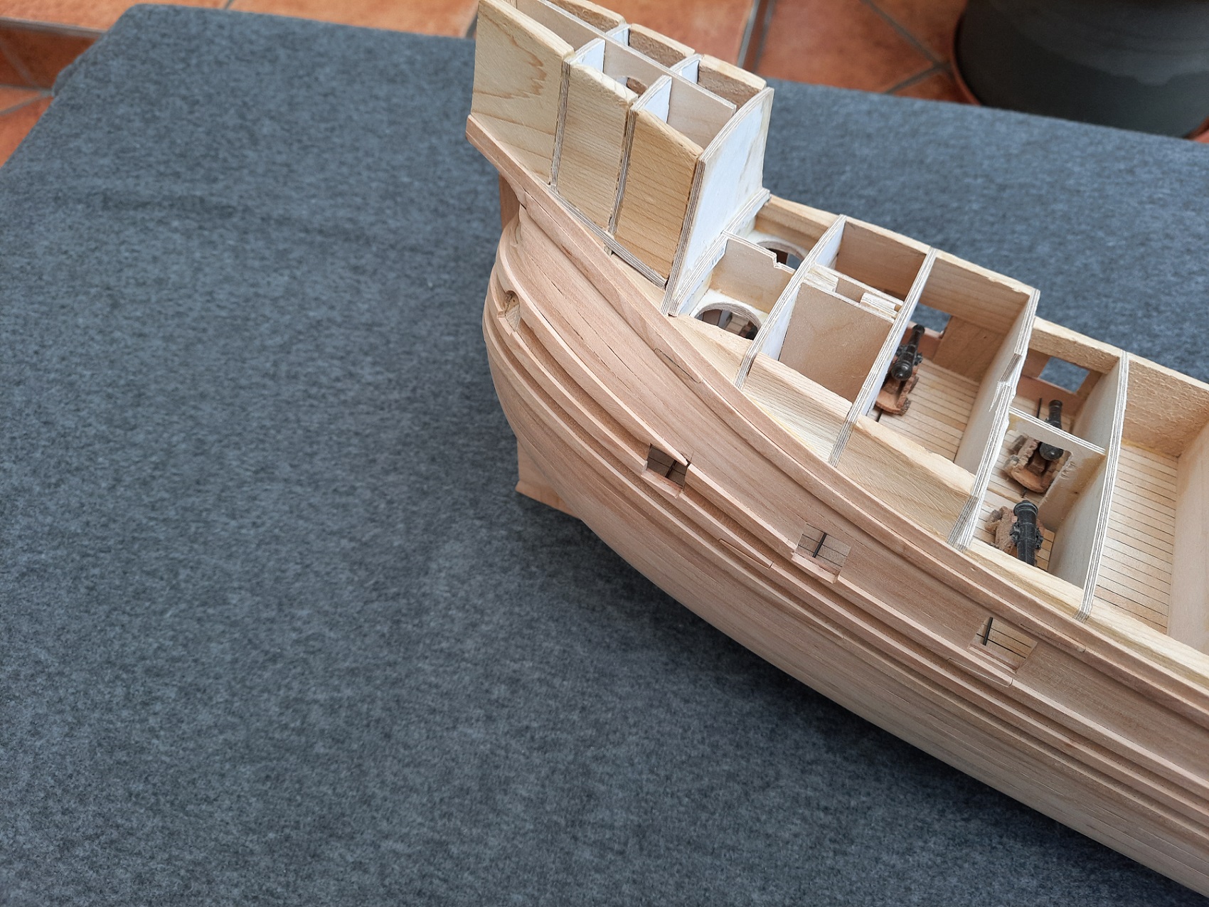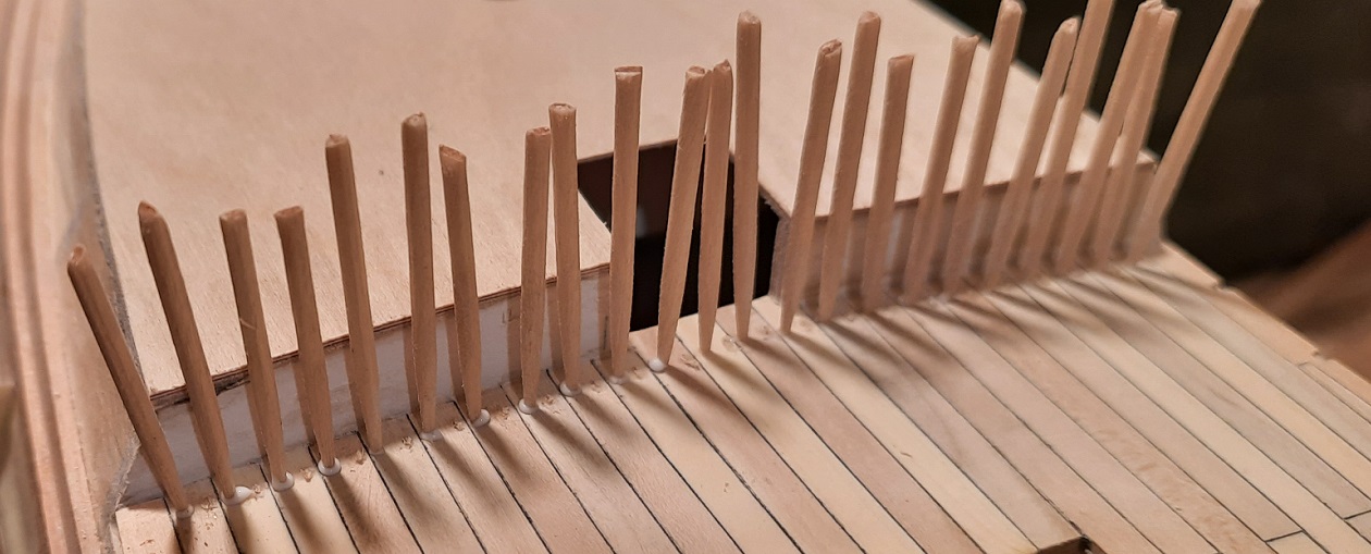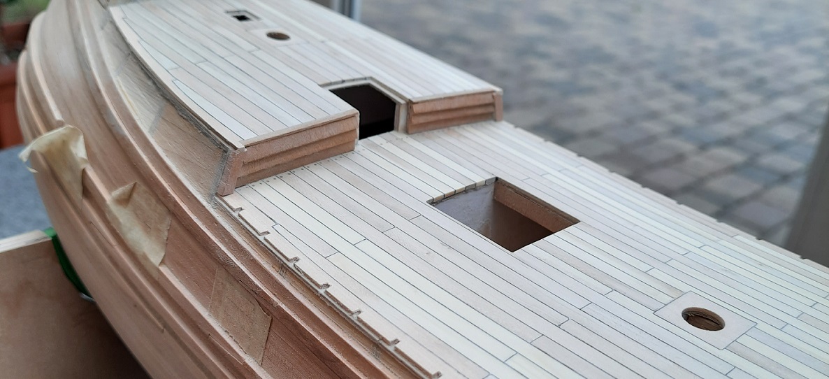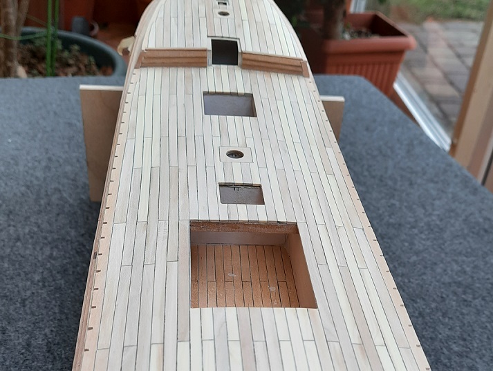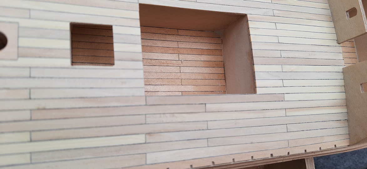 W stoczni zaczęły się roboty pokładowe. Na deskowanie miałem deseczki do wyboru z brzozy, z derenia i z ostrokrzewu tu bardziej znanego jako holly. Wybrałem ten ostatni bo ma odcień szarości bardziej przypominający osmagany słońcem i słoną wodą prawdziwy drewniany pokład. Uszczelnienia między deskami są z czarnego papieru naklejonego na deseczki które pokrywam jeszcze rzadkim kaponem by się nie rozwarstwiał i dopiero tnę na listewki. Na próbę wykonałem też jeden rząd kołkowania wykałaczkami brzozowymi z czego nie jestem specjalnie zadowolony bo wyszły zbyt wyraźnie na tle desek i sprawiają wrażenie "sztuki dla sztuki". Z uwagi na małą ilość holly jaką posiadałem brzegowe deski (waterway) zrobione są już z brzozy. Mimo że zrobiłem płaską ściankę z desek na zakładkę to nie opanowałem jeszcze techniki pocieniania listewki w górnej części na którą przyklejana jest następna deska. Próbowałem na pochylonej pile ale nie wychodzi to równo i w końcu jest to pocieniane ręcznie papierem ściernym. Otwory w pokładzie muszą pasować do "mebelków" i stąd przymiarki na sucho. Pozdrawiam. Janek.