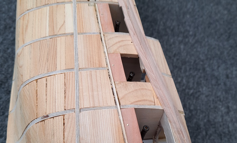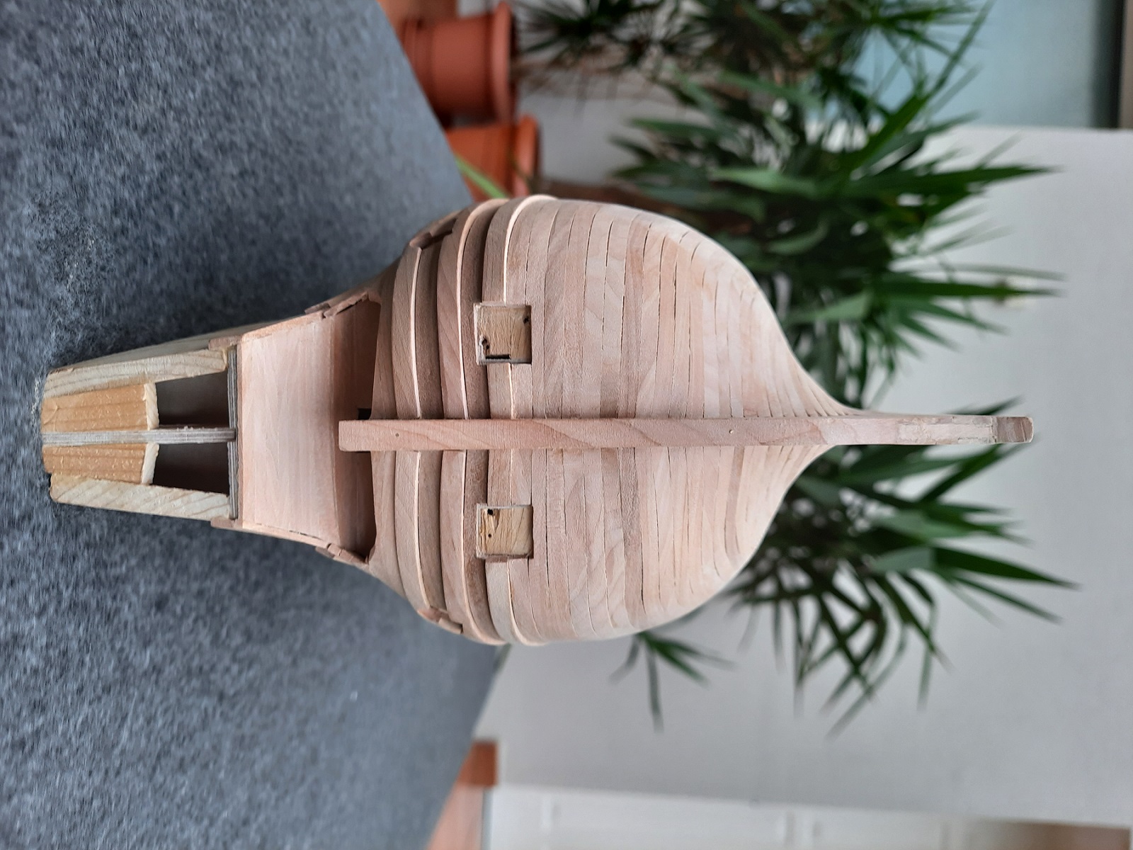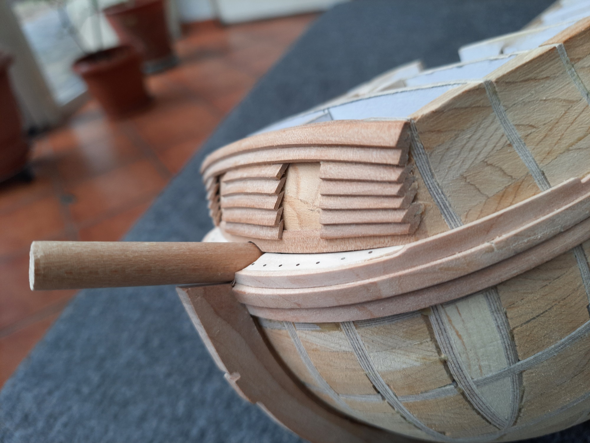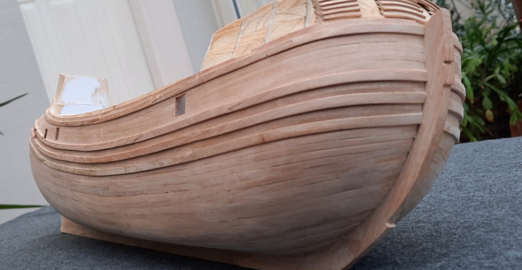Witam. To już trzeci rok z rzędu 30 grudnia składam meldunek z postępów w budowie modelu. Aby przystąpić do poszywania musiałem wykonać małe pokładziki na dziobie i rufie oraz brzuchatą ściankę przedniego kasztelu. Samo poszywanie okazało się dość trudne, nie dość że wypukłości są na dziobie i rufie to jeszcze są wklęsłości z zasadzką w którą wpadłem. Polega ona, ta zasadzka, na tym że normalnie przeszlifowanie planek robię tak że wewnętrzna szerokość planki jest zawsze ciut mniejsza od szerokości zewnętrznej a w przypadku wklęsłości po przeszlifowaniu szparka między plankami zaczyna się powiększać. Wniosek nie: nie zwężać planek po punkcie przegięcia. Ale to już musztarda po obiedzie. Same odbojnice z listewki 3x5 stawiały znaczny opór i gdyby nie patent Witka byłoby cieniutko mimo stosowania i wody i temperatury. Jeszcze do Witka armat na pokładzie nie będzie a będą jedynie dwie szrotownice a tak jak pisze Mateusz nasze żaglowce były niedozbrojone.