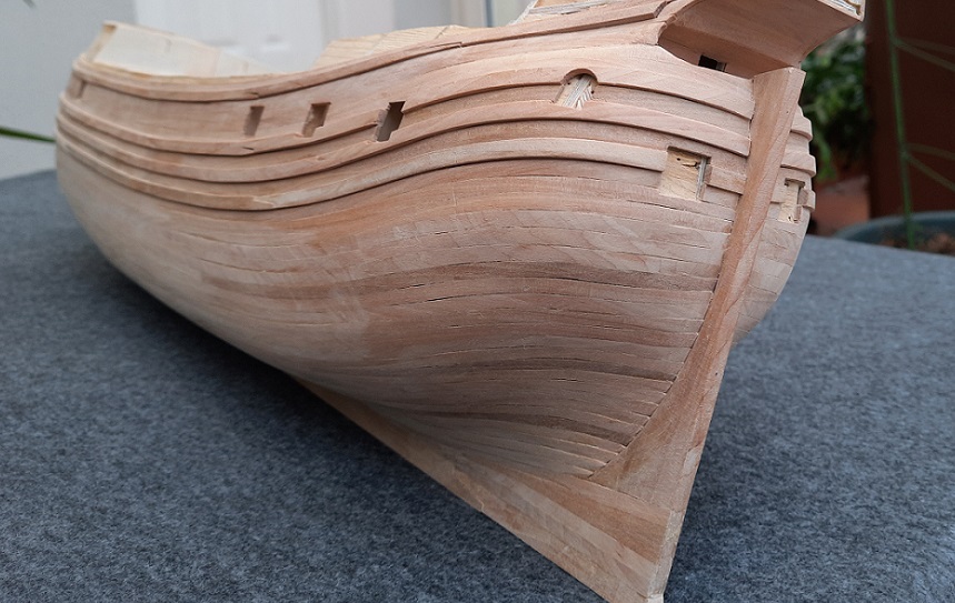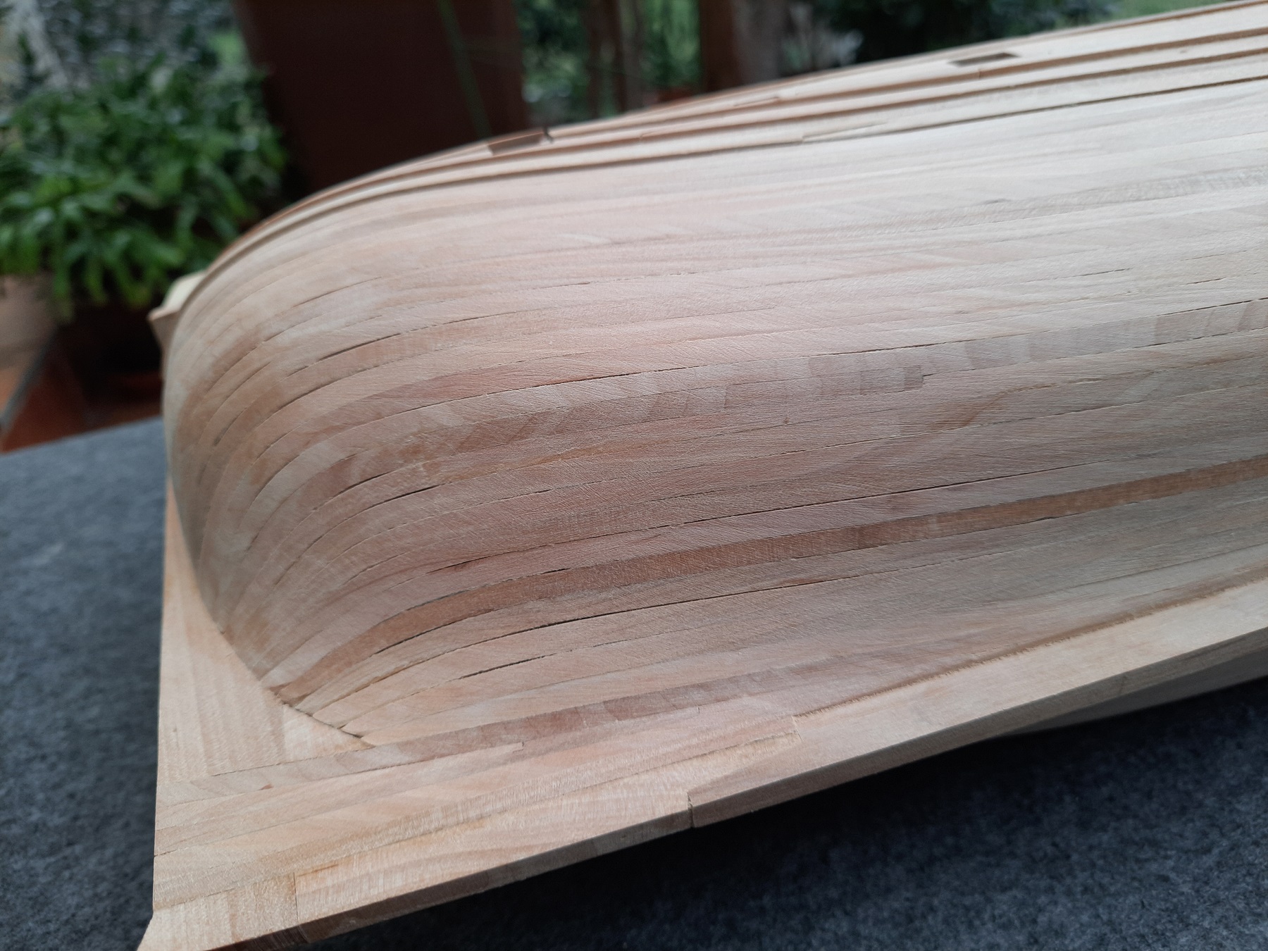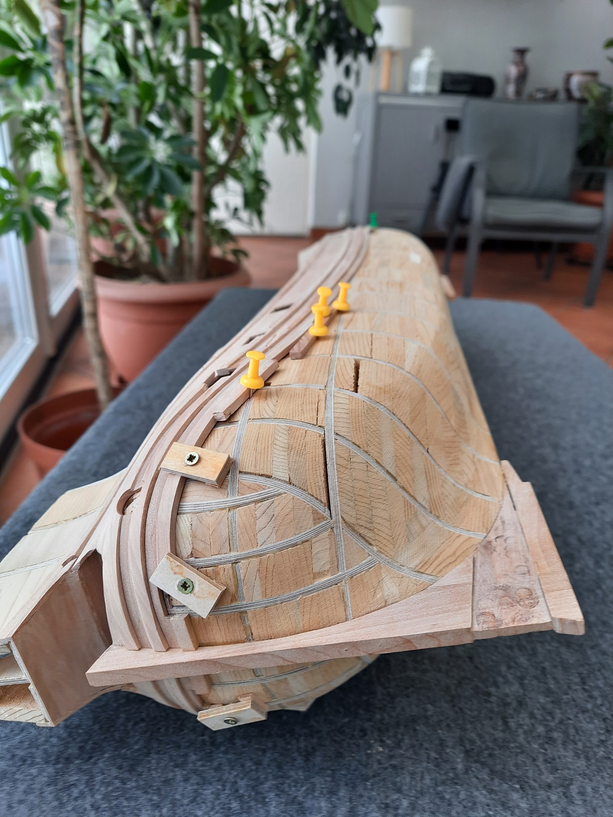 Cześć. Kolejny etap - poszycie- niemal zakończony. Wstępny szlif wykonany ale pozostało jeszcze dopieszczenie drobnym papierem ściernym. Poszywałem listewkami gruszy 1,6 x 4,2 mm ale dziś mogę powiedzieć że wystarczyłaby grubość 1,2 mm a byłoby łatwiej. Można podziwiać Holendrów i wydawnictwo Shipyard bo listewki układały się płynnie i ładnie przylegały do kopyta. Świadczy o tym fakt że konieczne było założenie tylko jednego stealersa na rufie nieco poniżej linii wodnej i trzech już na płetwie tuż nad stępką. Myślami jestem już trochę dalej i zastanawiam się jaki był przebieg liny kotwicznej od kluzy do kołowrotu. W planach nie ma żadnego otworu by lina wyszła na pokład. Skłonny już jestem przypuszczać że był jeszcze drugi kołowrót na dolnym pokładzie a może brakuje mi wyobraźni i chłopaki rwali kotwicę w inny prosty sposób. Do następnego spotkania. Janek