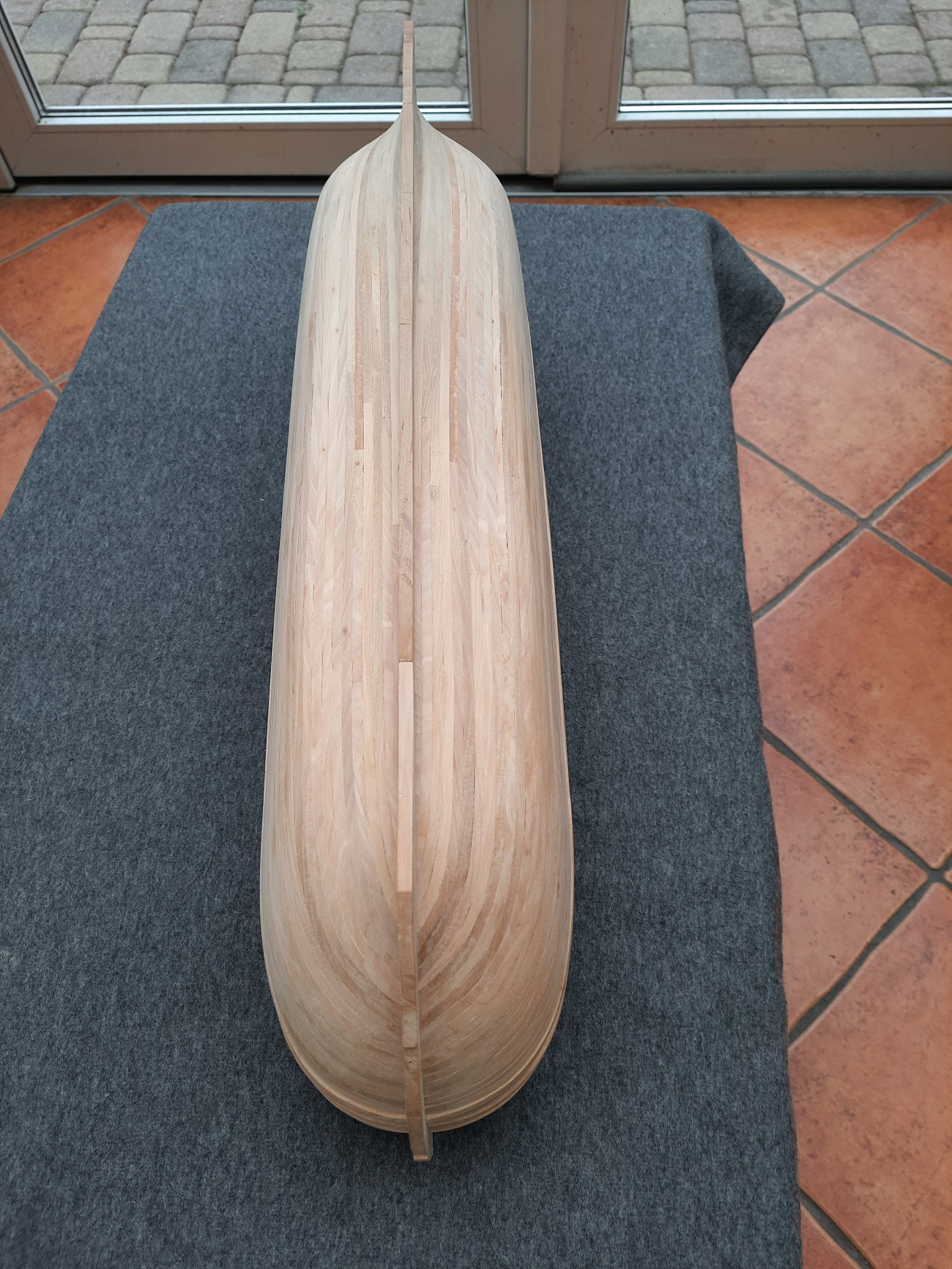 Druga krawedz listewek bedziesz mogl uzyc do zwezania kazdej z nich, proporcjonalnie do stopniowo zwezajacej sie burty, ku dziobowi i rufie.