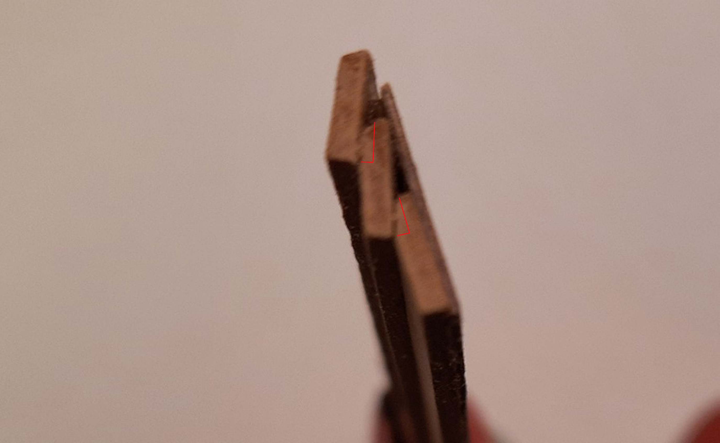 Jezeli masz mala tarczowa pilke stolowa typu np. Proxxon, to uwaznie ponacinaj na kazdej listewce rowki - naciecia z jednej krawedzi kazdej z listewek tak, aby wygladaly one jak na zalaczonym zdjeciu. Ten zabek bedzie stanowil swego rodzaju polke - barierke na ktorej beda siedzialy i opieraly sie nastepne listewki. Zapewni Ci to symetryczne szerokosci wszystkich planek na burcie.