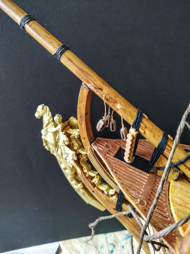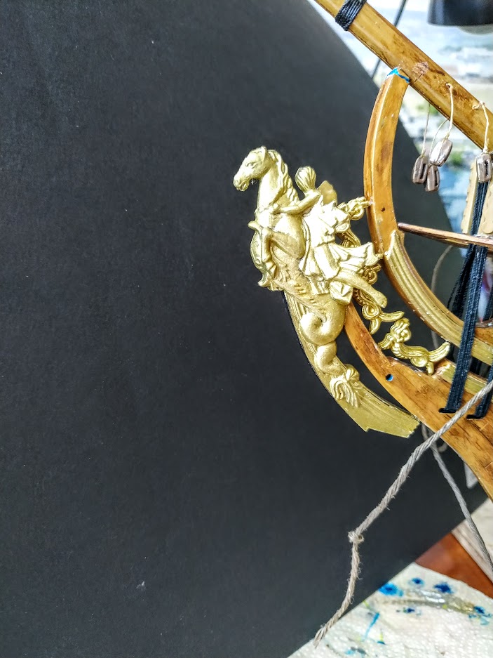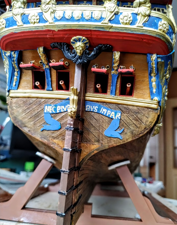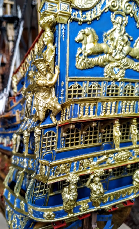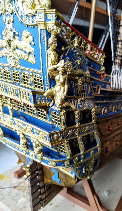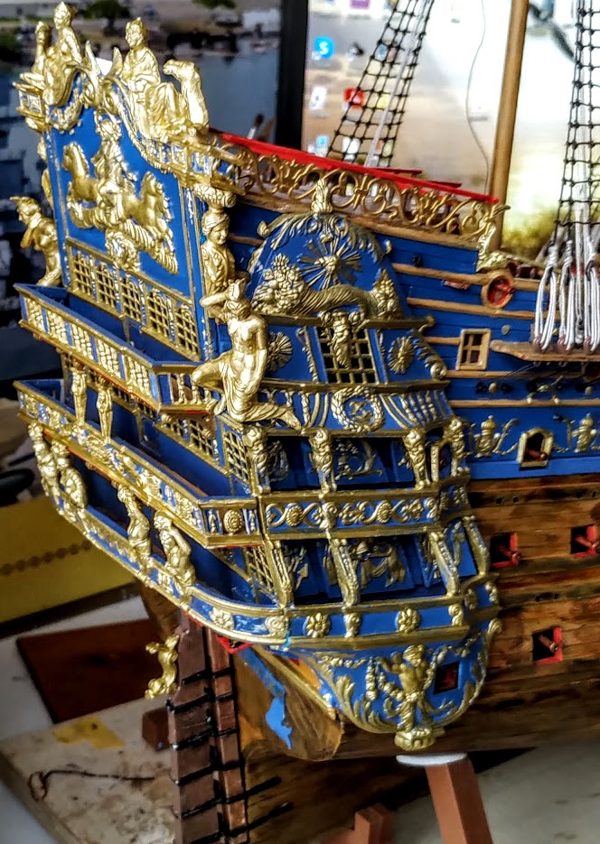 Dość długo mnie tu nie było ale się nie obijałem. Wykonano w komplecie ruf i ster. Doszły do tego elementy jakich nie przewidywał producent, takie jak otwarte balkony, motto "słonecznego Ludwika z tyłu rufy, ozdoba steru, dodatkowe ozdoby górnego pokładu rufowego i inne elementy, o których bedzie dalej...