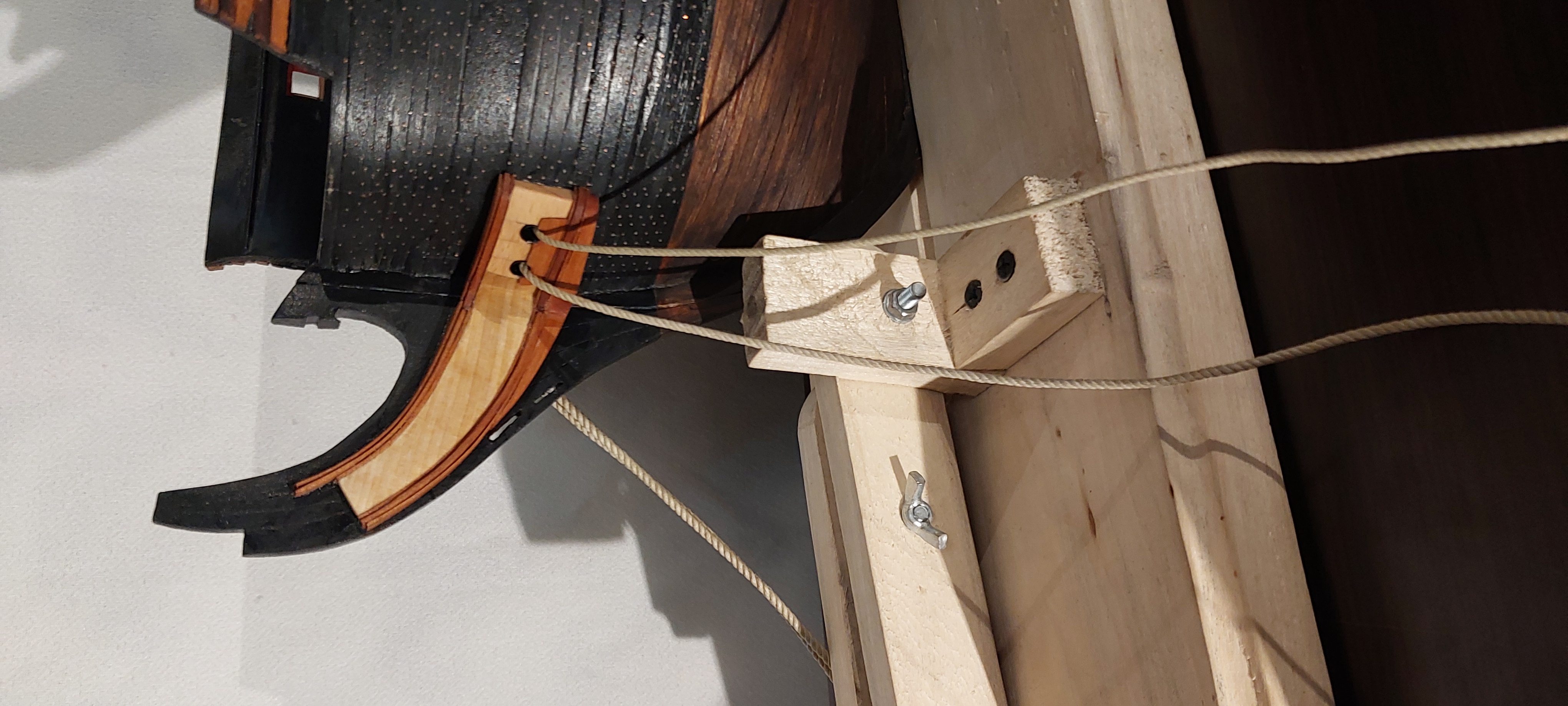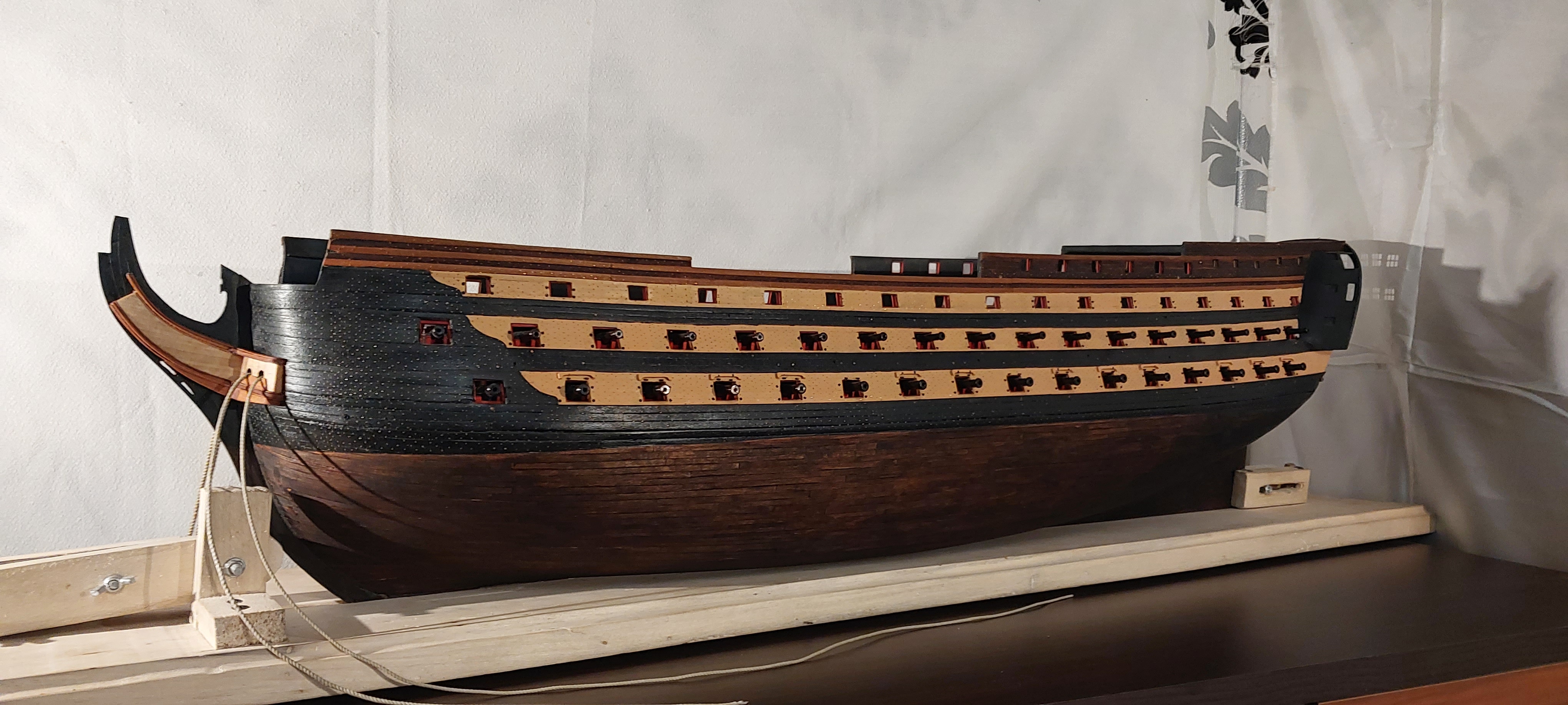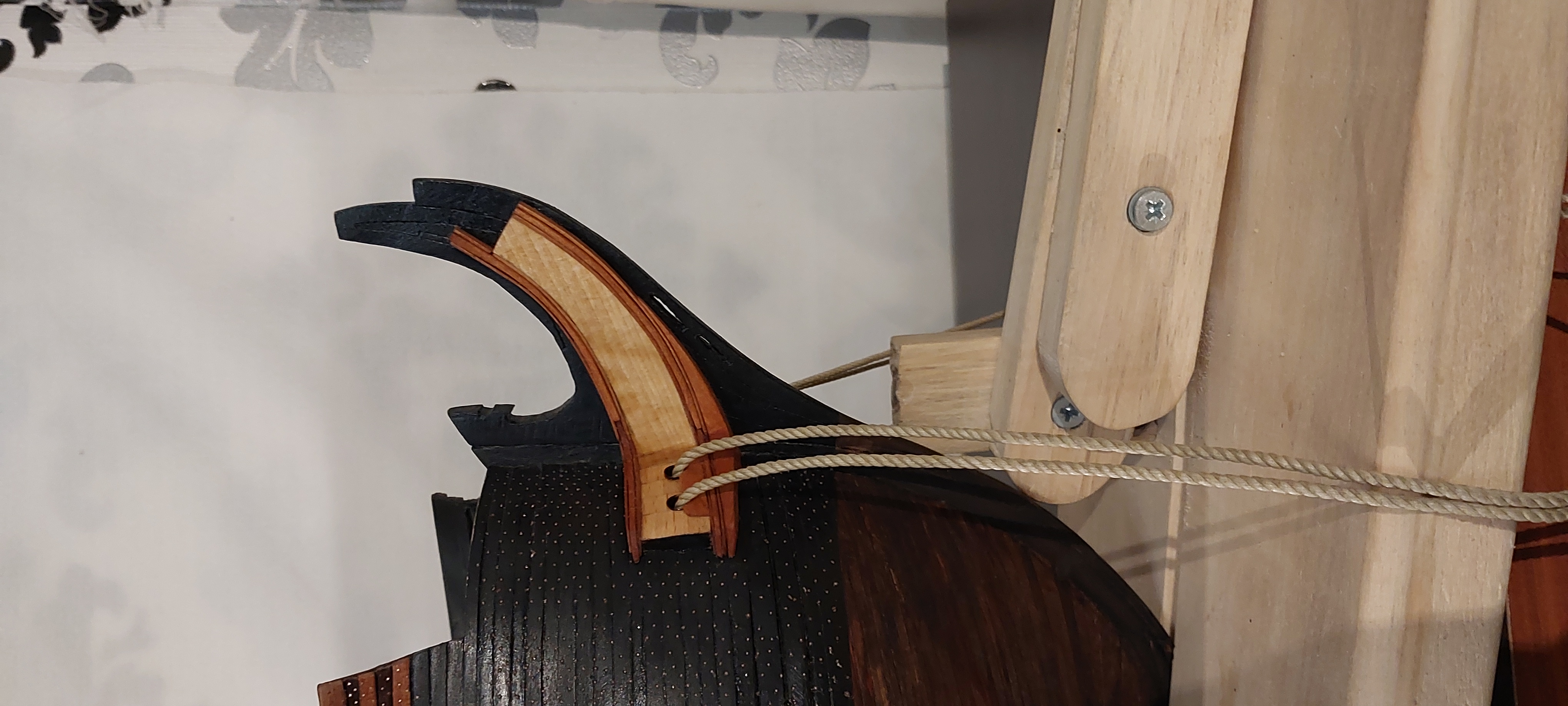 Jak widać weszły już armatki i doszło parę elementów na dziobie. Ryflowania nad i pod tzw policzkiem zrobiłem ze sklejonych warstw niecały 1mm i 2mm. Liny kotwiczne to gotowce od Amati tylko pozbawione kłaczków.