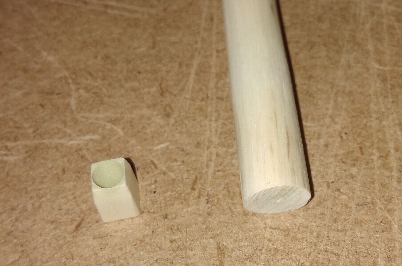 Blok u góry masztu zrobiony jest również z tego samego patyka (z jego grubszej, dolnej części której naddatek odciąłem), spiłowanego do graniastego kształtu z wywierconym otworem na kolumnę masztu.