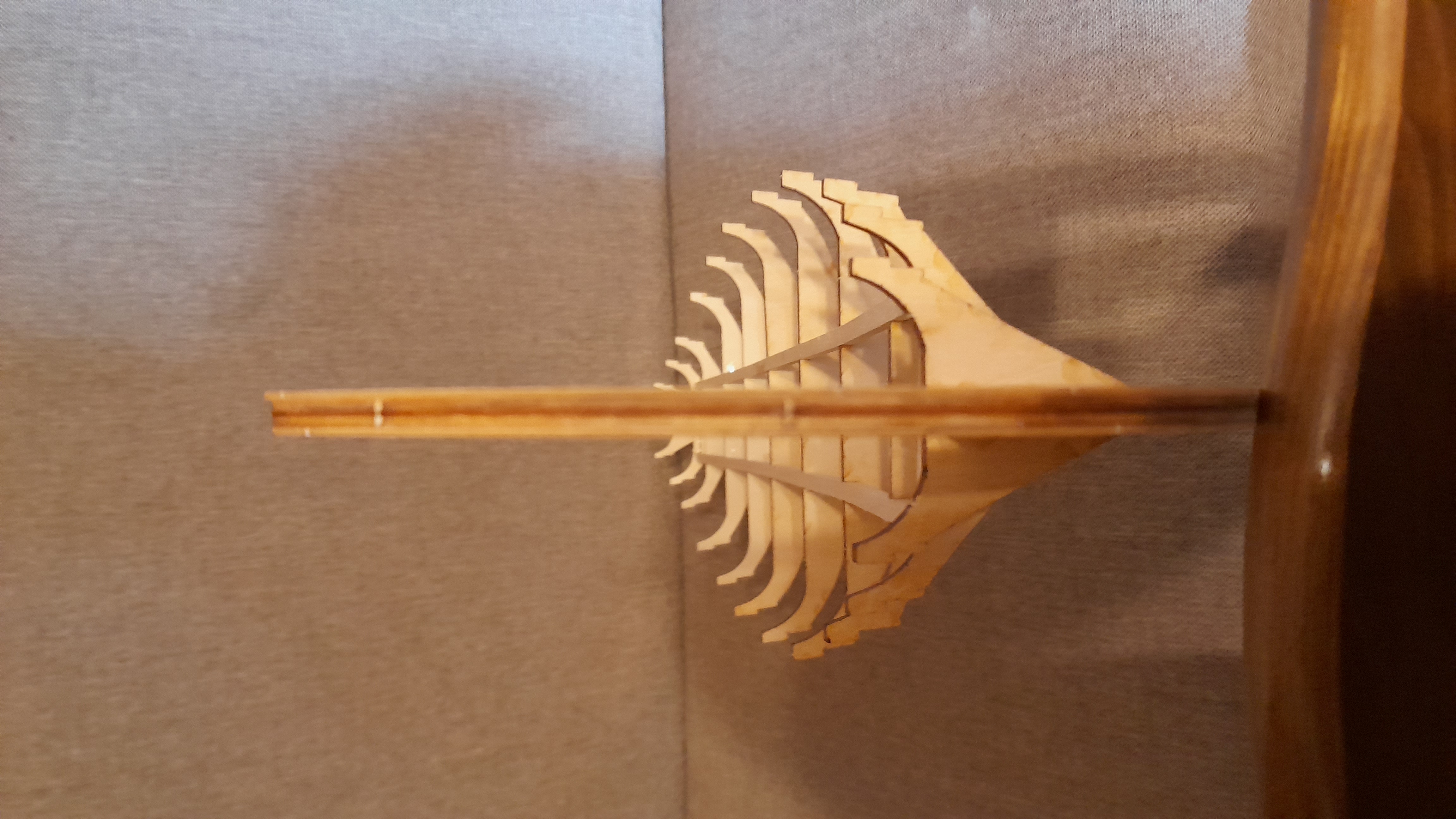 No i fajnie jest... Teraz musisz pamietac, by delikatnie i precyzyjnie zeszlifowac krawedzie wszystkich wreg (grodzi), szczegolnie te na dziobie i rufie tak, by kazda z planek polozona na szkielecie kadluba, przylegala do nich (grodzi) na calej ich grubosci - patrz zalaczona fotka.