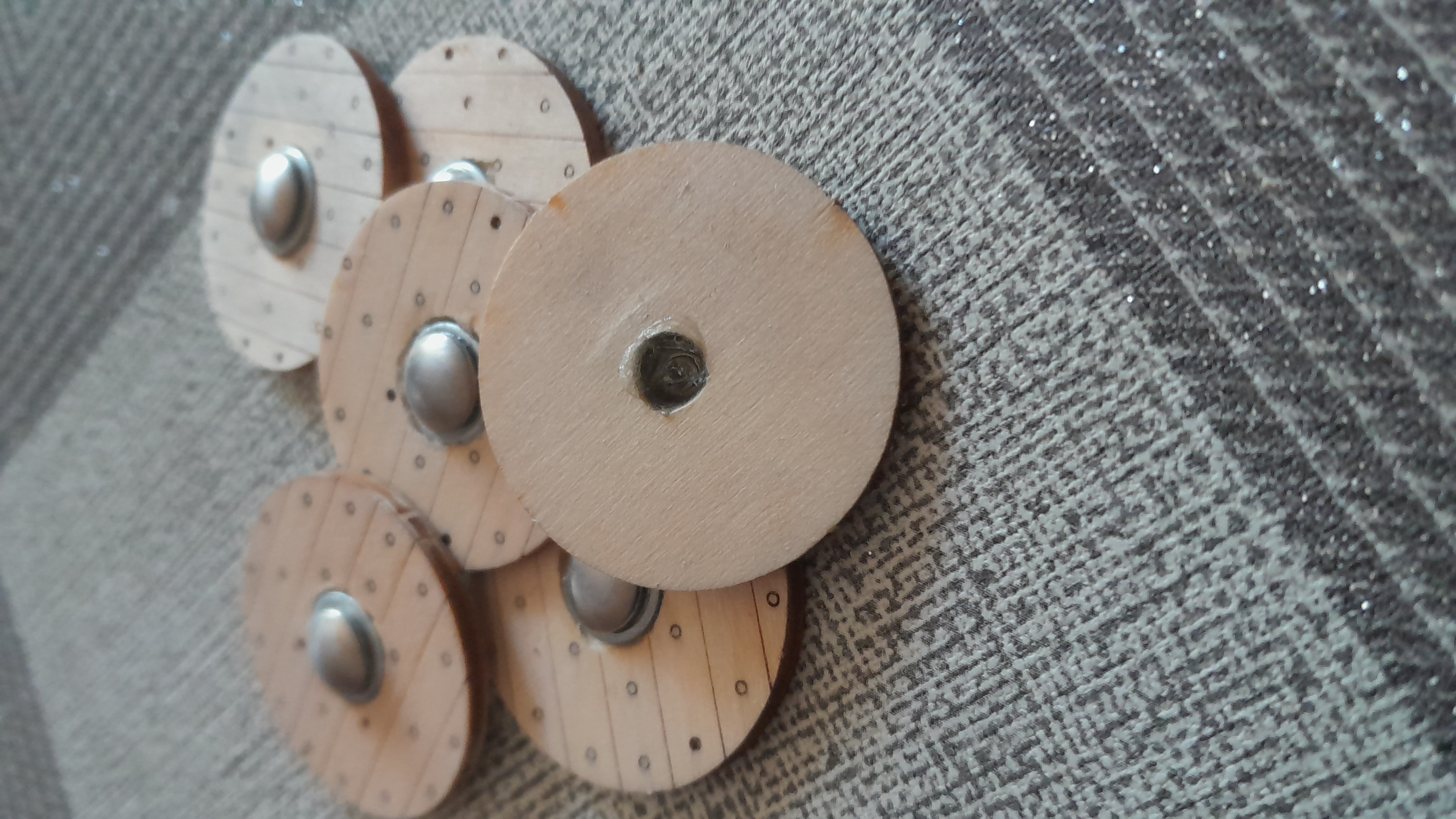 mamy osądzona na miejscu stalowa podkładkę i teraz doklejam do niej łeb od stalowej pinezki tapicerskiej, z której uprzednio zeszlifowałem niklowanie. Zapomniałem dodać, ze podkładka też jest obdarta z powłok ochronnych. dzięki temu z czasem obydwie pociemnieją. łeb pinezki delikatnie przyłapałem za każdym razem dosłownie na pól kropli gęstego cyjanoakrylu, a następnie od drugiej strony wpuściłem w otwór solidna krople tego samego kleju i psiknąłem aktywatorem co spowodowało ze łeb pinezki związał się z tarczą na wieki. Niczego się tu już nie da skorygować... Potem z tyłu tarczy dodałem imacz z cieniutkiej listewki spiłowanej na końcach i całość wrzuciłem do naczynia z czarna bejca rustykalną. Po wyjęciu (moczyły się kilkanaście minut) i wyschnięciu wrzuciłem je do foliowego woreczka i pogrzechotałem nimi. Potem dorzuciłem kilka ostrych kamieni (takich żwirków nie za dużych)i proces powtórzyłem energiczniej. chodziło o dodanie uszkodzeń do tarcz. Następnie obustronna polerka włókniną 1500, przy czym od strony lica delikatnie bo ta strona była malowana a od strony imacza mocna polerka nawet z przetarciem bejcowania bo ta strona się lubi ścierać od noszenia tarczy na plecach