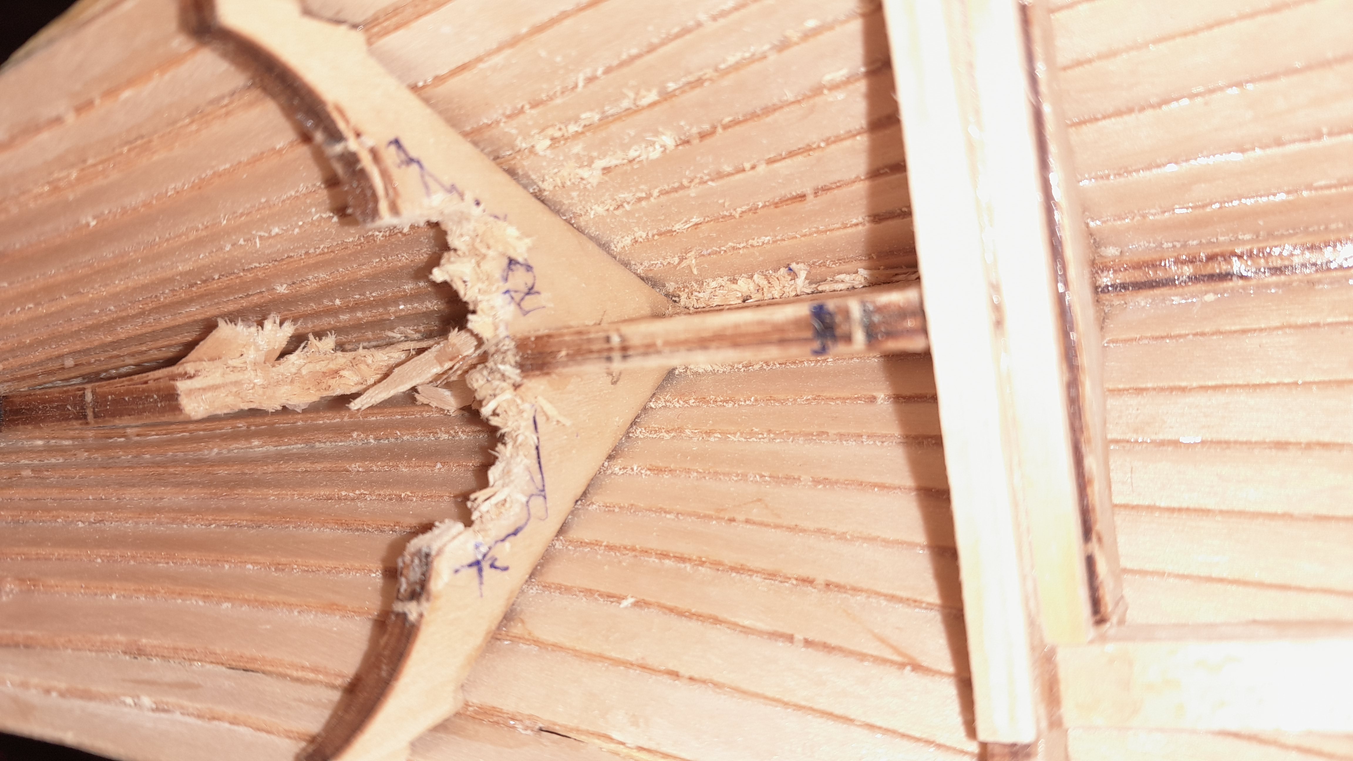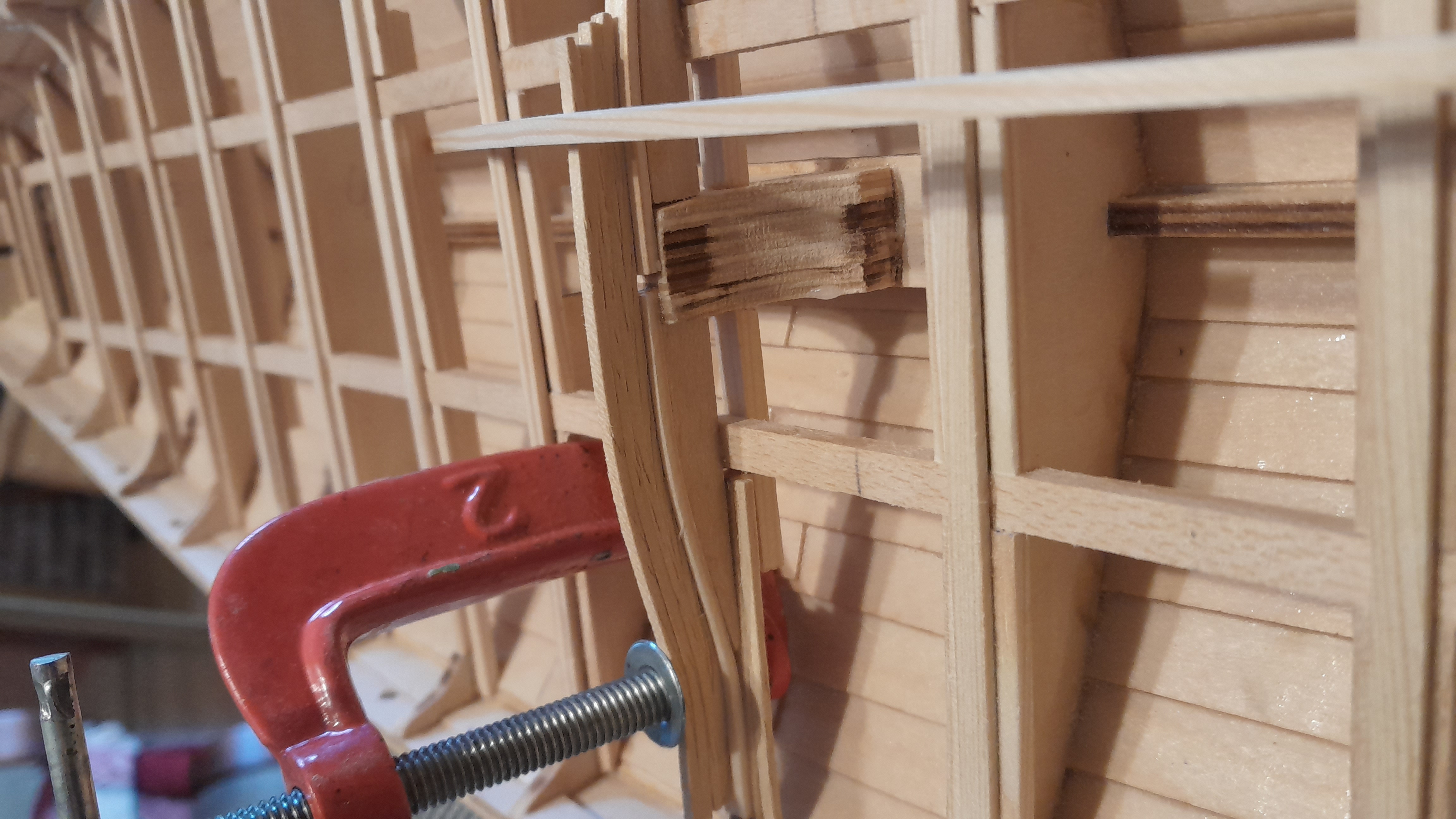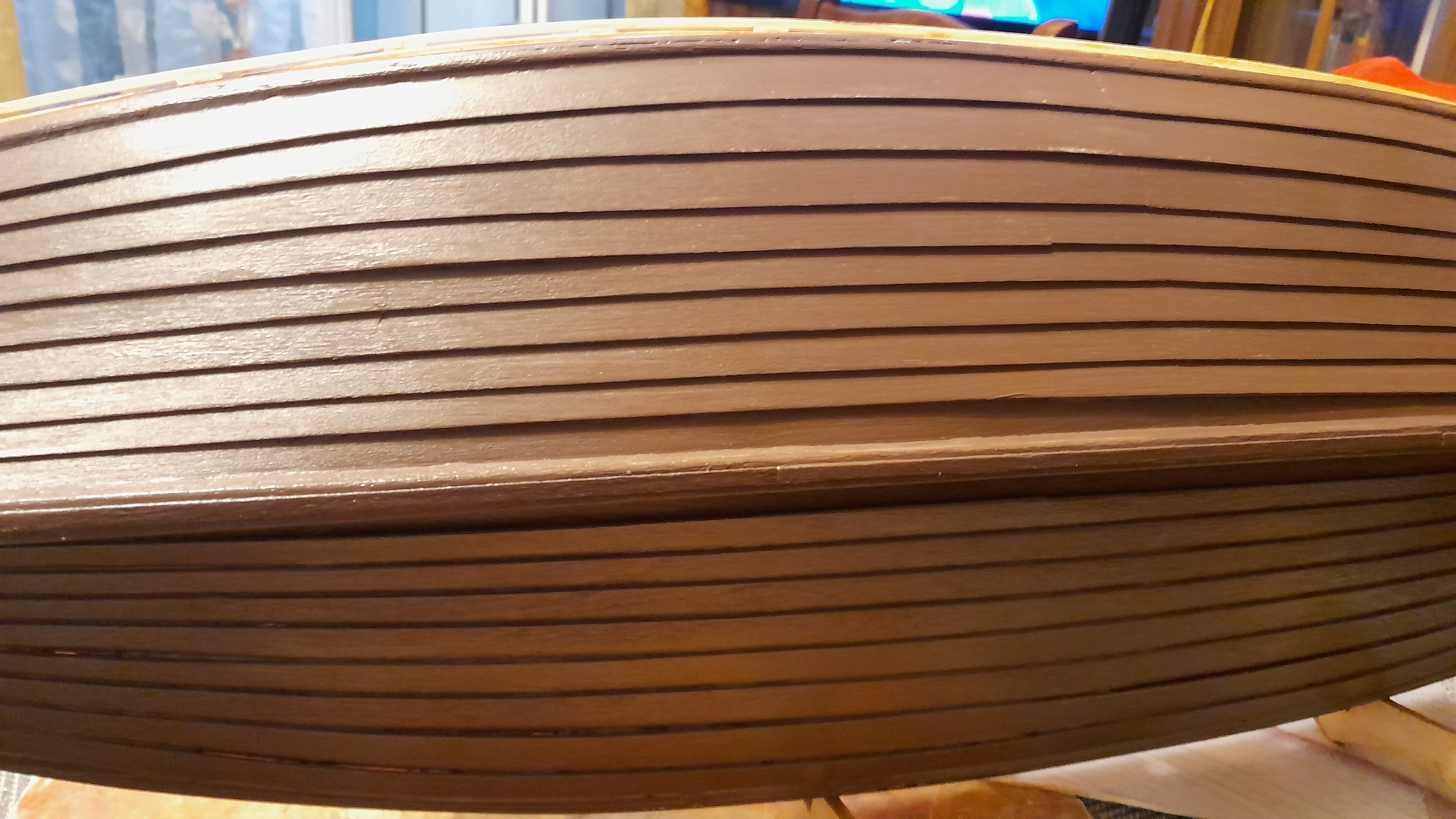 A stan obecny na fotkach poniżej. Krawędzie (jak np dziobnica, wręgi itp) będą oklejane. To co błyszczy wewnątrz kadłuba to soudal, ale jest on tylko poniżej linii pokładu. Dzięki zabiegowi wymalowania wnętrza klejem kadłub stal się bardzo wytrzymały. Całość będzie malowana ale nie bejcami. Albo akryle albo bardzo rzadkie oleje, tak aby "drewno" bardziej nasiąkło niż się pokryło. No i będzie starzony... mam nadzieję przynajmniej taką...