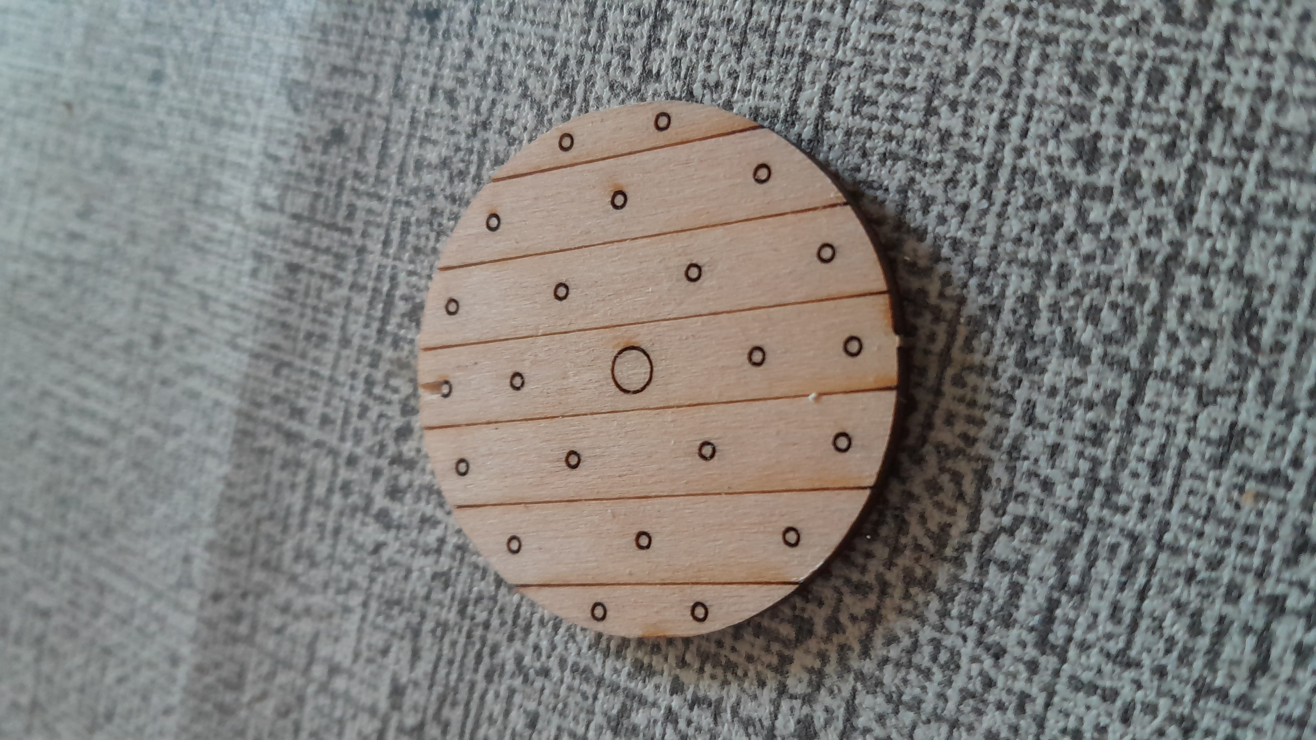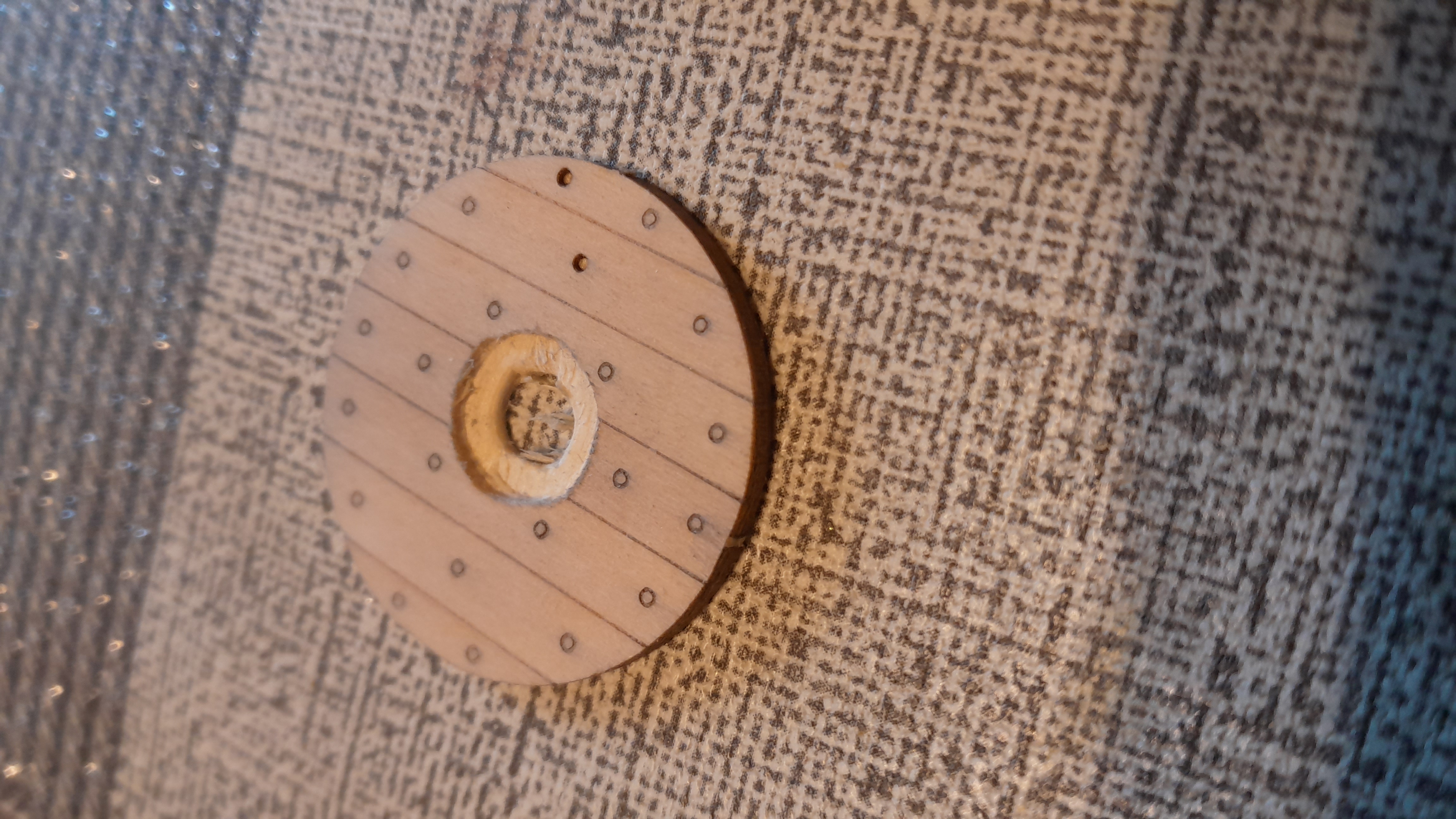 Słów kilka o malowaniu. patrze czasem na modele łodzi wikińskich z malowanymi w godła tarczami i niestety często układ tych malunków jest zły (!) Tarcza ma taką konstrukcje ze gdy trzymamy ją za imacz to jej deski przebiegają równolegle do ziemi (kąt prosty z imaczem tworzą). Więc ewentualne znaki na tarczy są malowane w poprzek desek. Mocując tarczę na burcie obracamy ja najczęściej o 90 stopni tak aby imacz był poziomo. W ten sposób zamocowana tarcza ma godła obrócone o 90 stopni czyli leza one jakby na boku a nie tak jak byśmy tarcze trzymali. Niby drobiazg ale warto o nim pamiętać