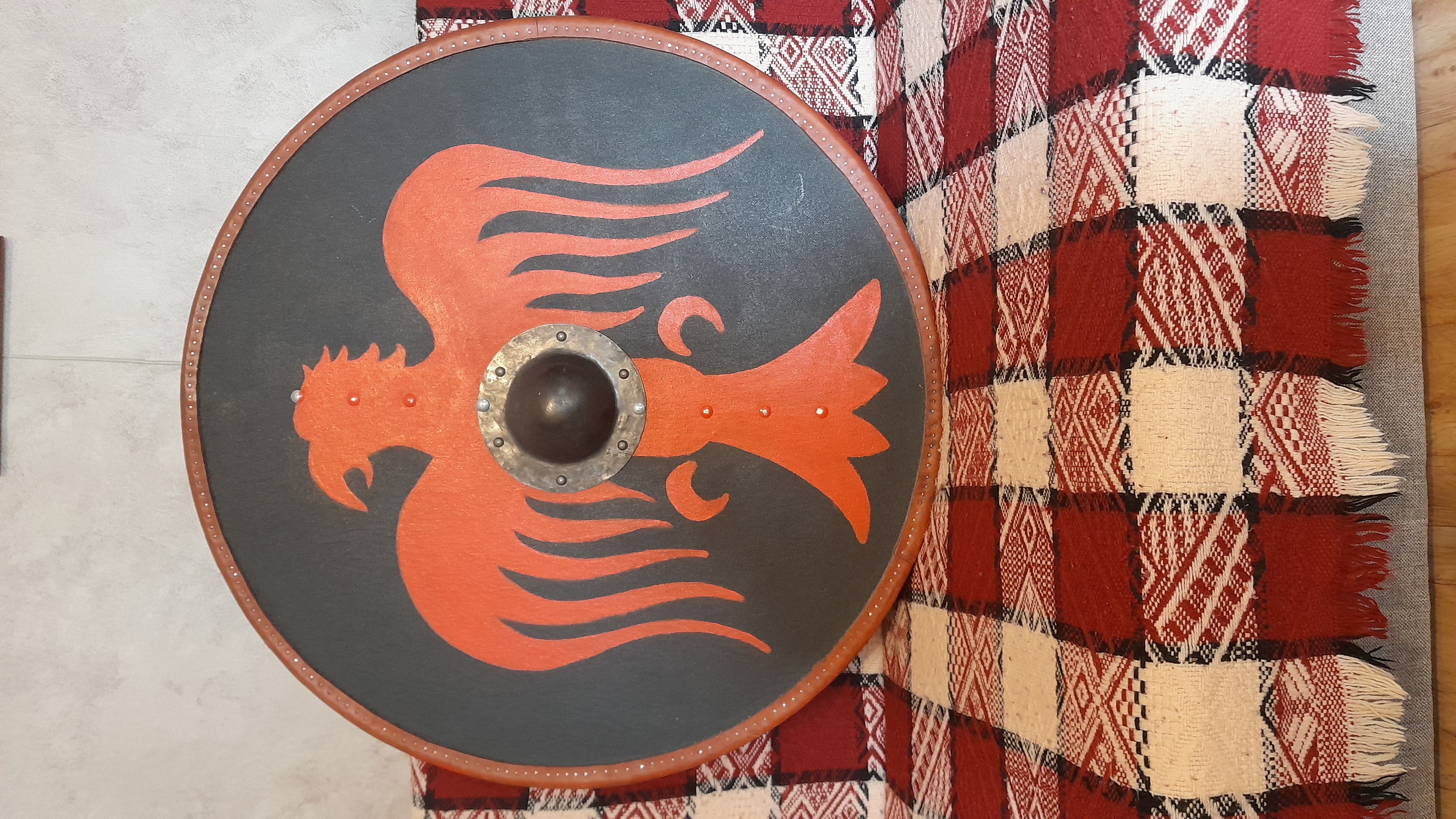 - Tak wygląda moja tarcza. Średnica 85 cm, grubość 1 cm, pas skórzany 2 mm utwardzany czyli gotowany w wosku. umbo stalowe o średnicy 18 cm. z tyłu imacz sosnowy. tarcza wykonana jest z desek świerkowych, oklejona na licu dwoma warstwami płótna, z tyłu jedną. Jak widać malowana... To jest taki typowy łodziowy rozmiar tarczy, choć bywały i metrowej średnicy.