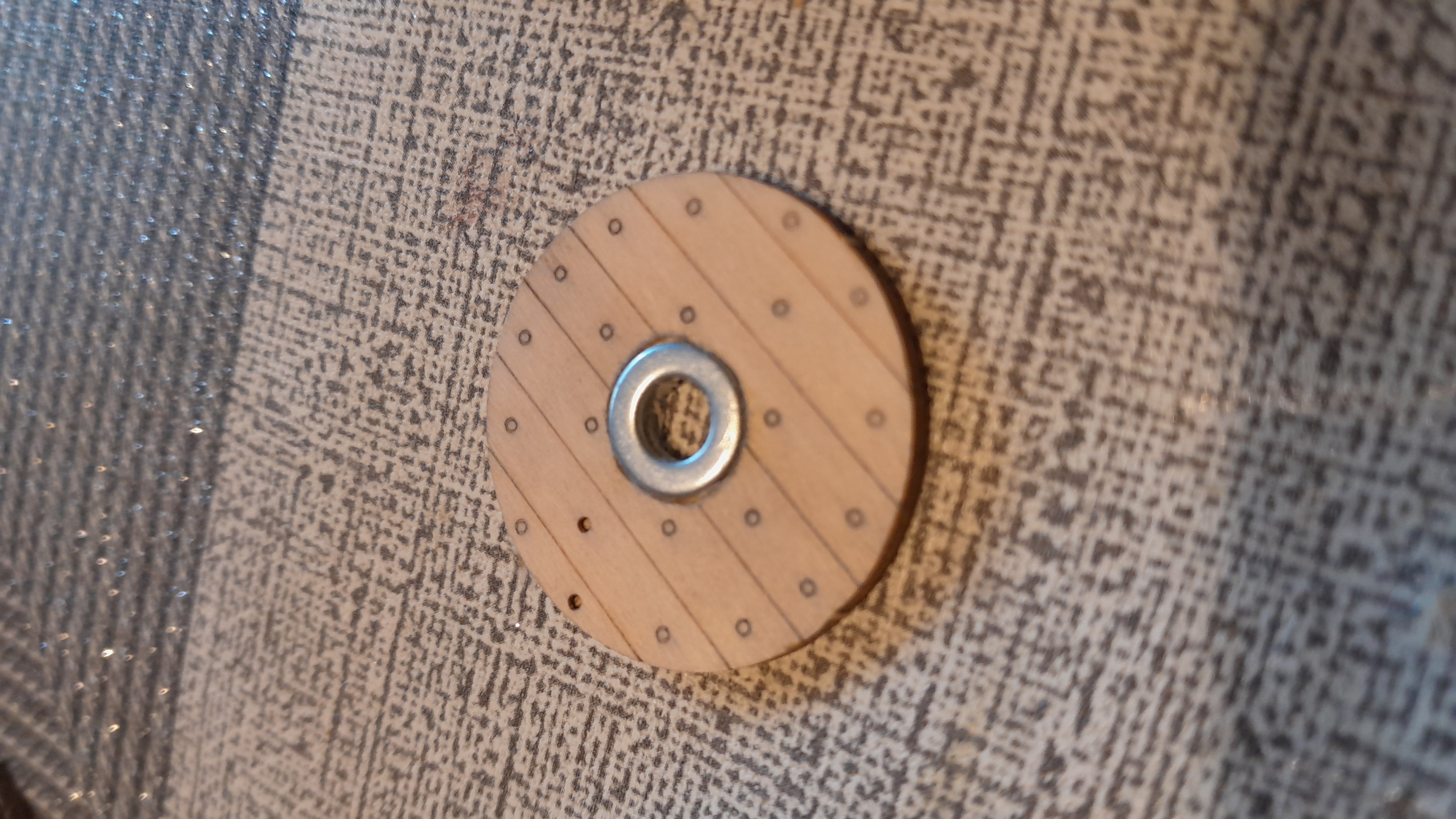 - Jak już w pocie czoła wywierciliśmy ten otworek pod kołnierz umba i udało się nie rozwalić przy tym tarczy, to na ulubiony klej -byle mocny- wklejamy w to miejsce podkładkę o średnicy +/- 9mm. Da nam to umbo o średnicy prawie 25 cm, ale takie kołnierze tez bywały, wiec nie jest źle. chodzi o to, żeby podkładka nie wystawała głupio nad blat tarczy... Efekt uboczny w/w operacji jest taki ze mamy śliczny otworek który z drugiej strony przysłonimy potem częściowo imaczem...