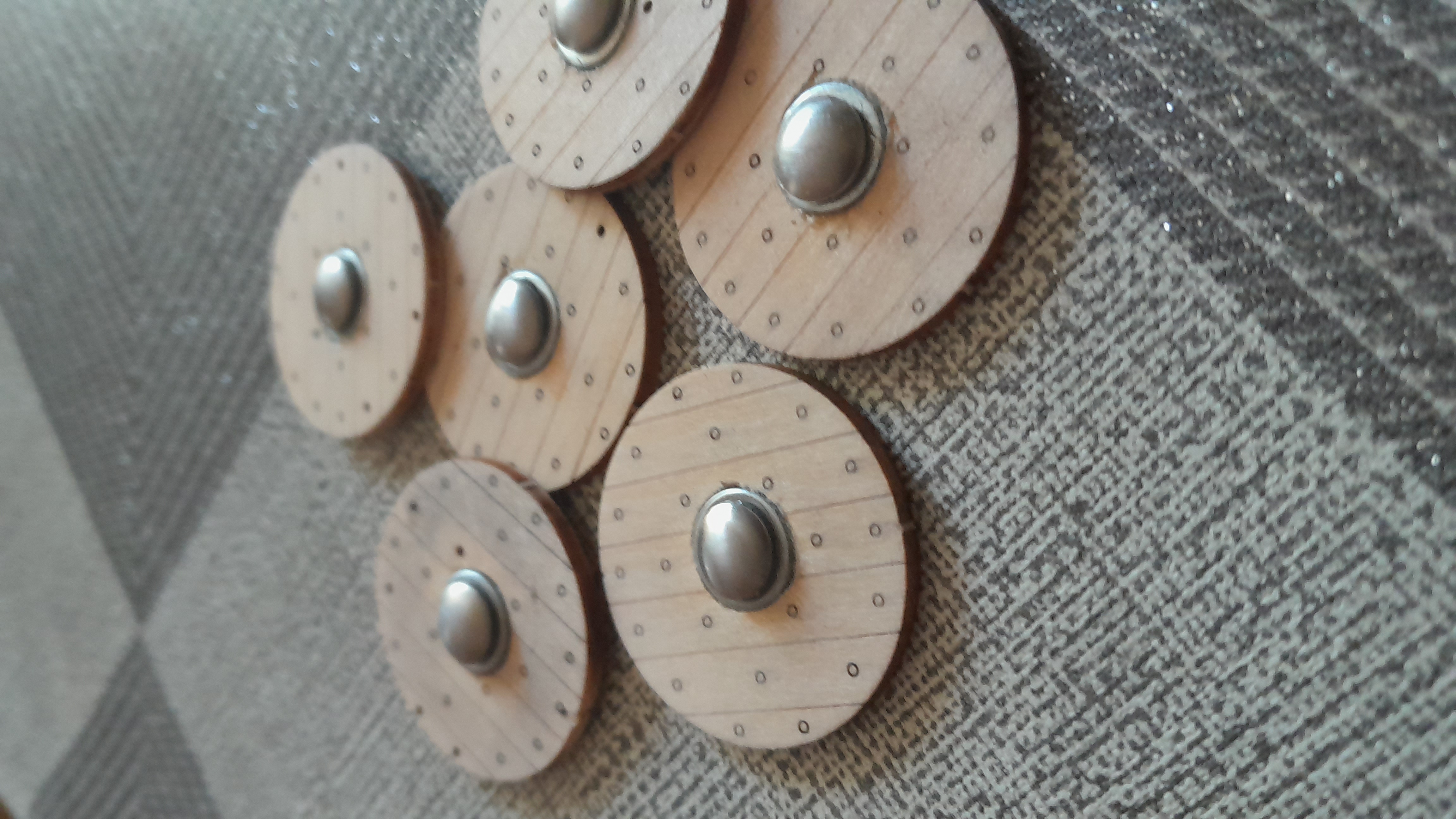 mamy osądzona na miejscu stalowa podkładkę i teraz doklejam do niej łeb od stalowej pinezki tapicerskiej, z której uprzednio zeszlifowałem niklowanie. Zapomniałem dodać, ze podkładka też jest obdarta z powłok ochronnych. dzięki temu z czasem obydwie pociemnieją. łeb pinezki delikatnie przyłapałem za każdym razem dosłownie na pól kropli gęstego cyjanoakrylu, a następnie od drugiej strony wpuściłem w otwór solidna krople tego samego kleju i psiknąłem aktywatorem co spowodowało ze łeb pinezki związał się z tarczą na wieki. Niczego się tu już nie da skorygować... Potem z tyłu tarczy dodałem imacz z cieniutkiej listewki spiłowanej na końcach i całość wrzuciłem do naczynia z czarna bejca rustykalną. Po wyjęciu (moczyły się kilkanaście minut) i wyschnięciu wrzuciłem je do foliowego woreczka i pogrzechotałem nimi. Potem dorzuciłem kilka ostrych kamieni (takich żwirków nie za dużych)i proces powtórzyłem energiczniej. chodziło o dodanie uszkodzeń do tarcz. Następnie obustronna polerka włókniną 1500, przy czym od strony lica delikatnie bo ta strona była malowana a od strony imacza mocna polerka nawet z przetarciem bejcowania bo ta strona się lubi ścierać od noszenia tarczy na plecach