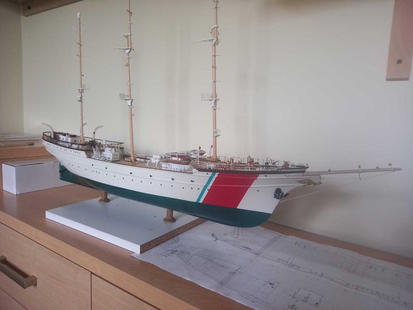 W chwili obecnej model jest w stanie jak na fotkach - wszystkie elementy są ukończone, brak jedynie montażu takielunku wraz z omasztowaniem, gdyż założenie kalkomanii z insygniami i oznacvzeniami będzie wiązało się z ponownym malowaniem burt.