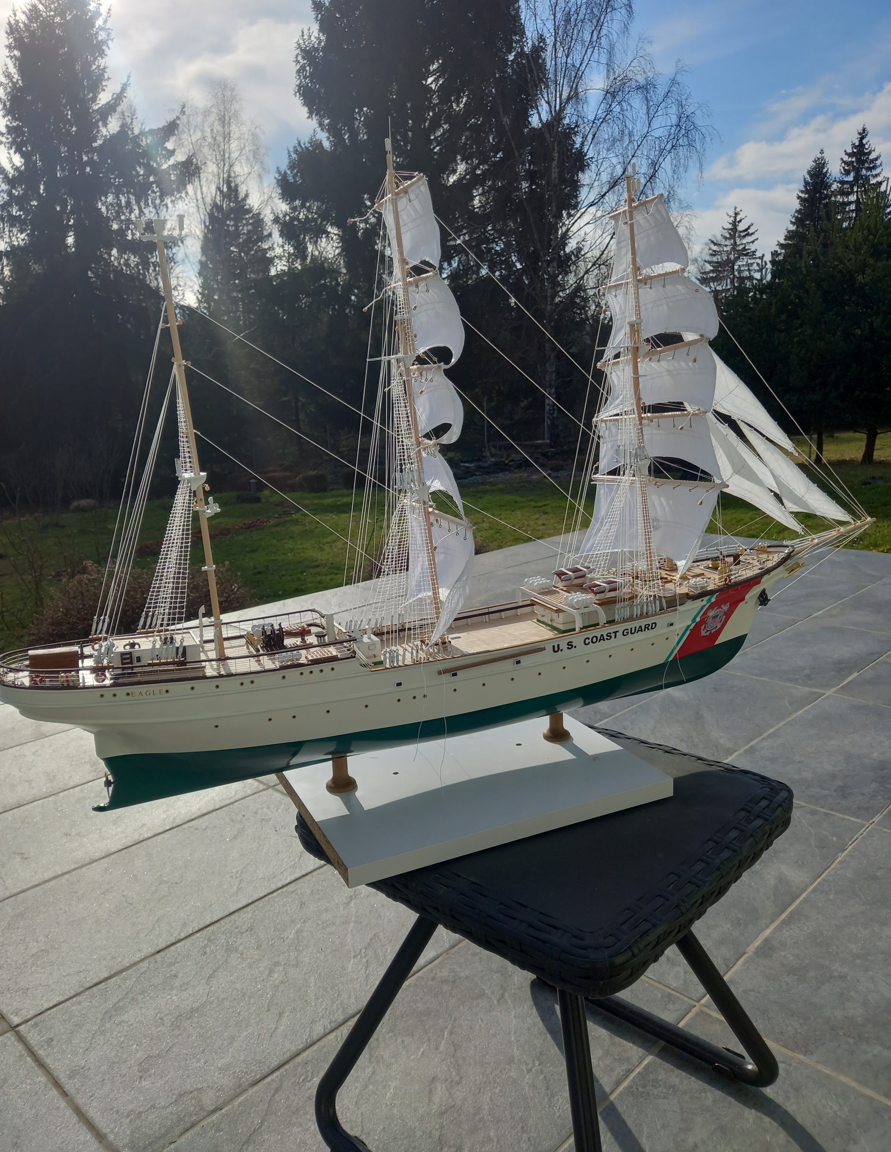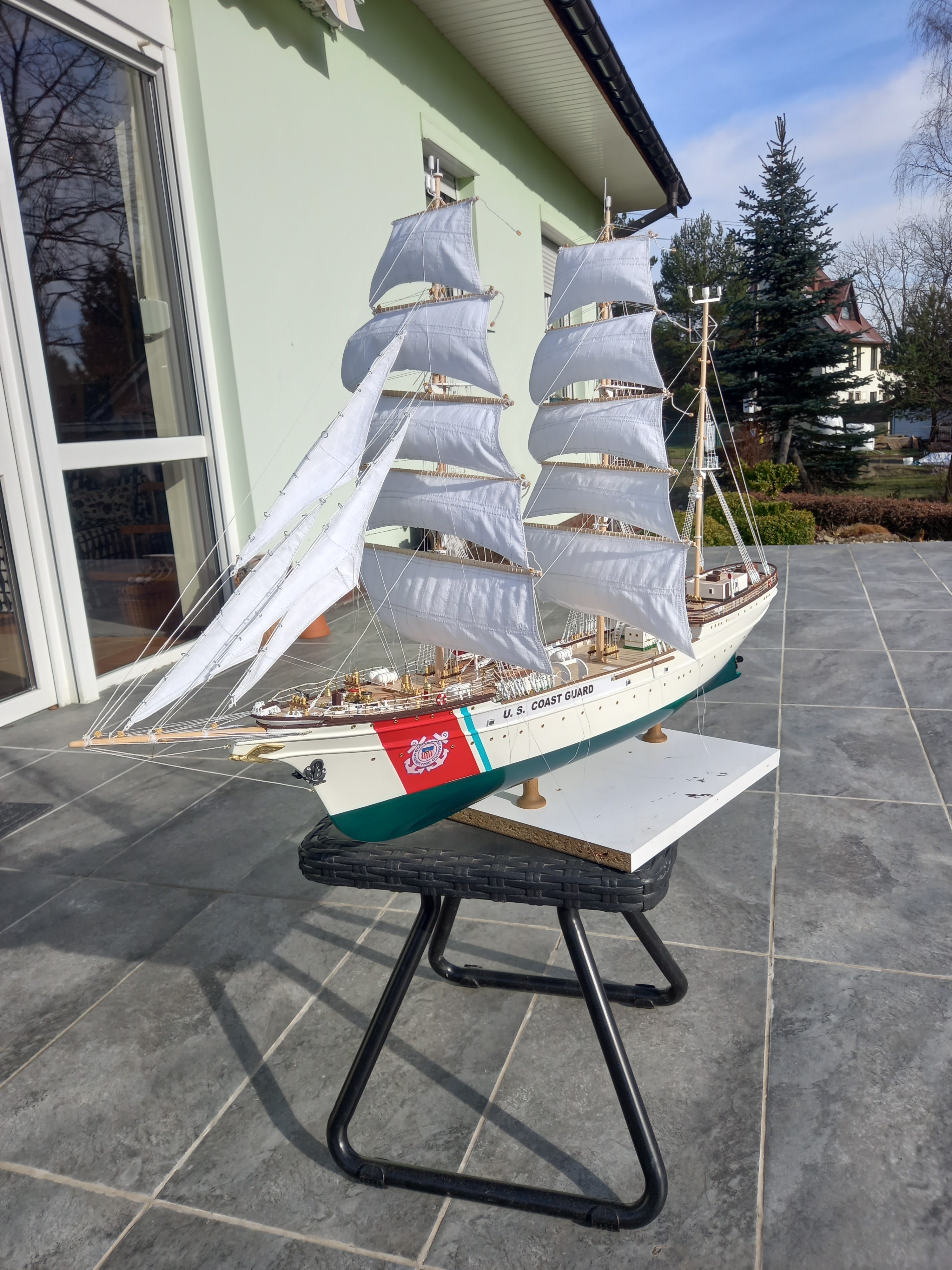 Przyjrzałem się fotografiom Twojego modelu ORŁA już z takielunkiem. Jestem wielbicielem XIX – XX wiecznych kliprów i windjammerów, mam w tym temacie sporą wiedzę i duże doświadczenie modelarskie (z braku czasu nie robię relacji na forum ale często zaglądam tu). Czuję się zatem kompetentny do paru uwag. Ogólnie model fajnie się prezentuje z uwagi na dość oryginane efekty koloryczne. Ale po przyjrzeniu się bliżej muszę zwrócić Ci jednak uwagę na dwie rzeczy. Na pierwszy rzut oka wydaje się być coś nie tak z ruchomym takielunkiem żagli rejowych. Większości lin brak (gordingów, nokgordingów, gejtaw i ściągaczy czyli dumprów), a to co widać ma dziwny przebieg – ani to gejtawy ani topenanty – tak na pewno jest na planach?. Drugim rażącym dla mnie błędem jest „przyszycie” żagli bęclami wokół rej – jak na jakimś XVII wiecznym galeonie. Bęcle powinny być wiązane do jaksztagów na rejach, perty zresztą też. Generalnie większość lin jest chyba za gruba. Oceniając Twoje umiejętności po kadłubie myślę, że spokojnie dasz radę w 1:100 zrobić jaksztagi na rejach jak i wykonać i przeprowadzić brakujące liny z góry na dół do nagielbanków przez otwory w platformach marsów i przeloty na wantach