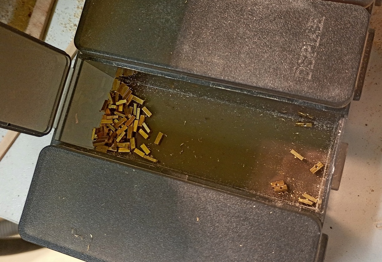 Długo przymierzałem się do wykonania knag. Po kilku nieudanych próbach z drewnem, doszedłem do wniosku, że w tej skali, na wykonanie około setki knag, mosiądz będzie lepszym rozwiązaniem. Pocięte na długość 4mm paski o przekroju 1,5 x 1,5mm, przewierciłem.