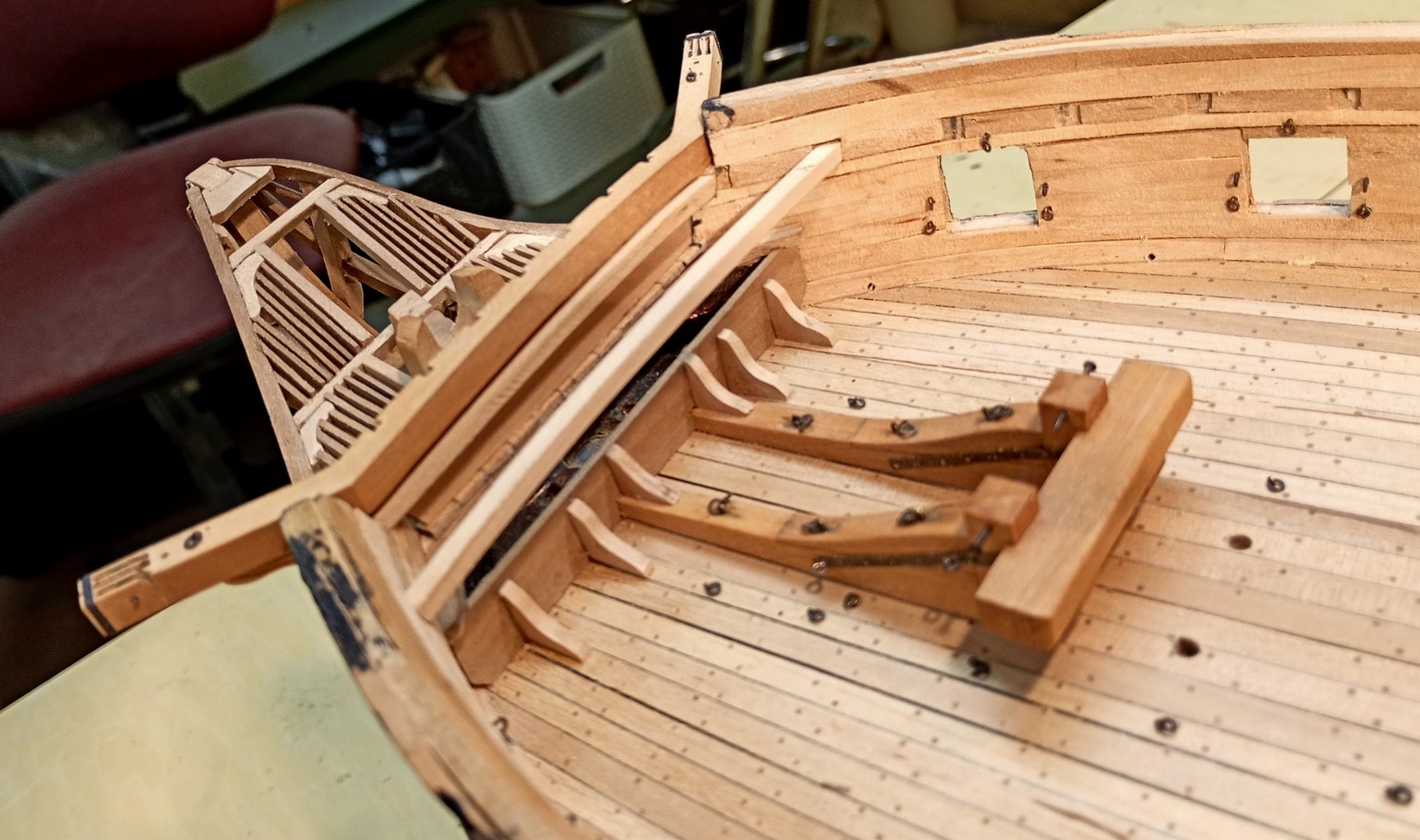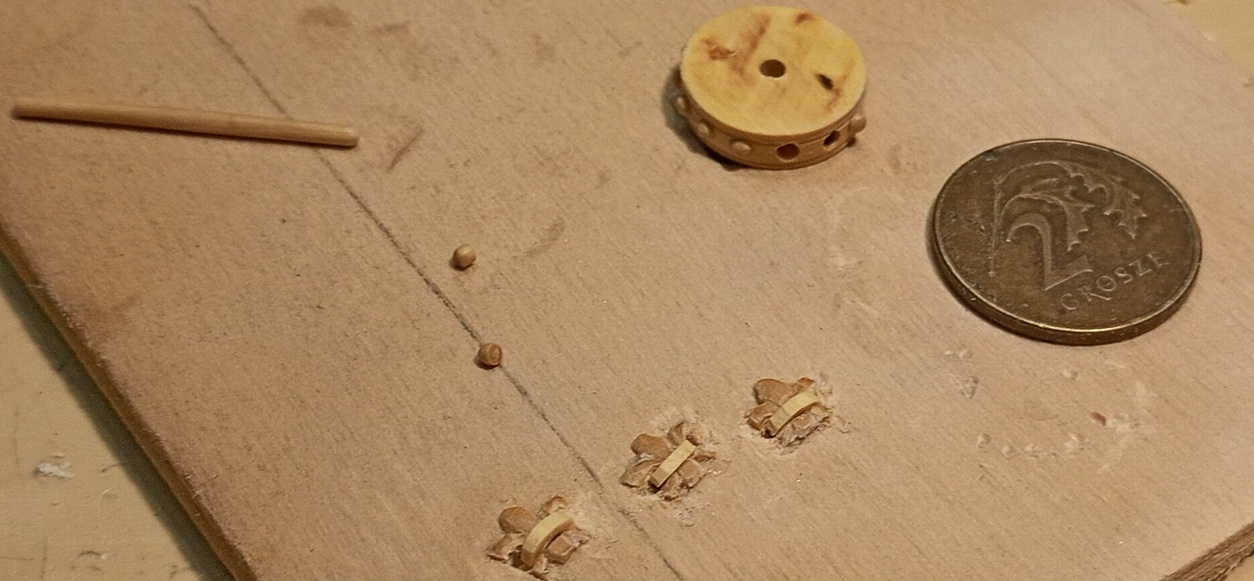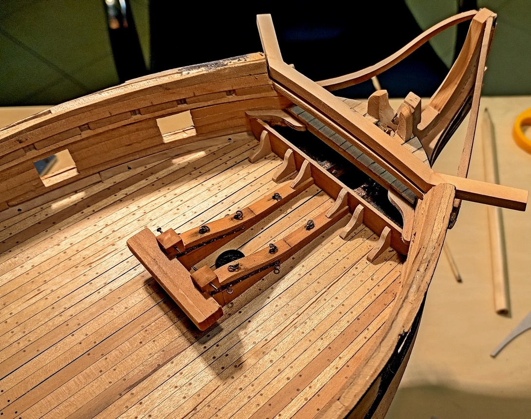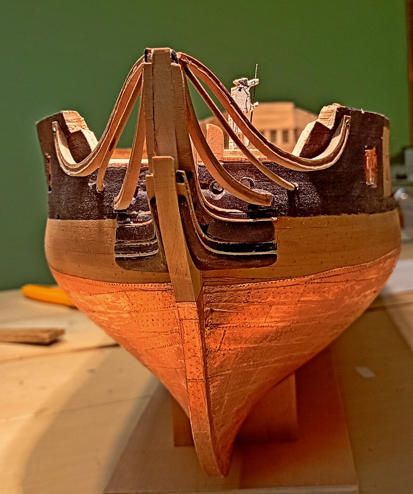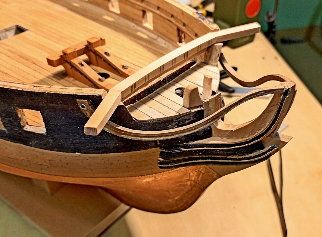 To chyba najtrudniejsza część modelarstwa szkutniczego. W tym przypadku, kluczowe znaczenie ma właściwe zaplanowanie kolejności prac. Dlatego musiałem już teraz wykonać pachoł kotwiczny i kotbelki, aby móc odpowiednio ukształtować przednią część nadburci.