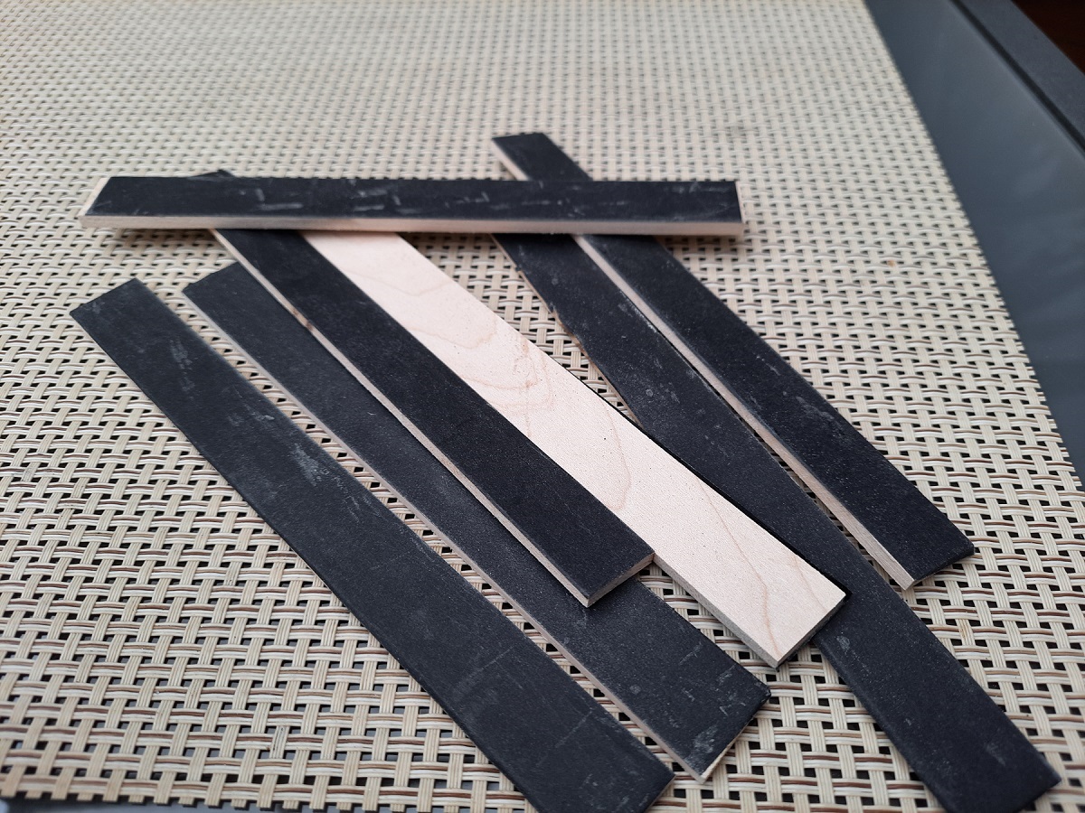 Sprawa listewek wygląda następująco. Deseczkę przygotowaną na ścierarce na grubość 6,5 mm rozcinam najpierw tarczą supertcut proxxona na grubość 1,5 mm a następnie tarczą z widią pocieniam do grubości 1,3 mm. Tarcza atakuje tylko jedną stroną i listewki wychodzą gładkie, prawie błyszczące. Następną operacją jest wykonanie wpustu tą samą tarczą(brzeszczotem) lecz wysuniętą jedynie na 1,5 mm ponad stół i pochyloną pod kątem 20 stopni. Osłona otworu z którego wynurza się piła oczywiście musi być dopasowana do tego kąta. Samo zwężanie planek wykonuję na imadle do planek opisanym w dziale NARZĘDZIA naaszej Kogi.
