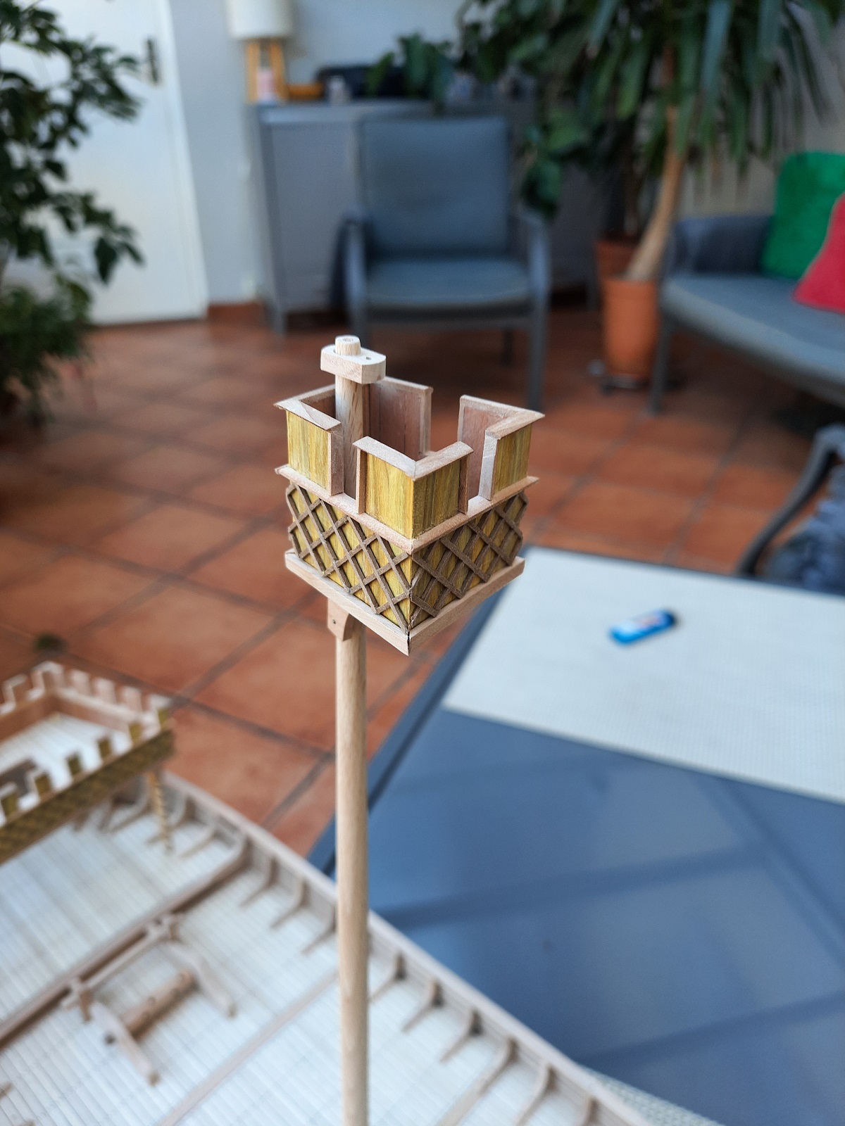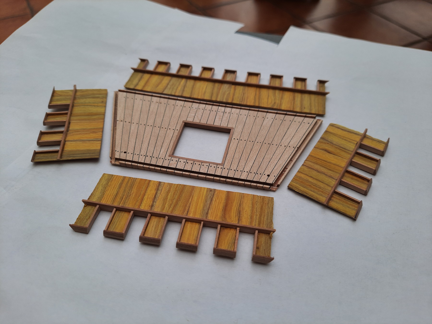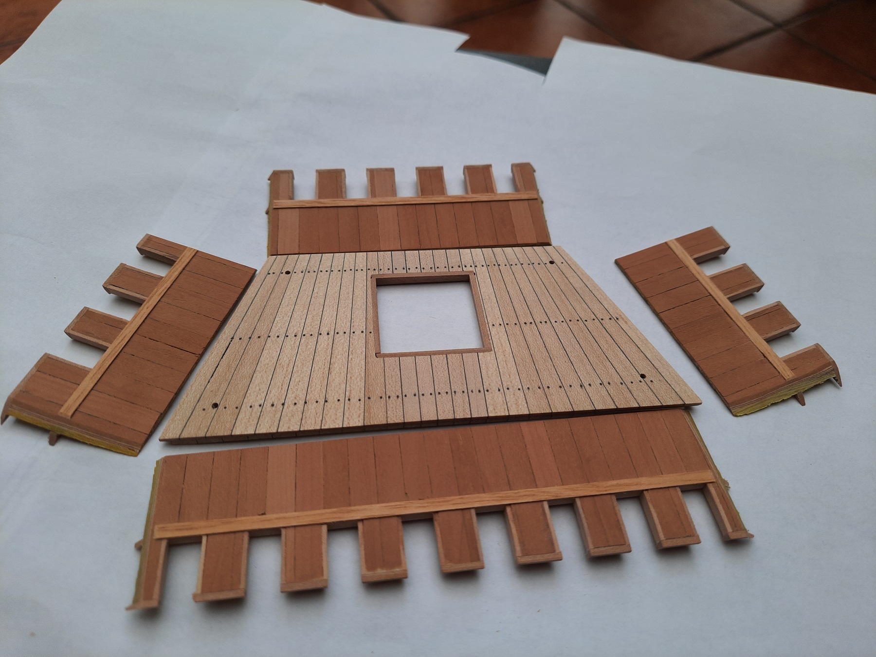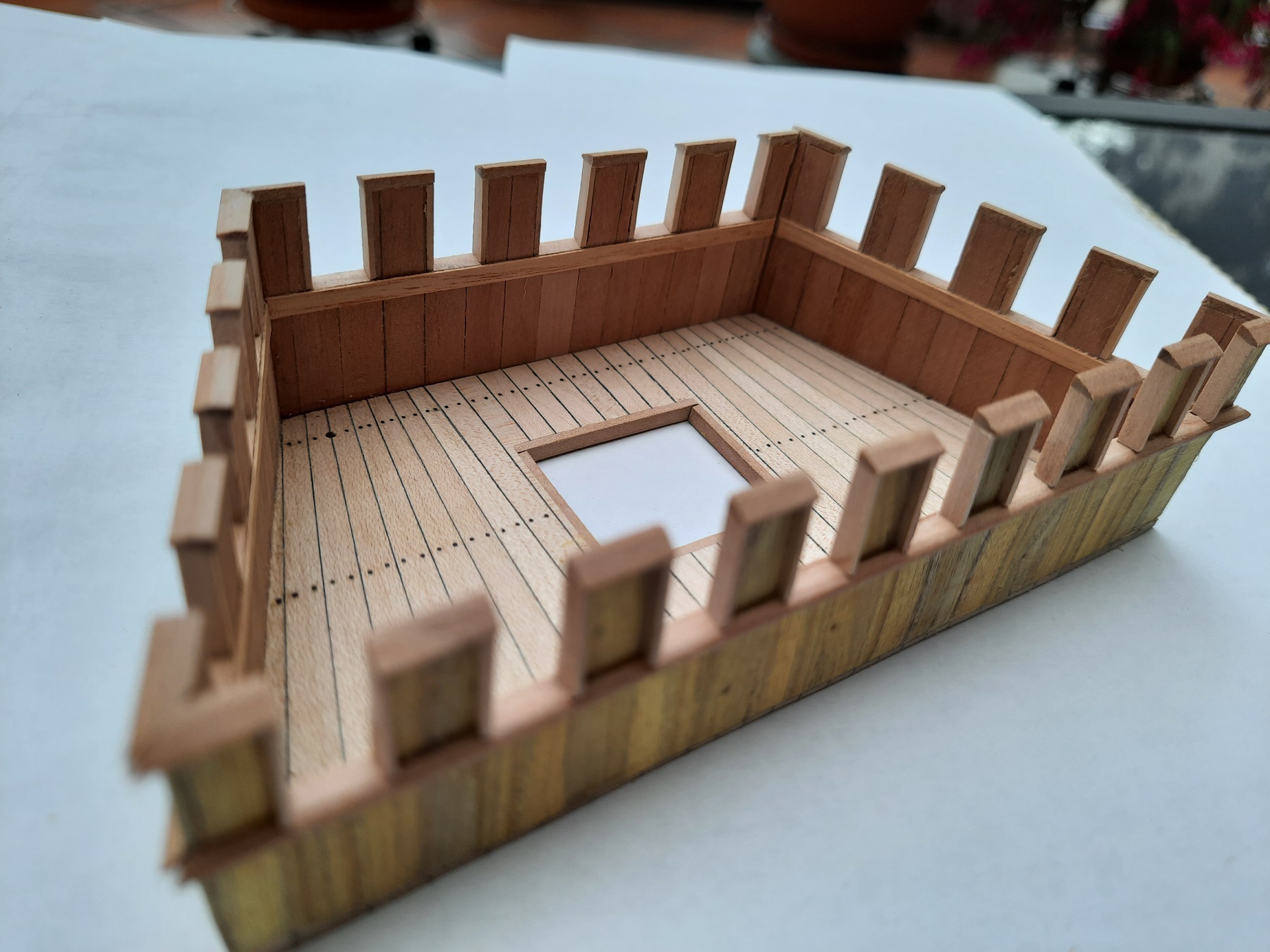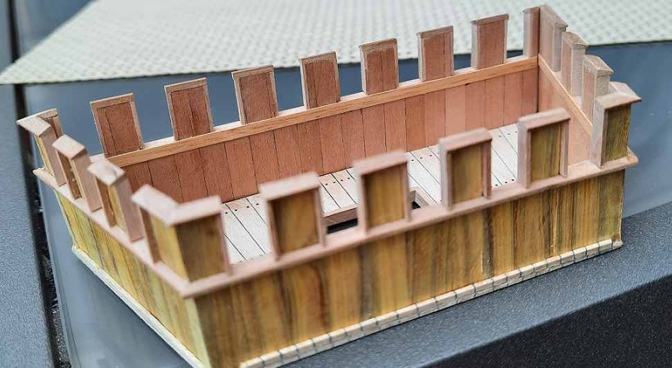 Trochę Ataman mnie zmobilizował i powstały kasztele. Okrasa łamie przepisy to ja sobie też pozwoliłem i złamałem zasadę używania drewna bez słojowego . To zielono-żółte to perukowiec. Kasztele trzeba jeszcze ozdobić i umieścić na pokładzie. Blanki są żywcem zerżnięte ze średniowiecznych murów. Pozdrawiam