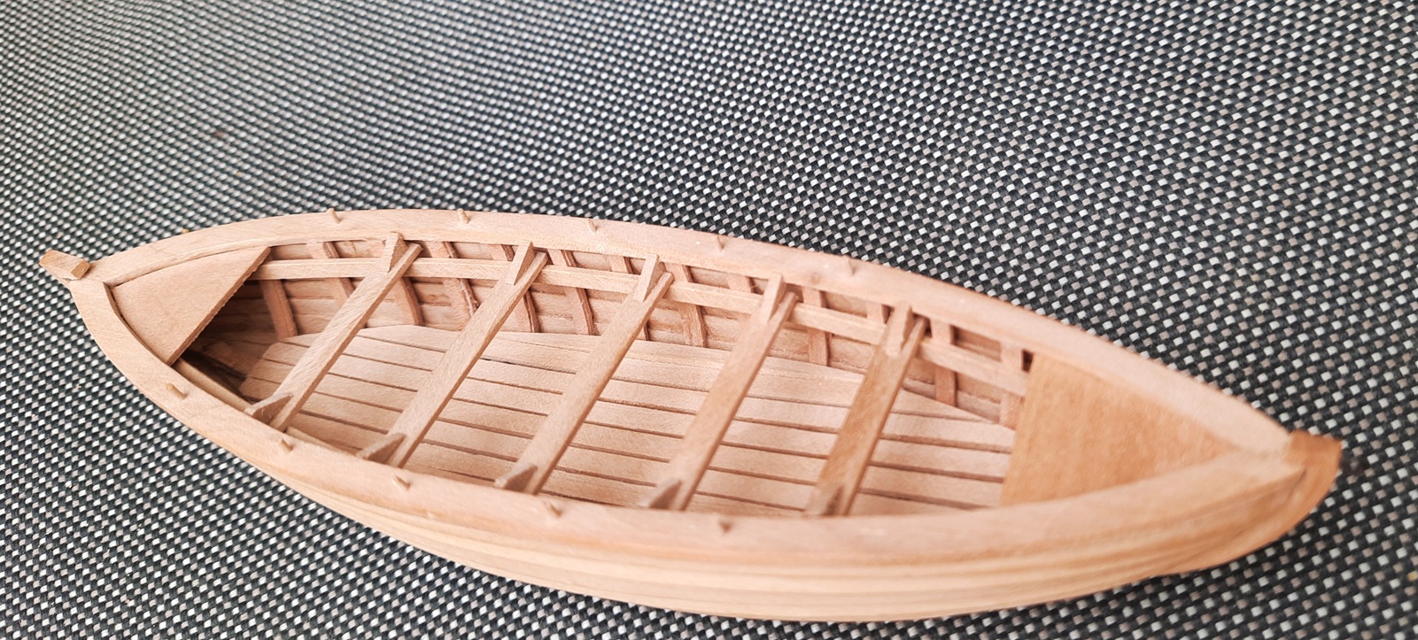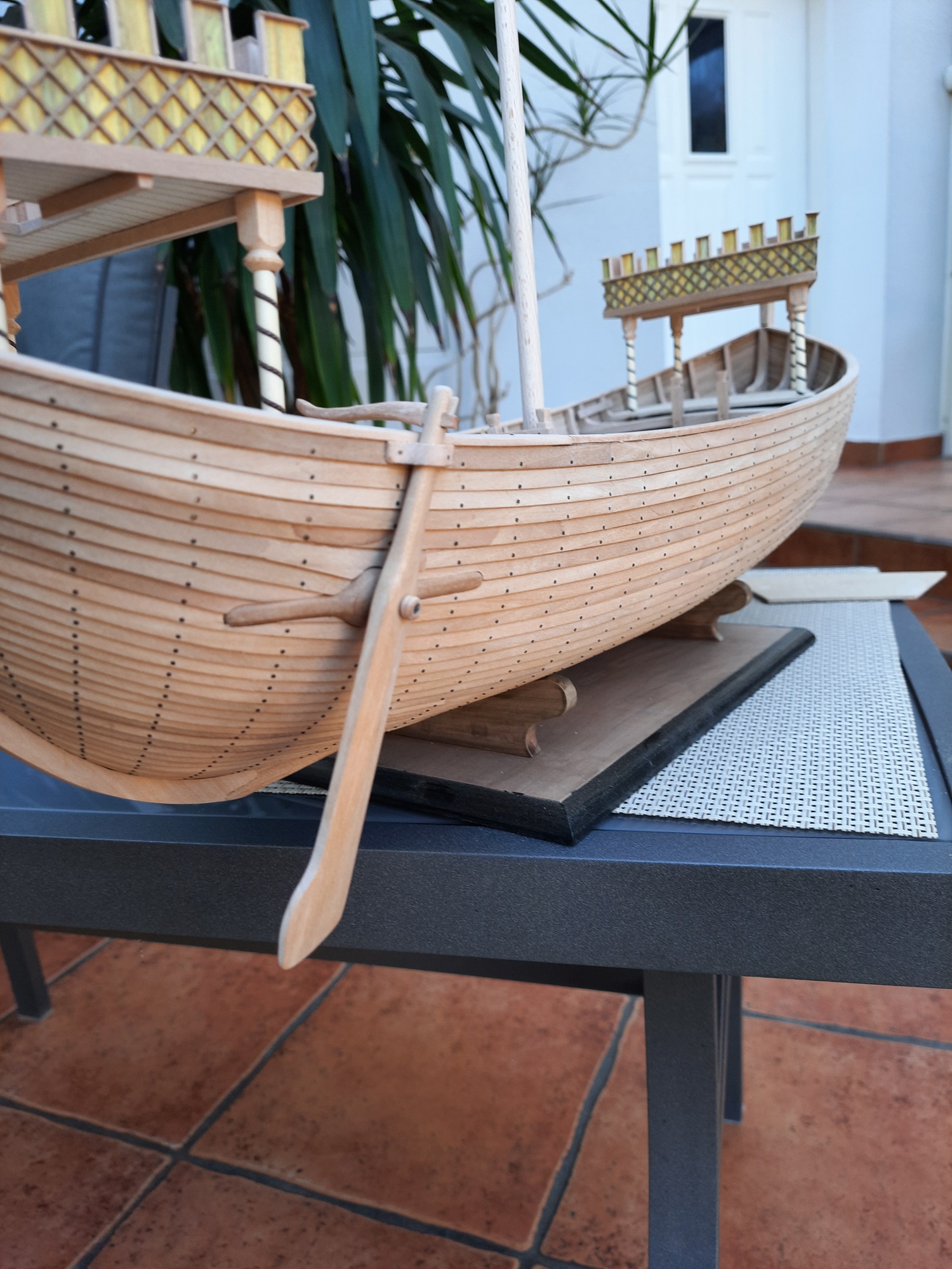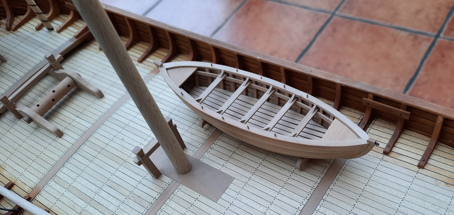 Wiosna to nie najlepszy czas na modelowanie, ale w chłodne i mokre dni udało się coś zrobić. Model dostał szalupę na 5 par wioseł. Pierwsze szalupy układano na pokładzie do góry dnem, dopiero potem ustawiano je stępką do dołu. Bardziej efektowna wydaje mi się ten późniejszy sposób ale to oceńcie sami.