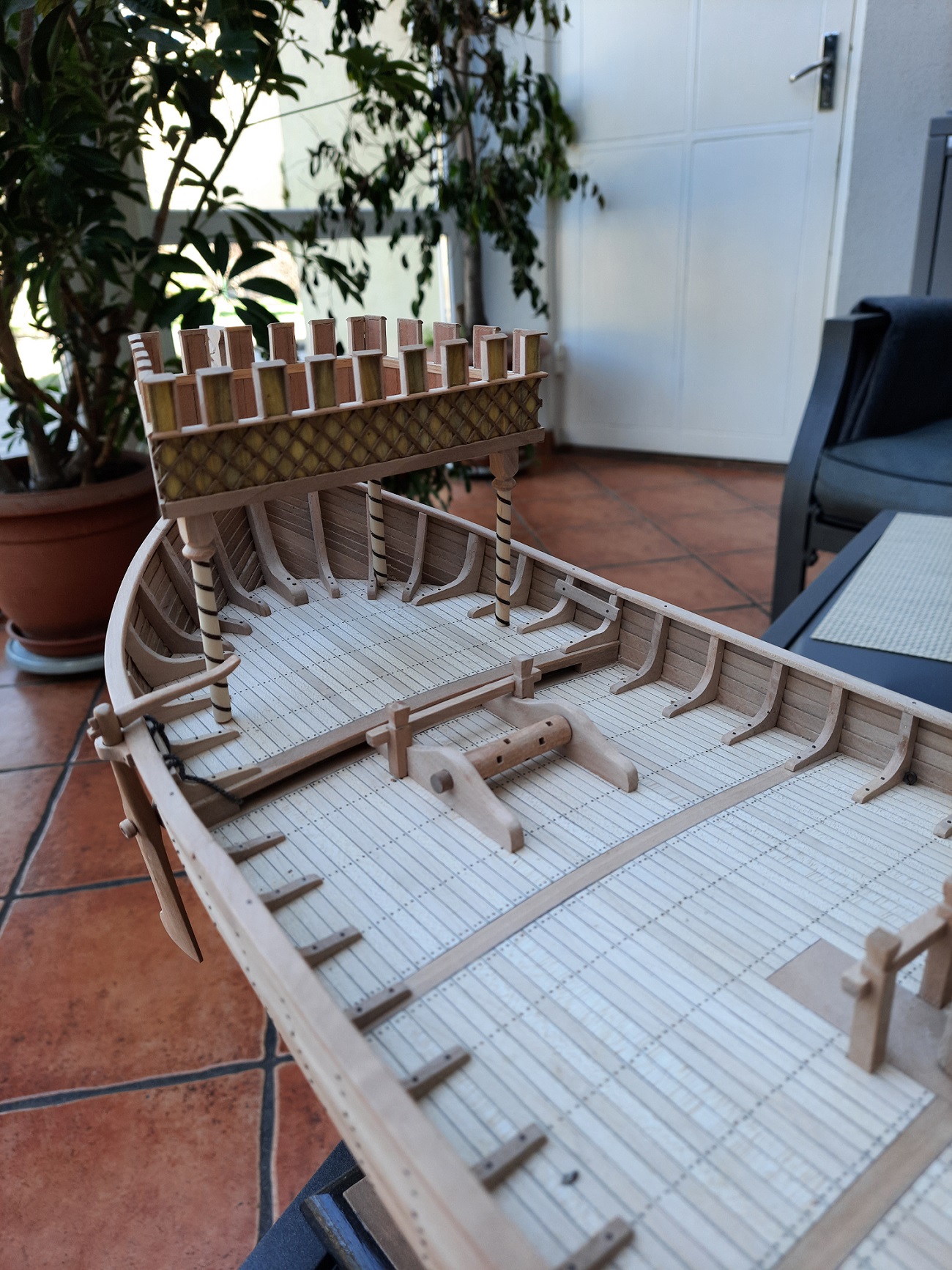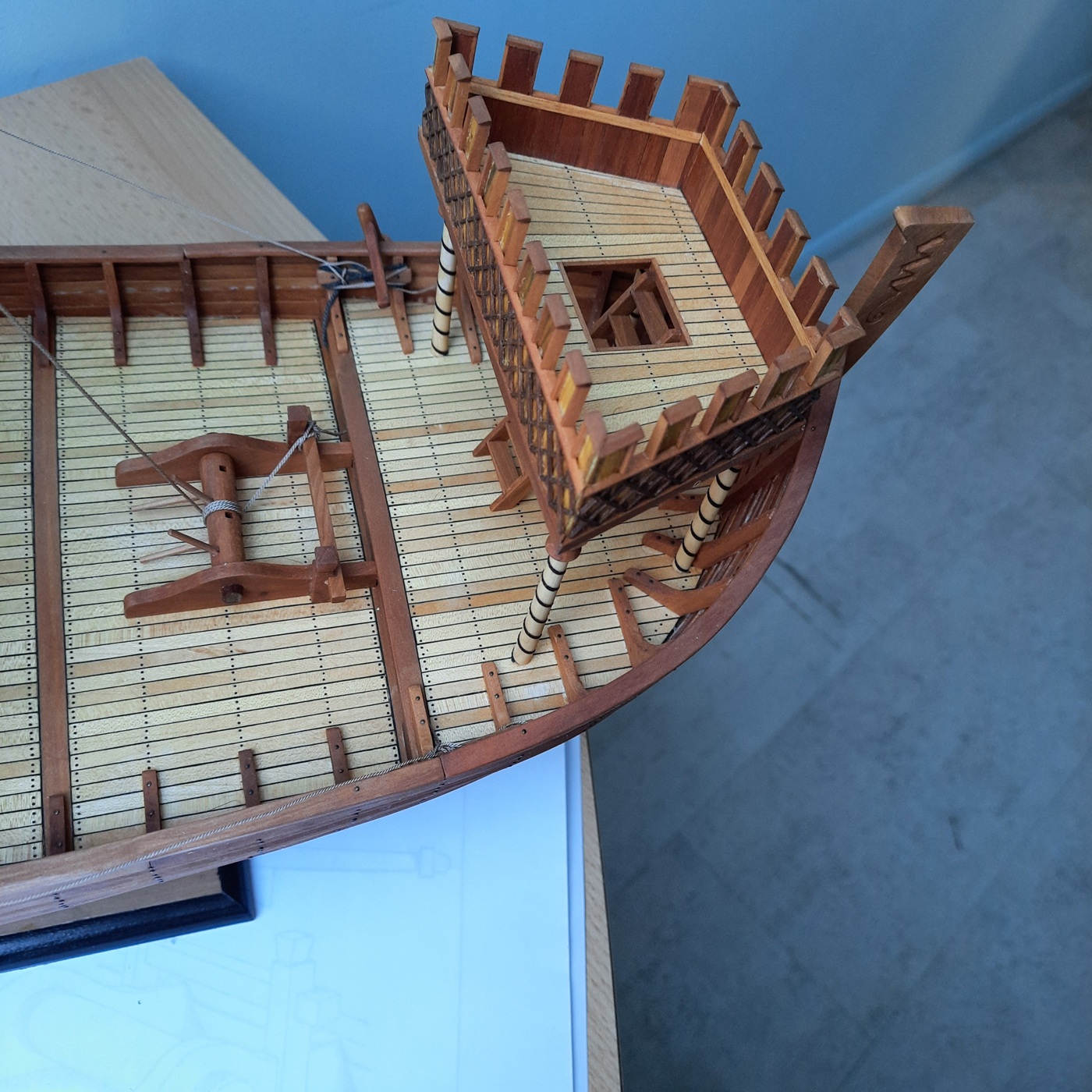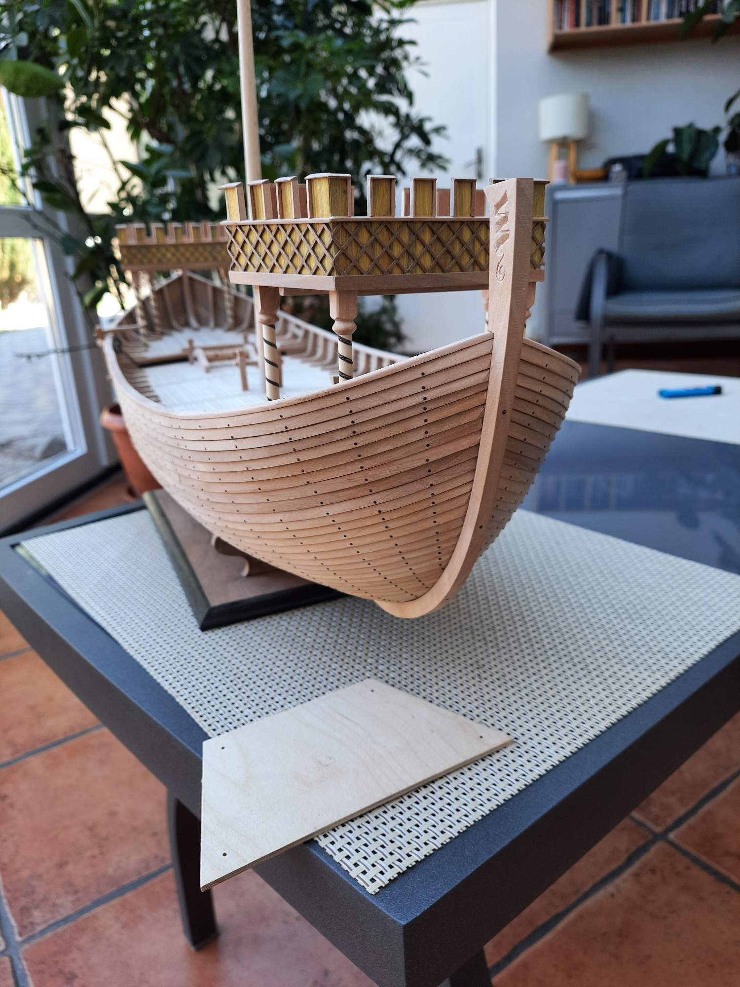 Nef dostał ster wiosłowy tylko na prawej burcie, kołowrót i pachoły do mocowania lin. Kasztele i maszt z bocianim gniazdem są połażone na "sucho" . Brak mi wiedzy co działo się pod pokładem czy były jakieś ładownie czy też pomieszczenia na inne funkcje. Moje wyliczenia biorące pod uwagę jedynie skalę wskazują że między stępką a pokładnikami na śródokręciu było 2,35 m wysokości a więc nawet gdyby wsypali tam 0,5 m balastu to pozostaje jeszcze 1,75 m przestrzeni do zagospodarowania. Jak na razie jestem za wykonaniem jakiejś pokrywy ładowni. U wikingów nawet przy budowie repliki w temacie użyteczności przestrzeni pod pokładem panuje cisza. Dla ilustracji postępu pare fotek.