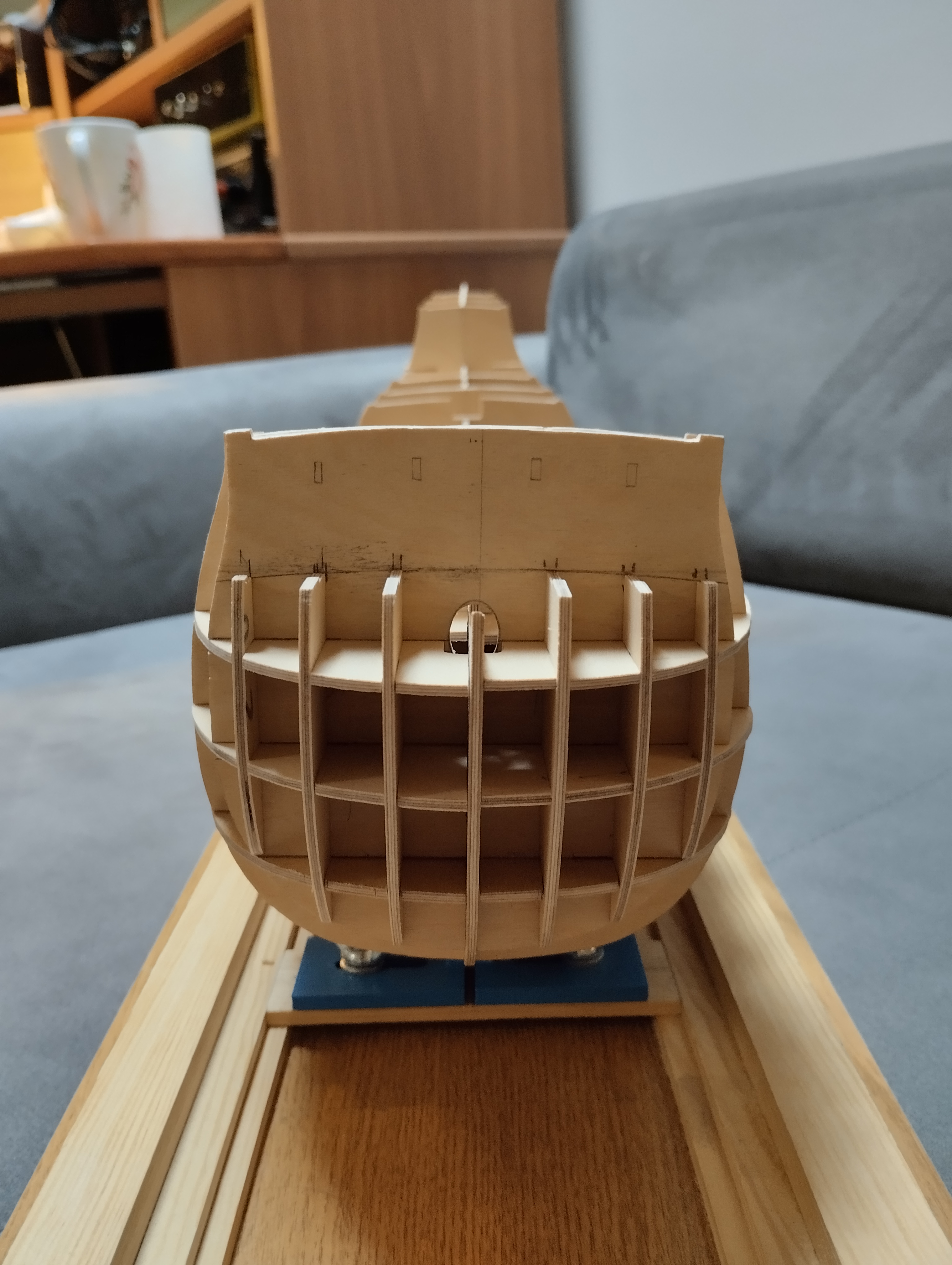Po wklejeniu kazdej pary klockow sprawdzaj na oko symetrycznosc kadluba. Utrzymuj kadlub caly czas w tej "stoczni" usztywniajacej calosc i pozwol tam szkieletowi wyschnac zanim go ze stoczni usuniesz.