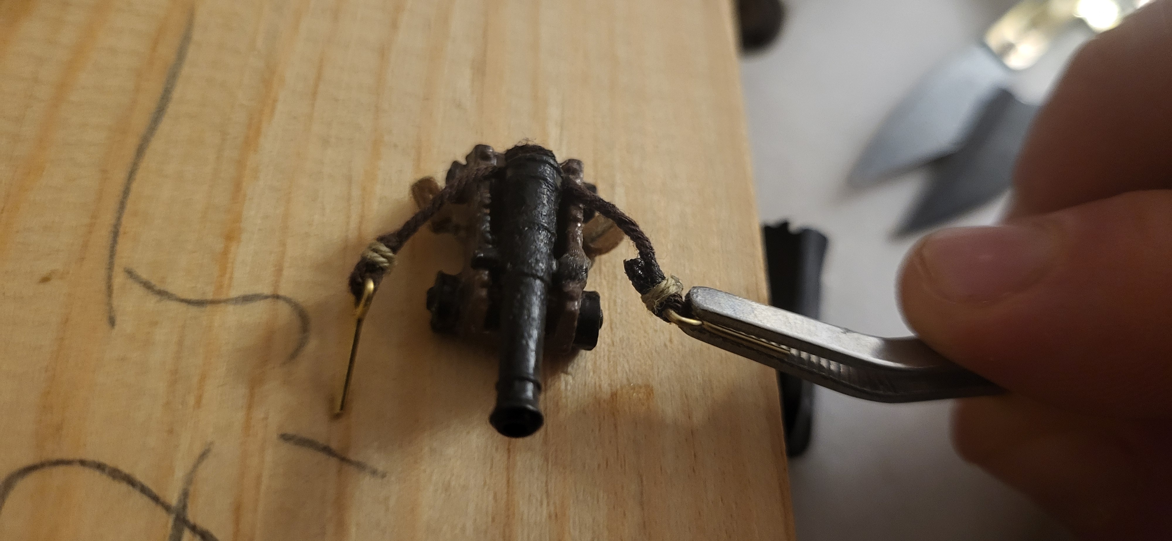 mniej kleju bo supełki się robią zbyt grube i ciężko to skorygować potem, dodatkowo bloczki są klejem związane za sztywno, nie poruszają się "swobodnie", troche dłuższa i luźniej powinna być gruba lina, popróbuje woskowanie lin. Poprawić i uprościć muszę sposób montażu bloczków do lawet metalowych. Ustawić bloczki precyzyjniej: czyli samodoskonalenie ciąg dalszy :shock: W przypadku samej konstrukcji i sposobu mocowania lin pomiędzy burtą i armatą - tak zostawię, wydaje się optymalnie, w przypadku braku opcji wiercenia w lawetach metalowych nie mam innego pomysłu. Może jeszcze lepiej poprowadzę grubą linę od burty do armaty - może jakiś uchwyt, ale bez wiercenia, coś wymyślę.