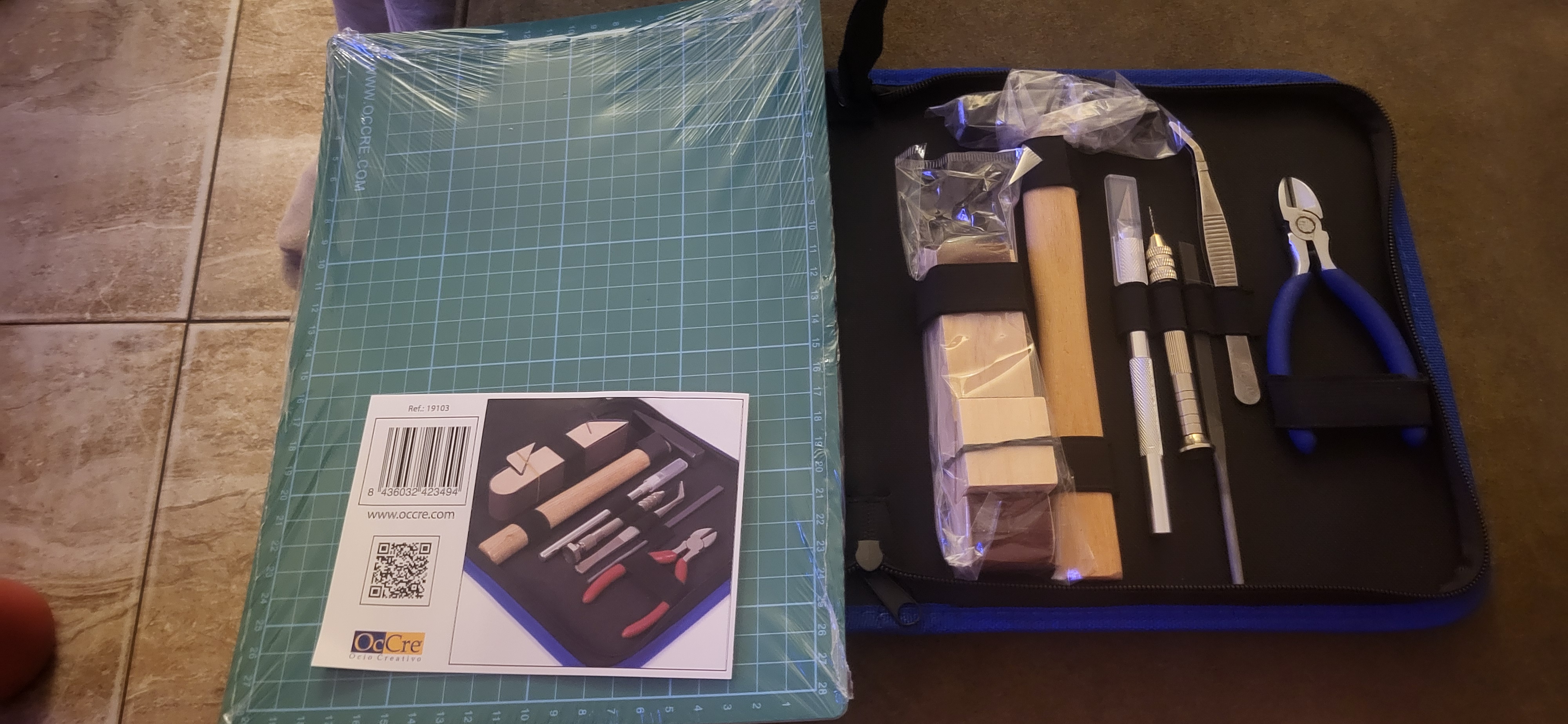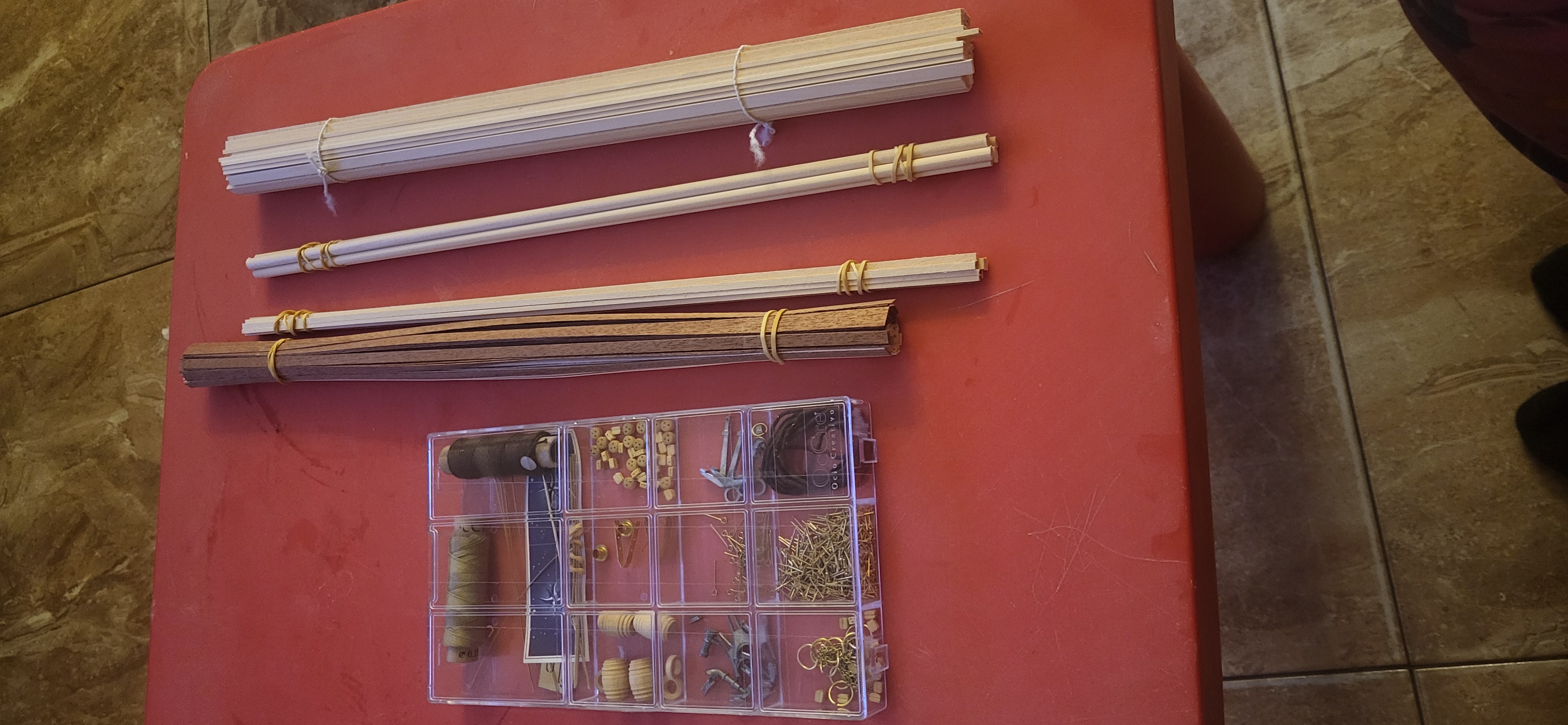 Narzędzia z zestawu, wygladają ok, chociaż nie miałem innych modelarskich w ręce. Dokupiłem gwożdziarke. Napewno musze dokupić więcej papieru ściernego o różnej gramaturze i dodatkowy klej, bo w zestawie jest ale tak chyba na styk. Pierwsze prace rozpoczne od budowy "małej stoczni" z załacznika.Dzisiaj postaram się jakoś zorganizować plac budowy i rozeznać się w planach budowy. Miłej nocy