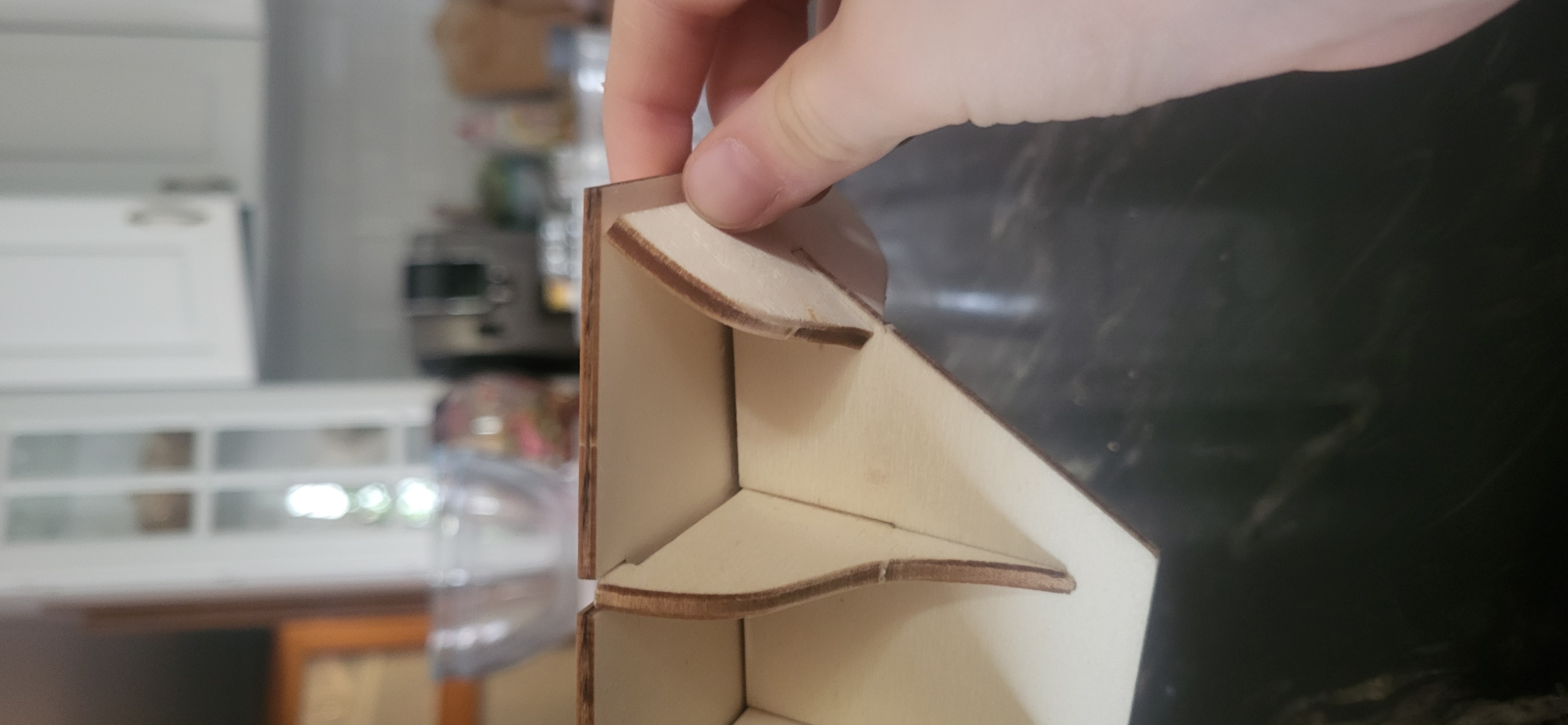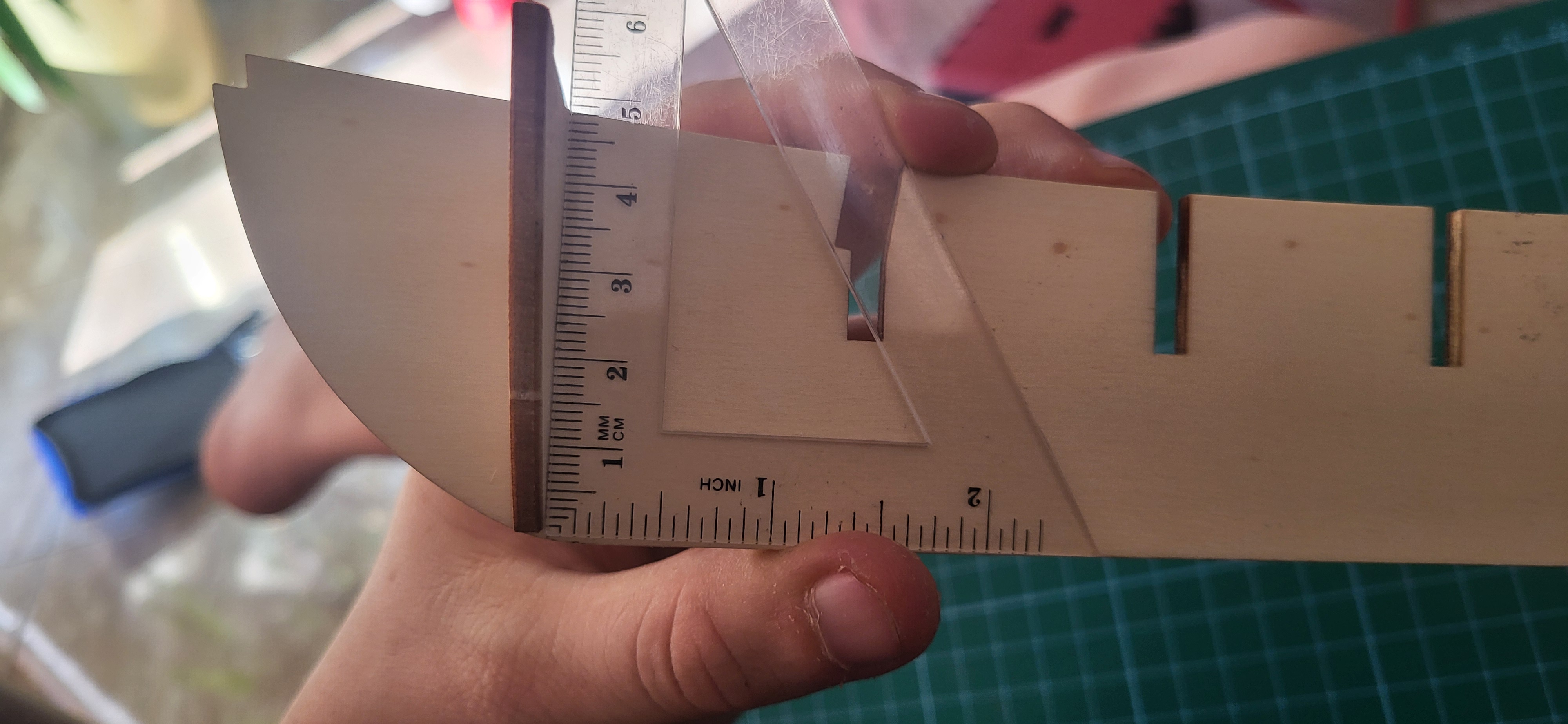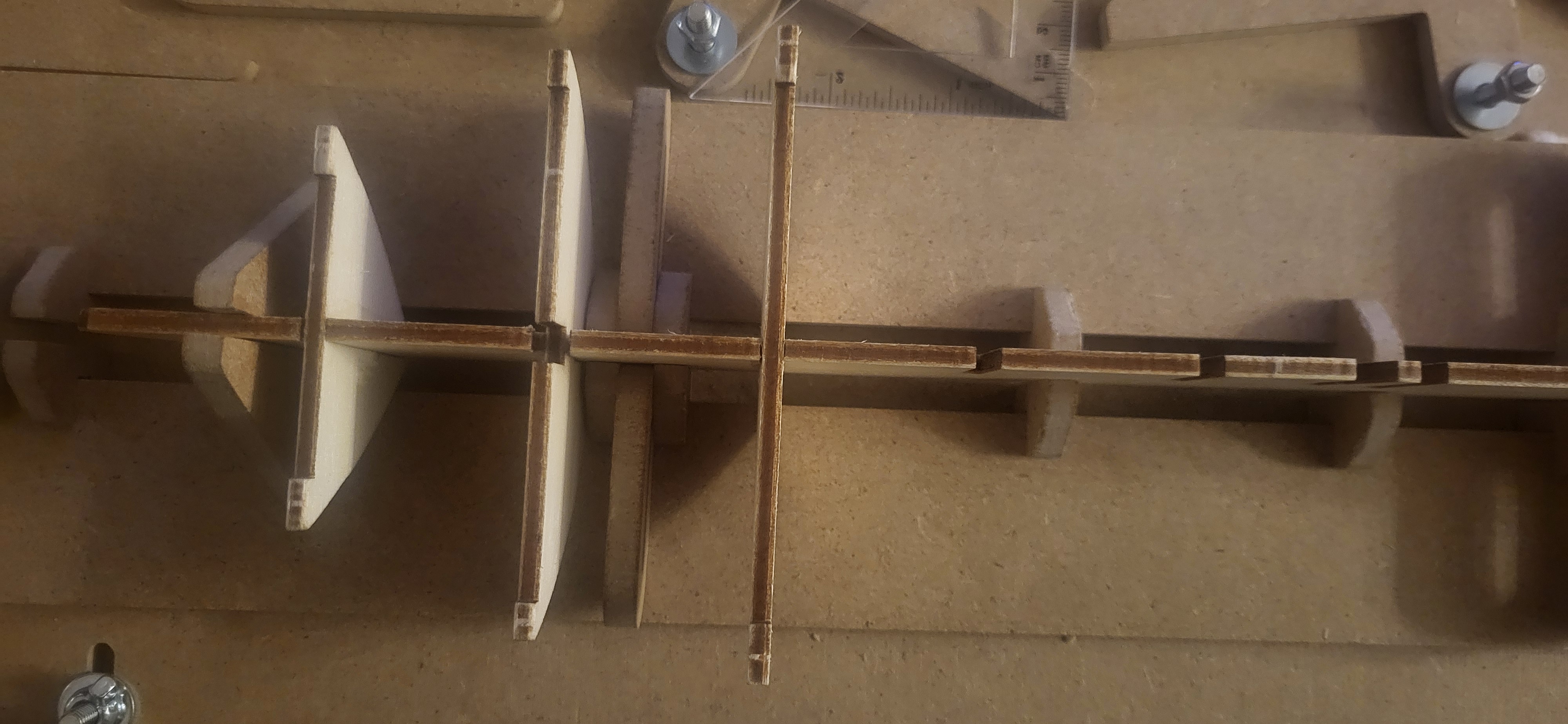 Wstępny szkielet ukończony, jednak pojawił się pierwszy problem techniczny, otóż po przyłożeniu pokladu bez ostatniej wręgi wszystko fajnie spasowane, natomiast po dołożeniu ostatniej - która ma być docelowo szlifowana pojawia się zbyt duży prześwit, nie wiem czy to jest źle docięte i muszę pogłebic otwór żeby niżej się wręga zsunęła? Czy to ma tak być? W załączniku fotki