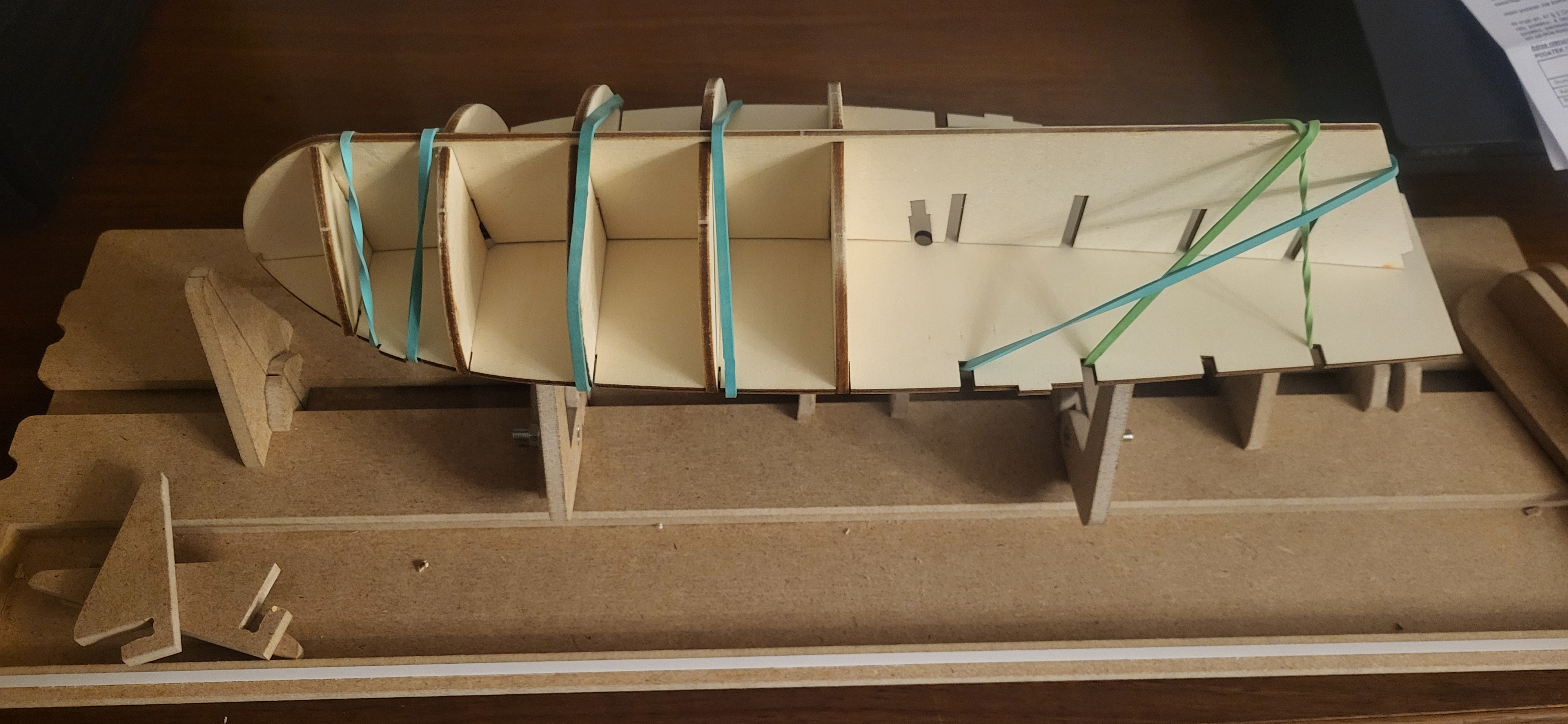 Pokład nie jest doklejony, nie wiem czy tak się robi ale ułożyłem wszystko niech sobie spokojnie klej schnie na wręgach, dopasowany do pokładu, jeszczw jakieś kleksiki kleju dam w kluczowych miejscach i tyle, dobrej nocy