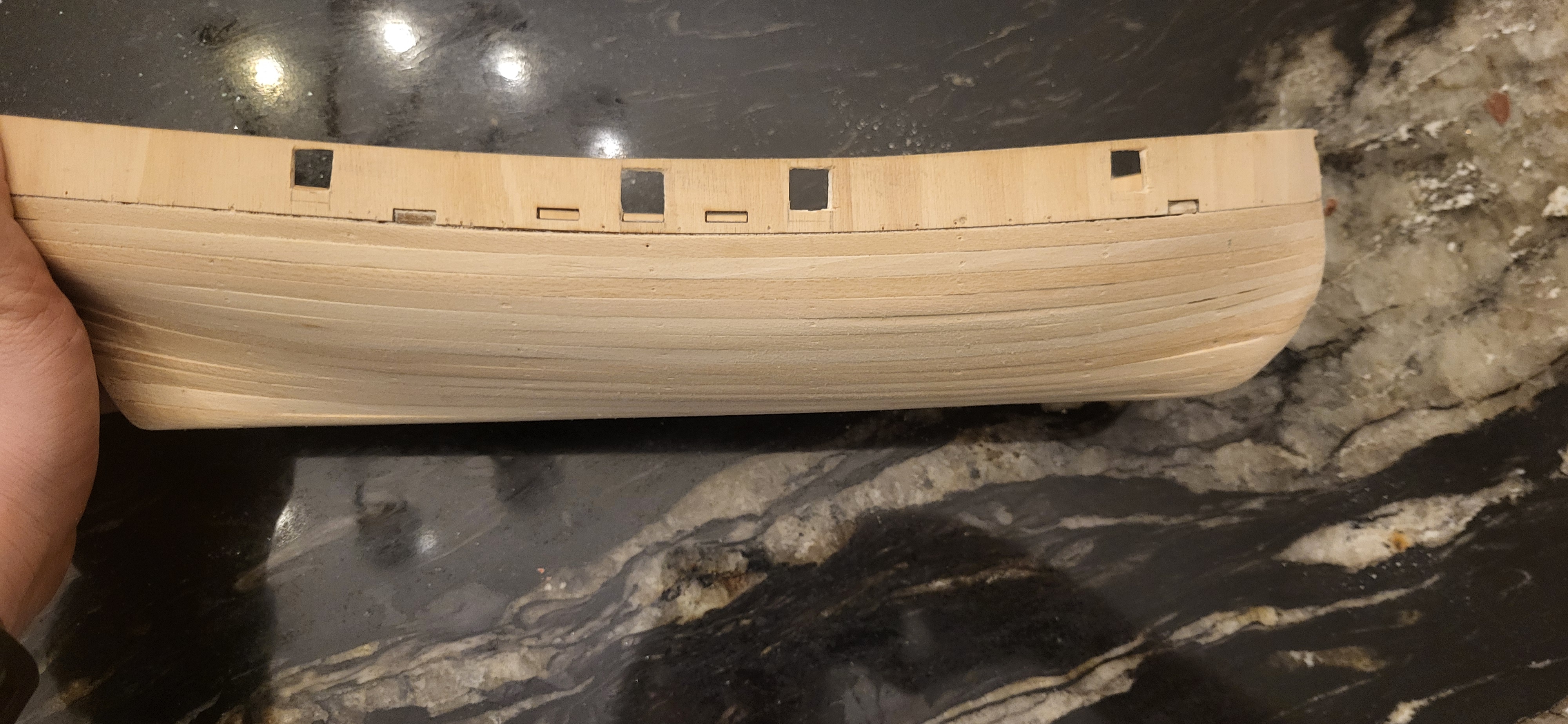 Tymczasem szlifowania dalszy ciąg, nie wiem do jakiego stopnia i kiedy zakończyć bo prawdopodobnie nałożę na to drugie deskowanie czyli poszycie właściwe, ale zabawa fajna :shock: widać szczeliny głównie wcdeseczkach mocniej docinanych - niestety. Prawdopodobnie dam szpachli trochę, następnie bejca, tak bejcy też nie ma w instrukcji na tym etapie, ale myślę, że warto nałożyć bejcę pod kolor poszycia właściwego, jak zle ułoże deseczki na poszyciu właściwym w ciemnym kolorze to nie będzie prześwitywało jasne poszycie. W załączniku obecny efekt. Miłej nocy. PS przy pracach spadł model i uszkodziłem tylne odcinki burt, bez tragedii doklei się a w kolejnym etapie beda tam deseczki więc się usztywni, nawet lepiej dla szlifowania wyszło ale trzeba bedzie naprawić, dobrej nocy. Ps nie jestem jeszcze leniwy na tym etapie ale tak myślę czy poszycie właściwe jest konieczne, nie lepiej to ładnie pomalować po szlifowaniu i szpachlowaniu, no ale jak mus to mus :?