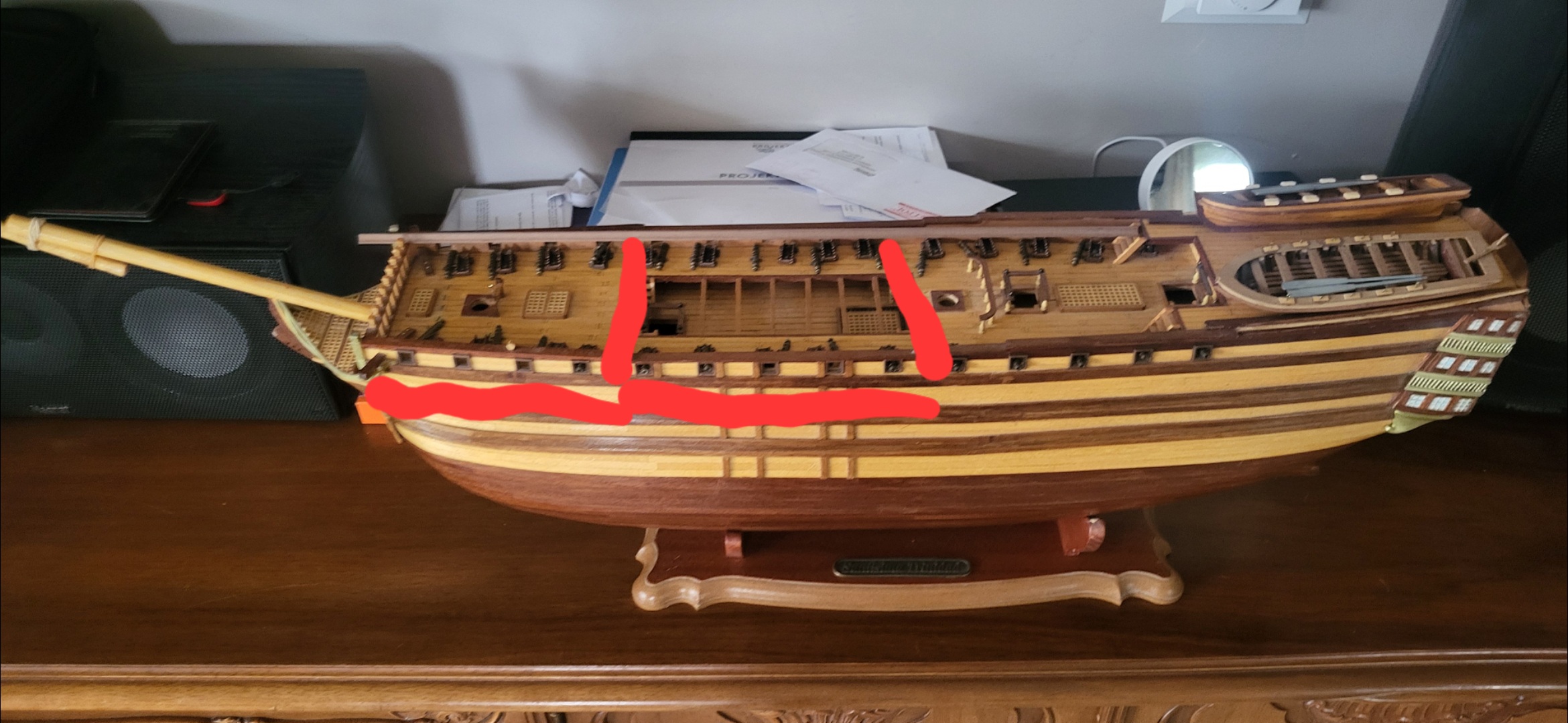 Można bez konsekwencji ciąć niżej w tym miejscu santasimo bez konsekwencji, a dalej z wregami byłyby schody ale to nie potrzebne. W santasimo należałoby przyciąć górną burte tylko i będzie victory :o Wiem, że to za mocne rozważania dla niektórych ale to tylko mój wątek, można go nie czytać. W załączniku foto z możliwego cięcia Santasimo bez konsekwencji. Jednak wystarczy płycej tylko pierwszą linię armat dociąć. Narazie to teoria jak ktoś ma plany Victory 1:90 najlepiej Occre lub inne proszę o podesłanie. Po Polarisie założe abstrakcyjny wątek odnośnie Santasimo i będzie zabawa wtedy, dobrej nocy