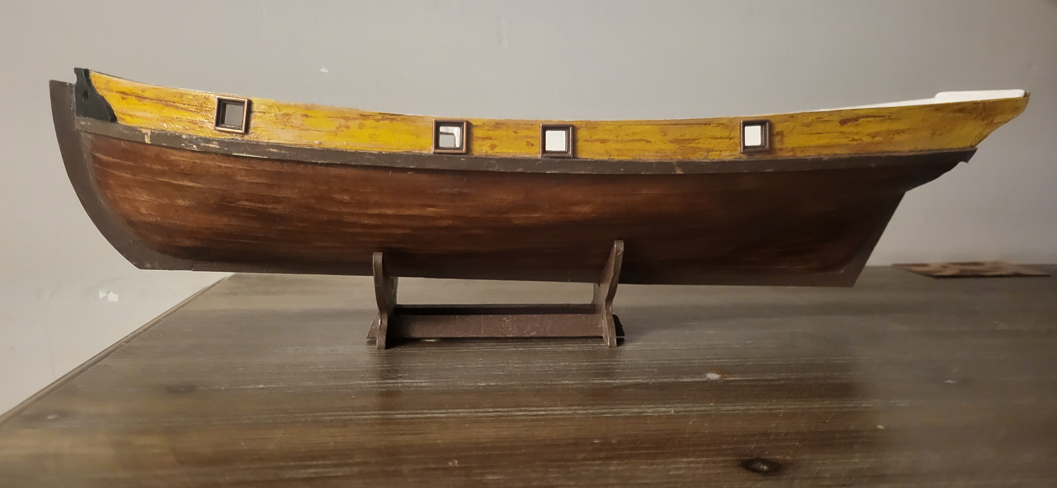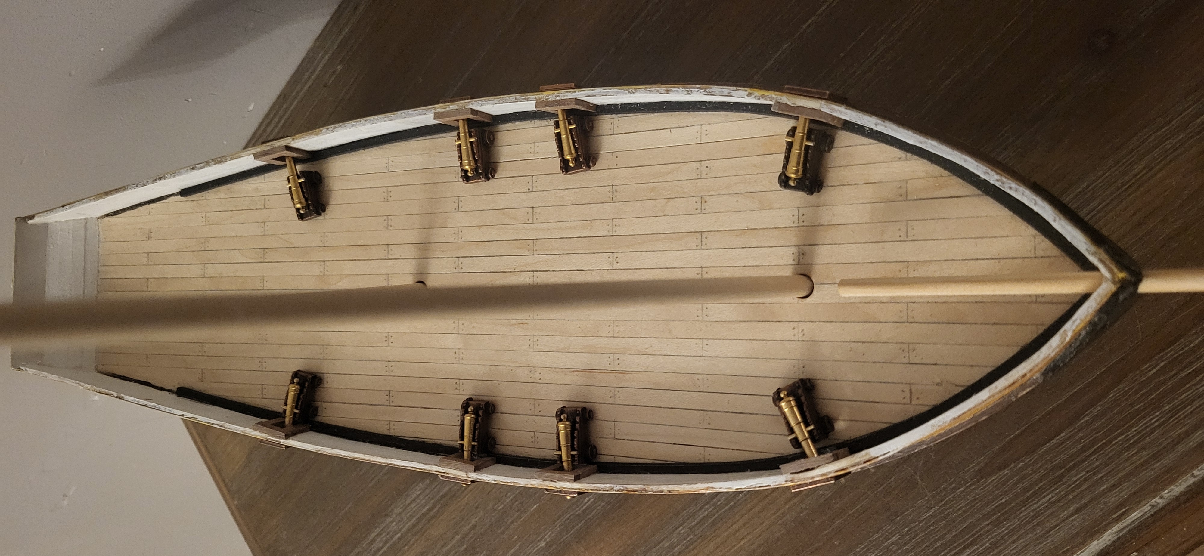 Łatanie otworów pod działa -od środka ciąg dalszy, potem szlifowanie i farba no i poprawki, przypominam, że niestety burty były uszkodzone i naprawiane, gdy zrywałem i ponownie kładłem pokład. Teraz trzeba kombinować, no i kamuflować otwory od środka bo tego nie było w instrukcji. Maszty luxzno włożone - poglądowo, dobrej nocy