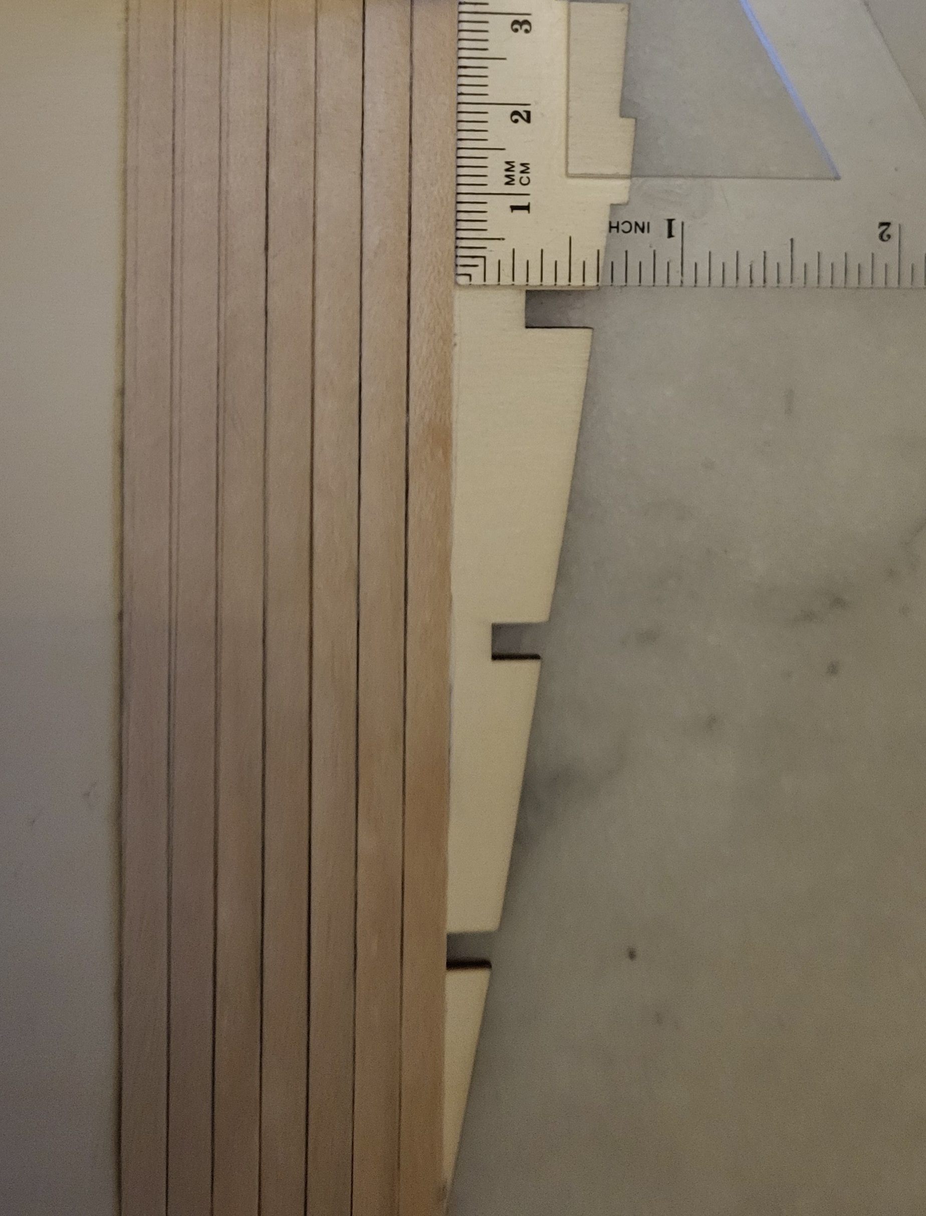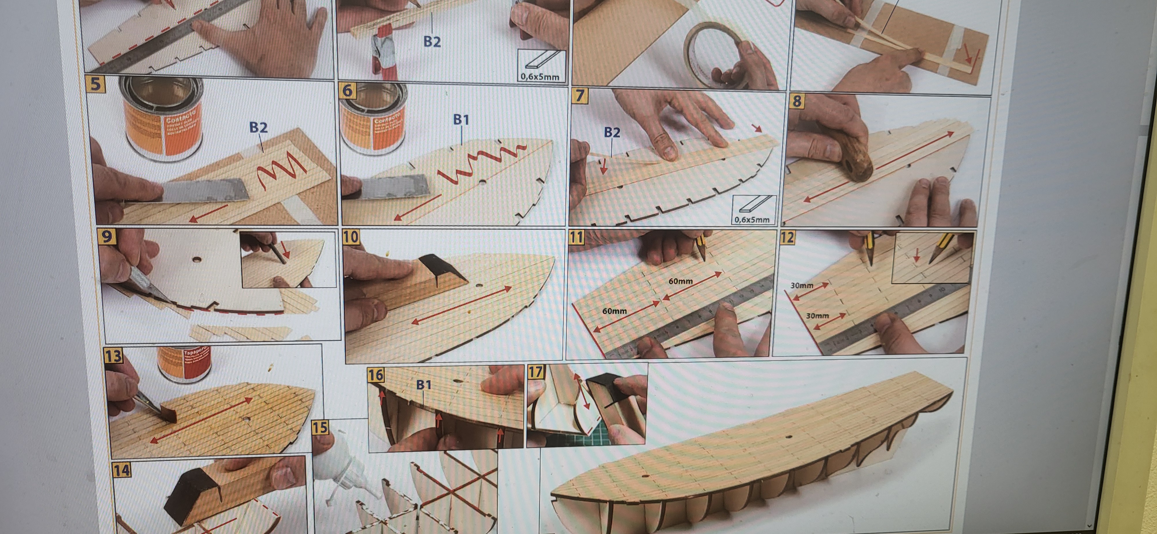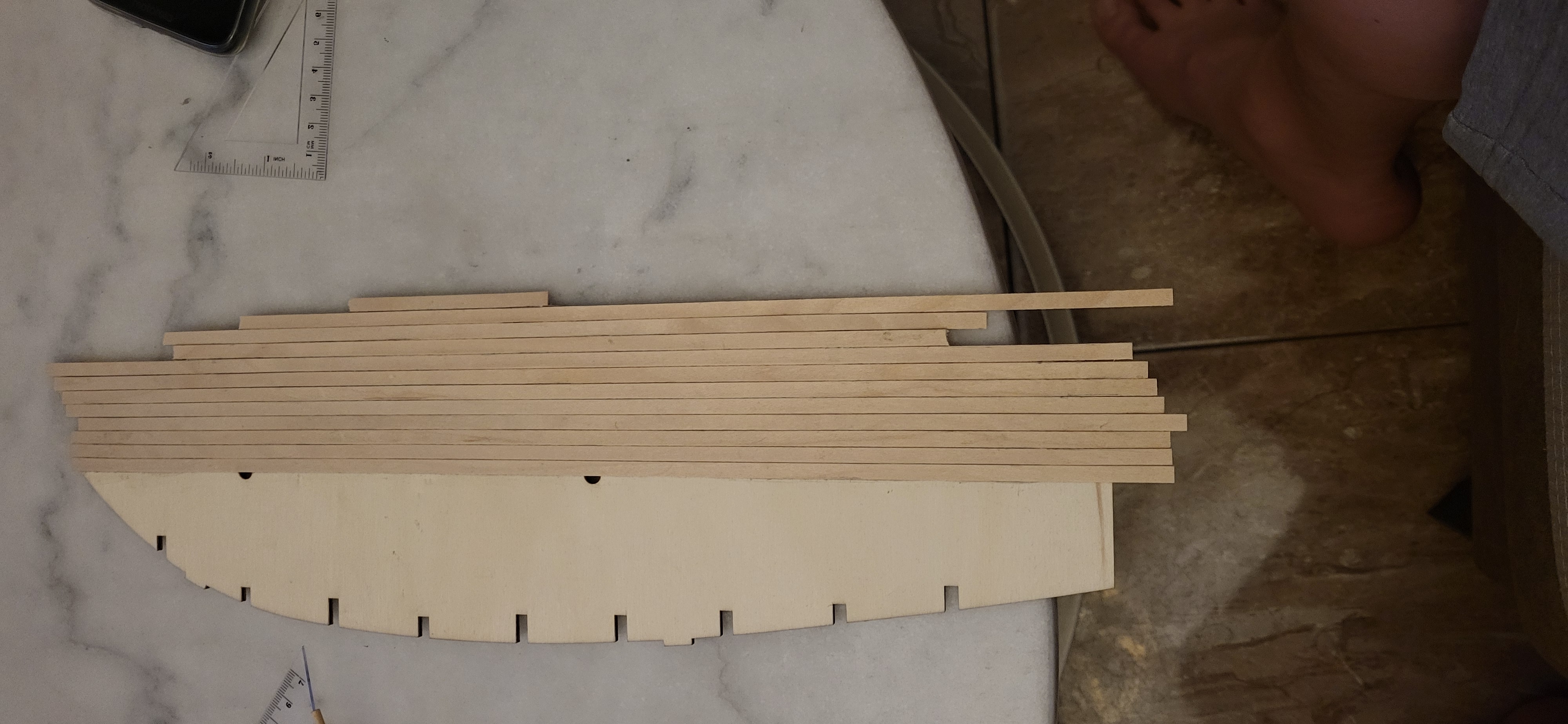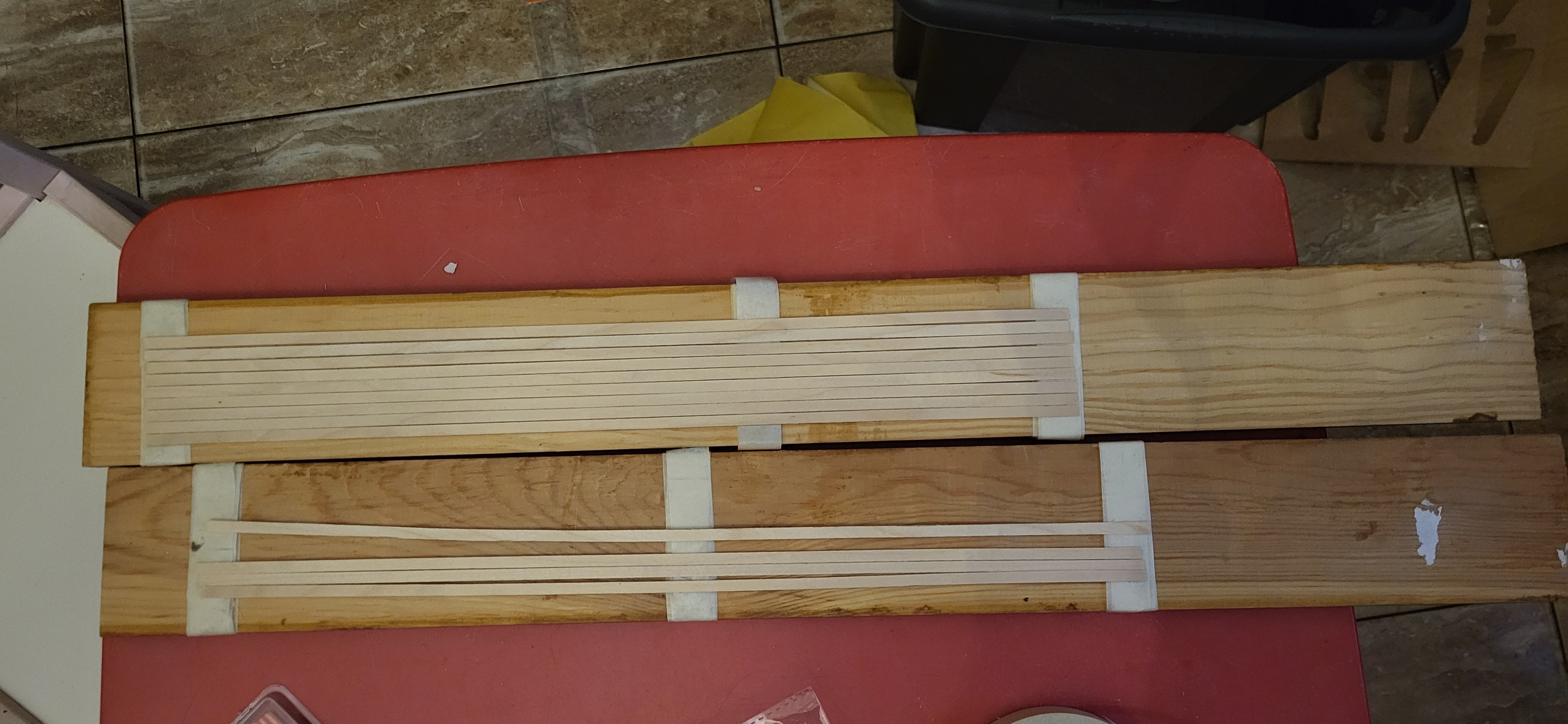 Narazie utrzymuje w miarę kąt, niestety deseczki same w sobie mają wyboczenie i są odchyłki w grubości, będę musiał wszystko zeszlifować na koniec. Ze względu na moją pomocnicę 6 l, zrezygnowałem z kleju kontaktowego modelarskiego, kupilem zwykły do drewna, do użytku wewnętrznego, będzie to trwać dłużej ale nie musze często wietrzyć. Ewidentnie czuję brak doświadczenia i widzę postepy w miarę klejenia to idealny model na pierwszy - narazie
