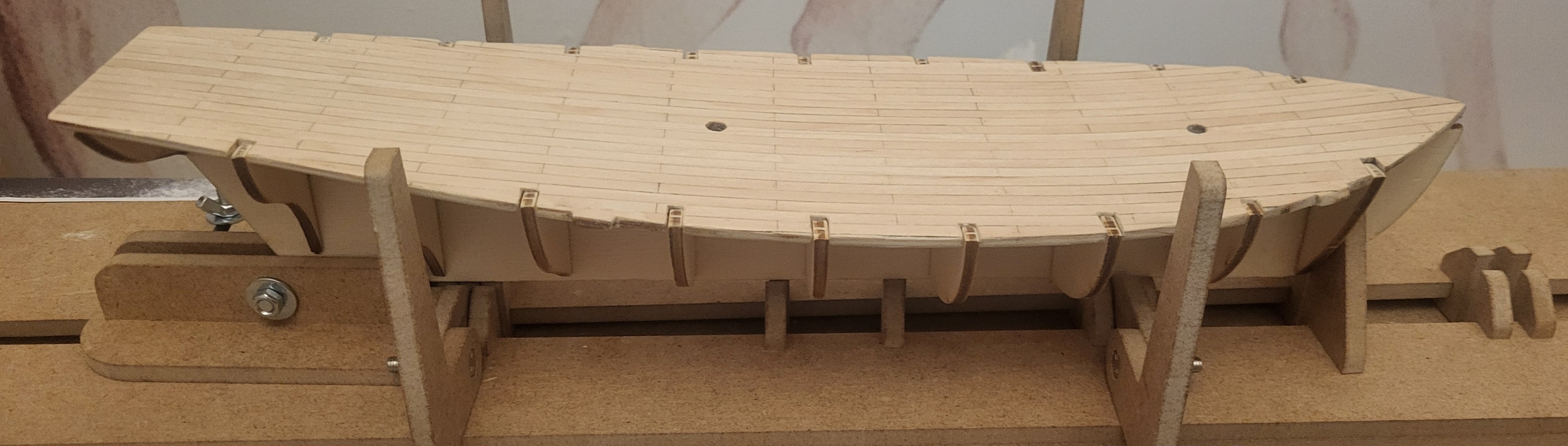 Wszystko wyszlifowane, jeszcze schnie farba na pokładzie po kołkowaniu. Nastepny etap to krzywienie i montaż burt i wykonanie otworów pod armaty. Pózniej niestety przerwa bo muszę poczytać jak deskowanie zrobić. Dobrej nocy