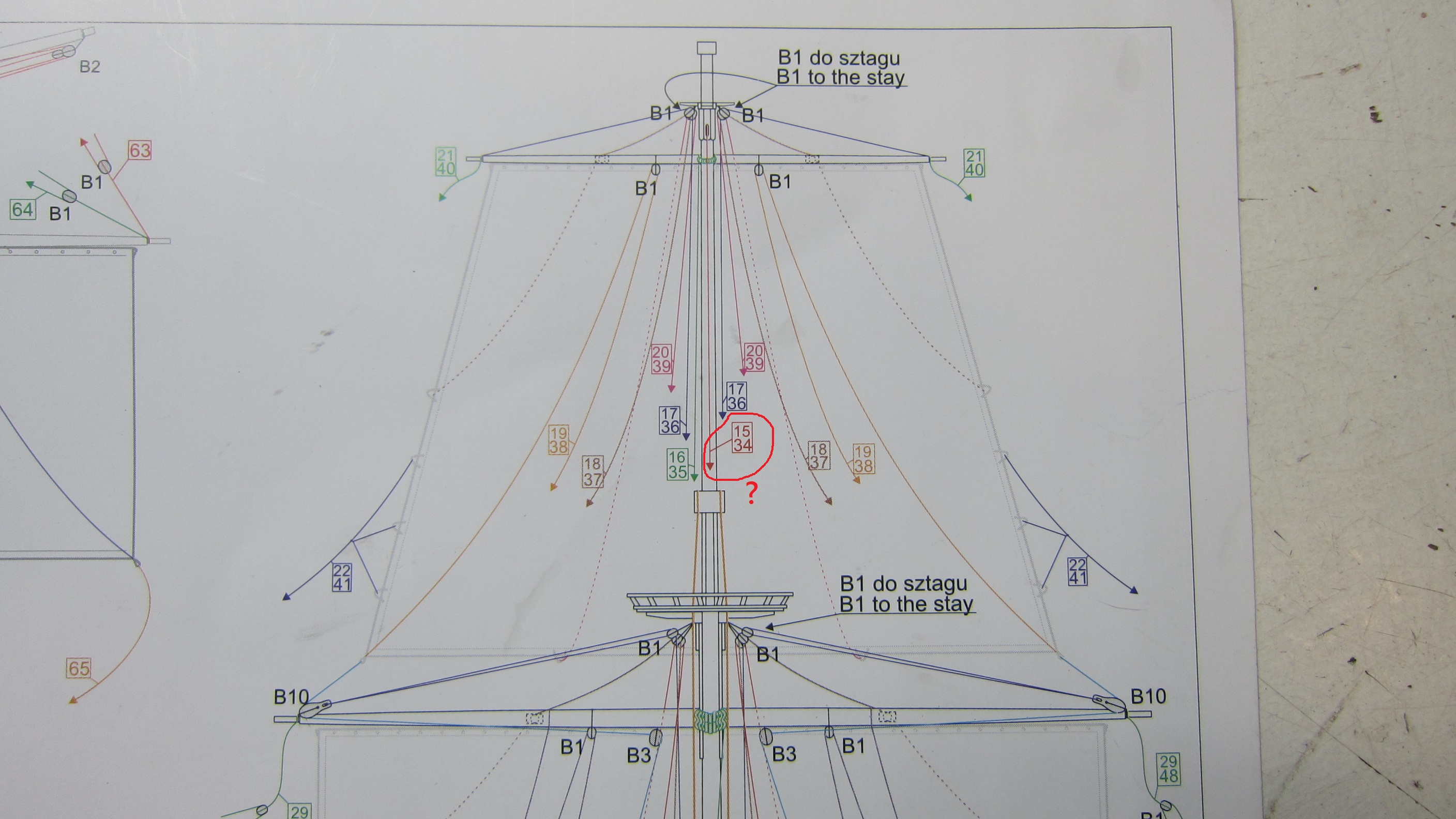Twoja ostatnia sugestia zainspirowała mnie do podejrzenia rozwiązania zastosowanego na Mayflowerze, którego model wykonałem jakiś czas temu. Tam oba fały każdej marsrei poprowadzono w kierunku burt i ściągane są poprzez podwójne zblocza, których linę zamocowano przy burtowej kołkownicy. Chyba tak zrobię.