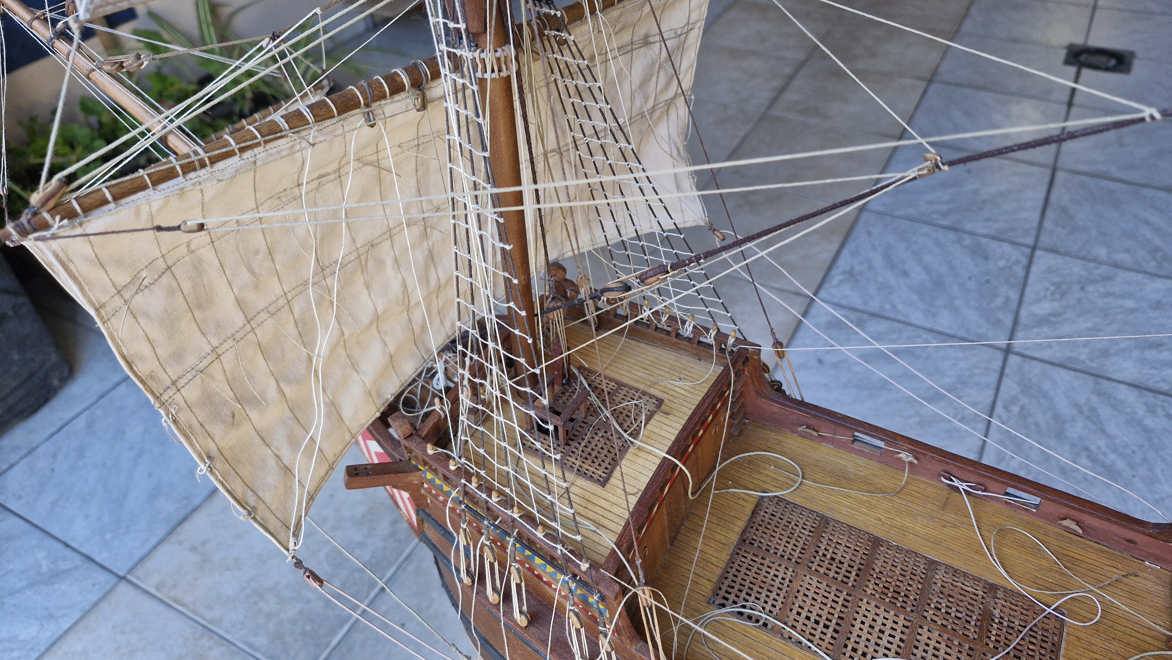 Znalazlem jeszcze jedna fotke galeonu "San Salvador" pokazujaca foremast (fokmaszt) widziany od tylu (tj.rufy), gdzie dobrze widac ten detal. Numerkiem 1 zaznaczylem wyjscie lin (wybacz ale pozostane przy anglosaskim nazewnictwie) - halyards dla foreyard (fokrei), ktore sa okrecone wokol blokow wydrazonych u gory masztu (wejscia ich tam tu nie widac, bo widok jest od tylu), po czym ida w dol, do w/w pachola - nr. 2, gdzie sie owijaja, a dalej widac ciensza line okrecona trzy razy przez bloki w tym pachole ktora idzie ku dolowi, pod poklad dziobowy i tam analogicznie sie okreca wokol innego pachola i jest zamocowana (belayed) na jego koncu (tego tez tu nie widac, bo ow detal jest ukryty pod w/w pokladem.