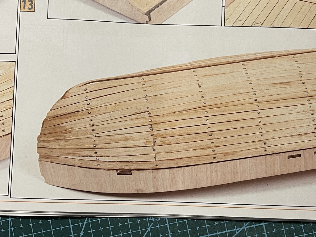 Instrukcja jest tu prosta - złóż szkielet (bez jakiegokolwiek modyfikowania profilu dziobu, poza jego spłaszczeniem tak żeby planki lepiej przylegały) i kładź poszycie.