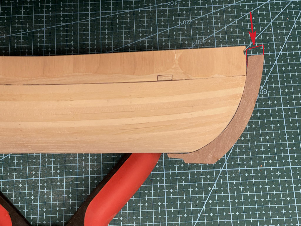 Po mojemu wewnętrzny kształt dziobnicy jest prawidłowy i nie jest "babolem". "Babola" popełniłeś Ty. Wewnętrzna krzywizna dziobnicy powinna idealnie pasować do dziobowej krzywizny osiowej podłużnicy. Ty ją plankami poszycia zabudowałeś i dlatego nie pasuje. Teraz musisz na dziobie kadłuba wyciąć szczelinę o grubości dziobnicy, aż do samej podłużnicy. Tam dziobnica ma wejść i prawidłowo pasować. dalsza część kilu i stewy (tylnicy) rufowej też.