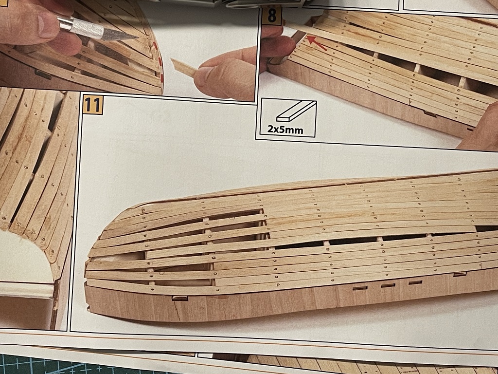 Kształt i wysokość dzioba, jak i całego kadłuba determinują elementy szkieletu, a tu wychodzi na to że stewa jest za wysoka o 7-8 mm. Na szczęście jest za wysoka, nie za niska, więc myślę że uda się ją dopasować. Nie jest to też jakiś skomplikowany kształt w razie gdyby trzeba było zrobić nową.
