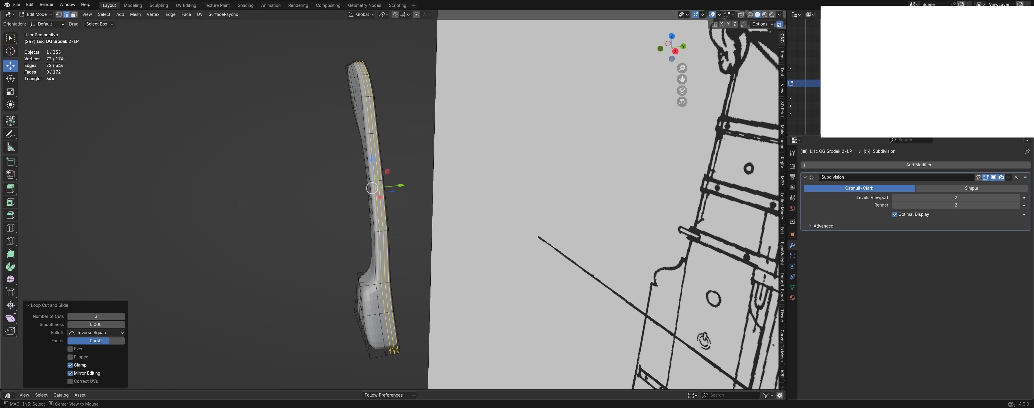 3. Teraz masz model w Low Poly. Żeby przejśc do High Poly dodajesz modyfikator subdyvison surface CTR+2(lub inna liczba w zależności od zagęszczenia-jakości). Model nam się teraz trochę rozpłaszczył trzeba mu dodać Plane Cuts w Edit Mode(CTRL+R) żeby zachować płaski tył jeżeli model przylega do innej powierzchni. Czasami przydatne jest nie robienie tego jeżeli potrzebna jest bardziej gąbczasta forma.