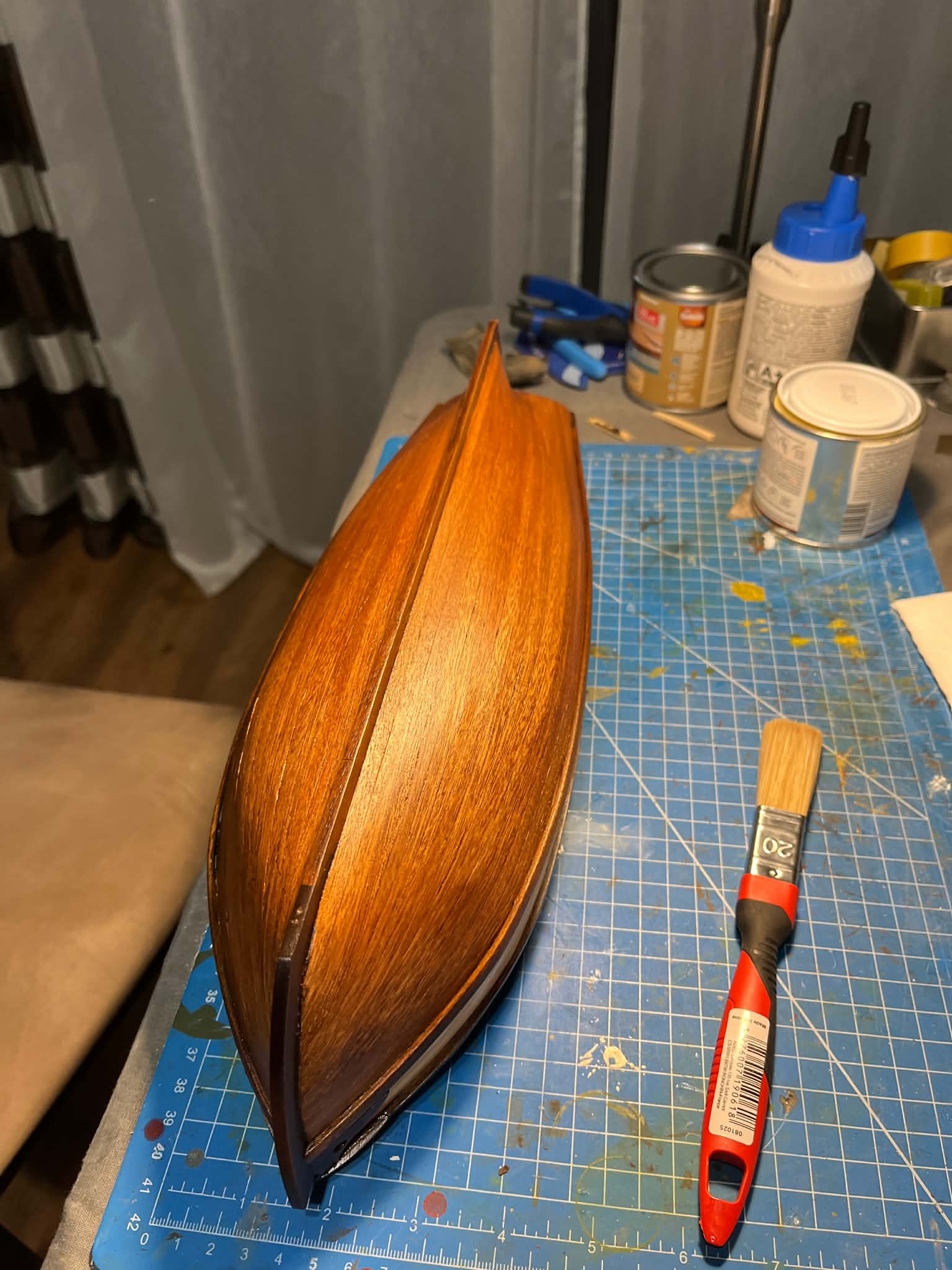 Drugi problem okazał się już bardziej problematyczny. Elementy wcześniej bejcowane, a zamontowane na kadłubie bez żadnego zabezpieczenia, po kontakcie z akrylowym lakierem rozcieńczanym wodą zaczęły puszczać kolor i barwić lakier. Malowałem dużym pędzlem i w efekcie zabrudziłem jaśniejsze elementy kadłuba. Nauczka na przyszłość: bejca + lakier zawsze przed montażem. W tym przypadku używałem bejcy Occre, ale podobnie zachowują się również standardowe bejce z marketów budowlanych.