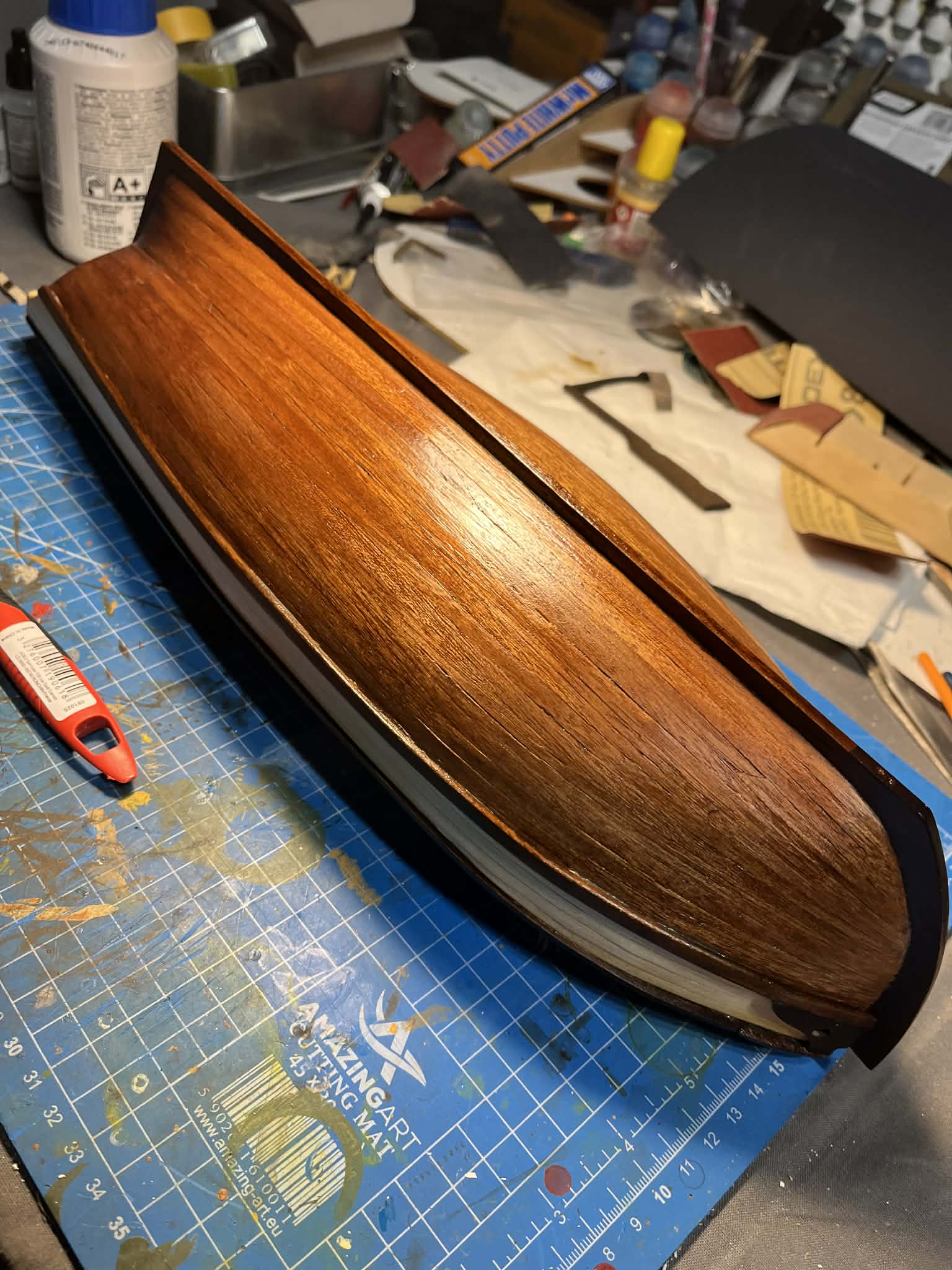 Na tym etapie wstawiłem sztuczne przedłużenia wręg w rejonie burt i przeszedłem do lakierowania całego kadłuba. Tutaj pojawiły się dwa problemy.