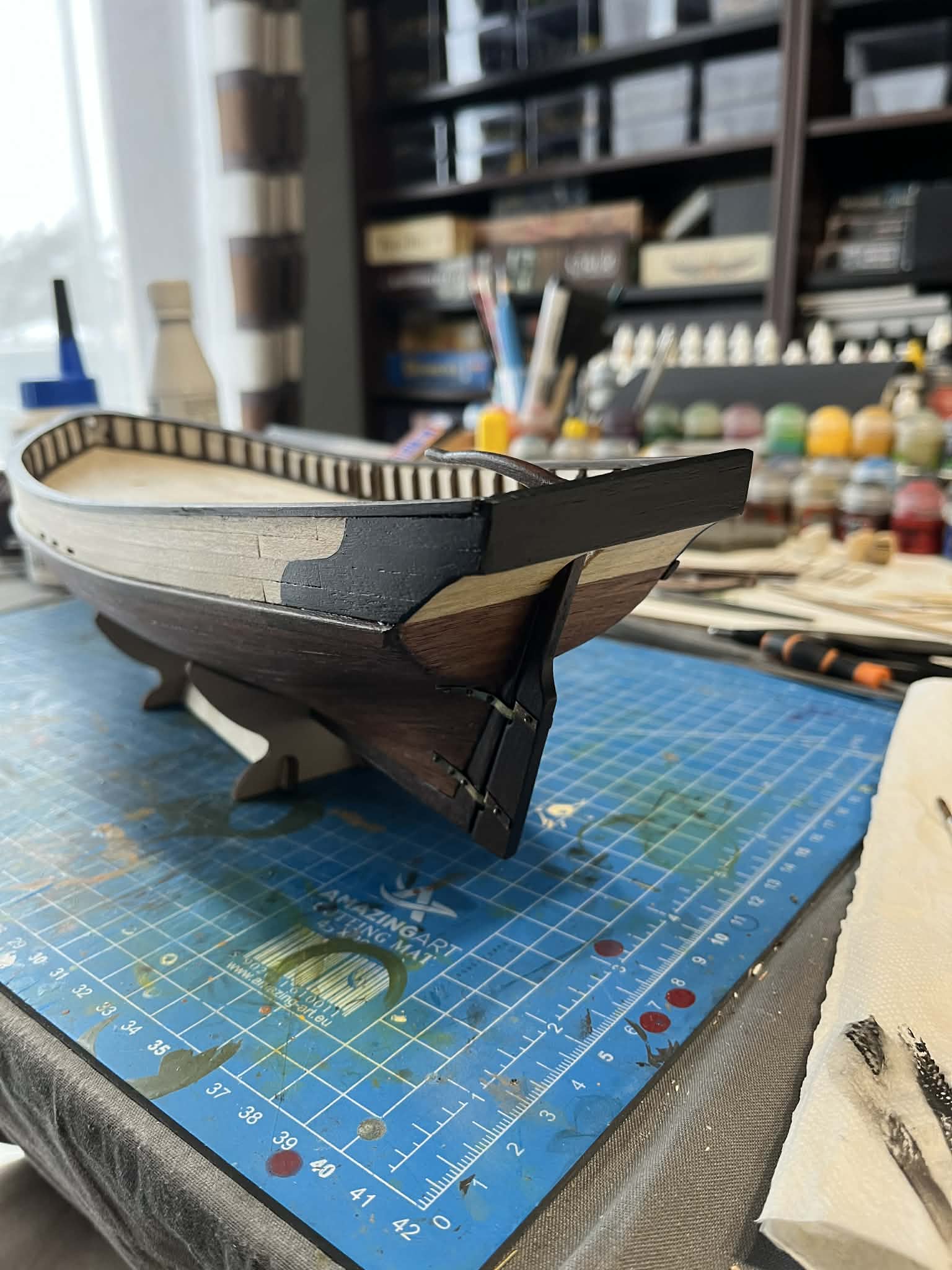 Mając gotowy główny kadłub, zacząłem przygotowywać drobne detale: beczki, mocowania lin, luki itp. Eksperymentowałem trochę z kolorami na beczkach i krawędziach desek. Instrukcja sugerowała użycie markera — spróbowałem, ale efekt był bardzo średni. Ostatecznie przeszedłem na czarną farbę akrylową, która okazała się zdecydowanie lepsza, bo pozwala na łatwe poprawki, jeśli ręka gdzieś „ucieknie”.