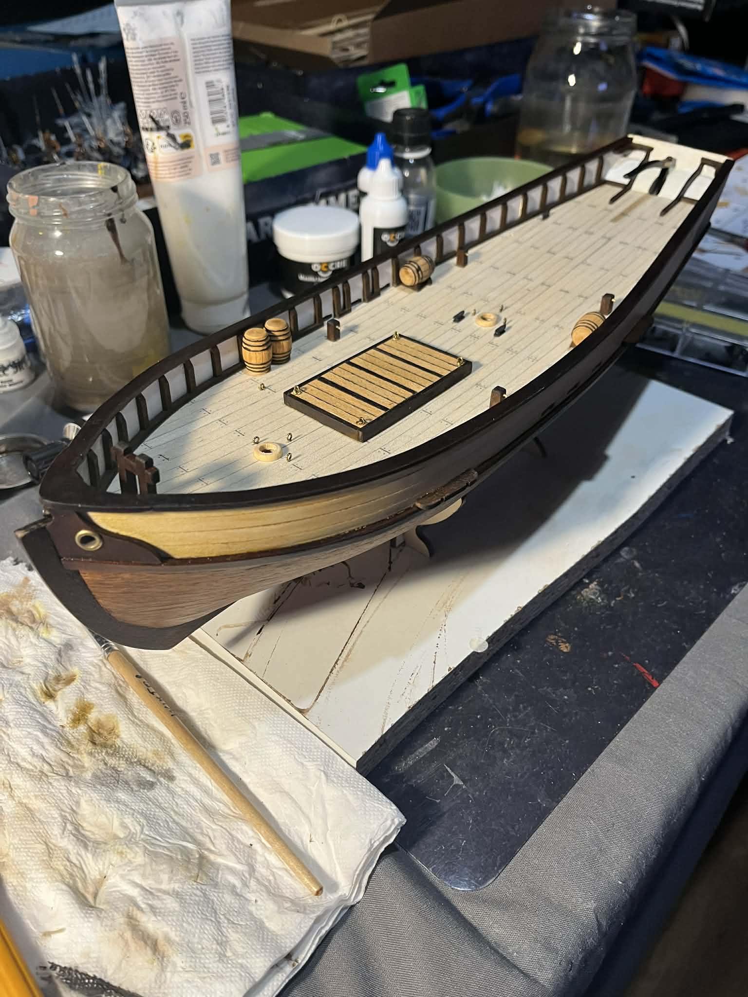 Mając gotowy główny kadłub, zacząłem przygotowywać drobne detale: beczki, mocowania lin, luki itp. Eksperymentowałem trochę z kolorami na beczkach i krawędziach desek. Instrukcja sugerowała użycie markera — spróbowałem, ale efekt był bardzo średni. Ostatecznie przeszedłem na czarną farbę akrylową, która okazała się zdecydowanie lepsza, bo pozwala na łatwe poprawki, jeśli ręka gdzieś „ucieknie”.