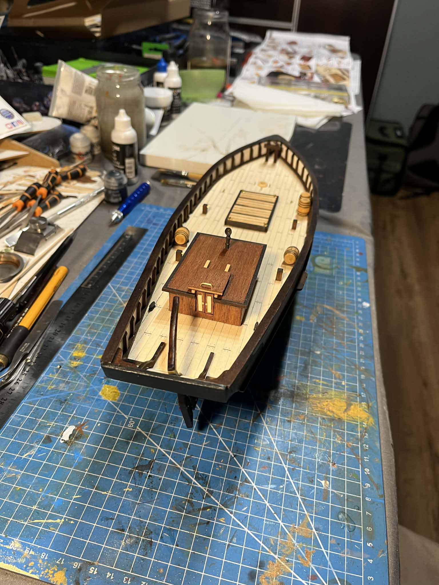 Finalnie zamontowałem sterówkę na pokładzie - efekt po tym tygodniu można zobaczyć na załączonych zdjęciach. Zostały jeszcze jakieś drobiazgi na pokładzie i powoli będę przechodził do takielunku - jufersy, bloczki i maszty.