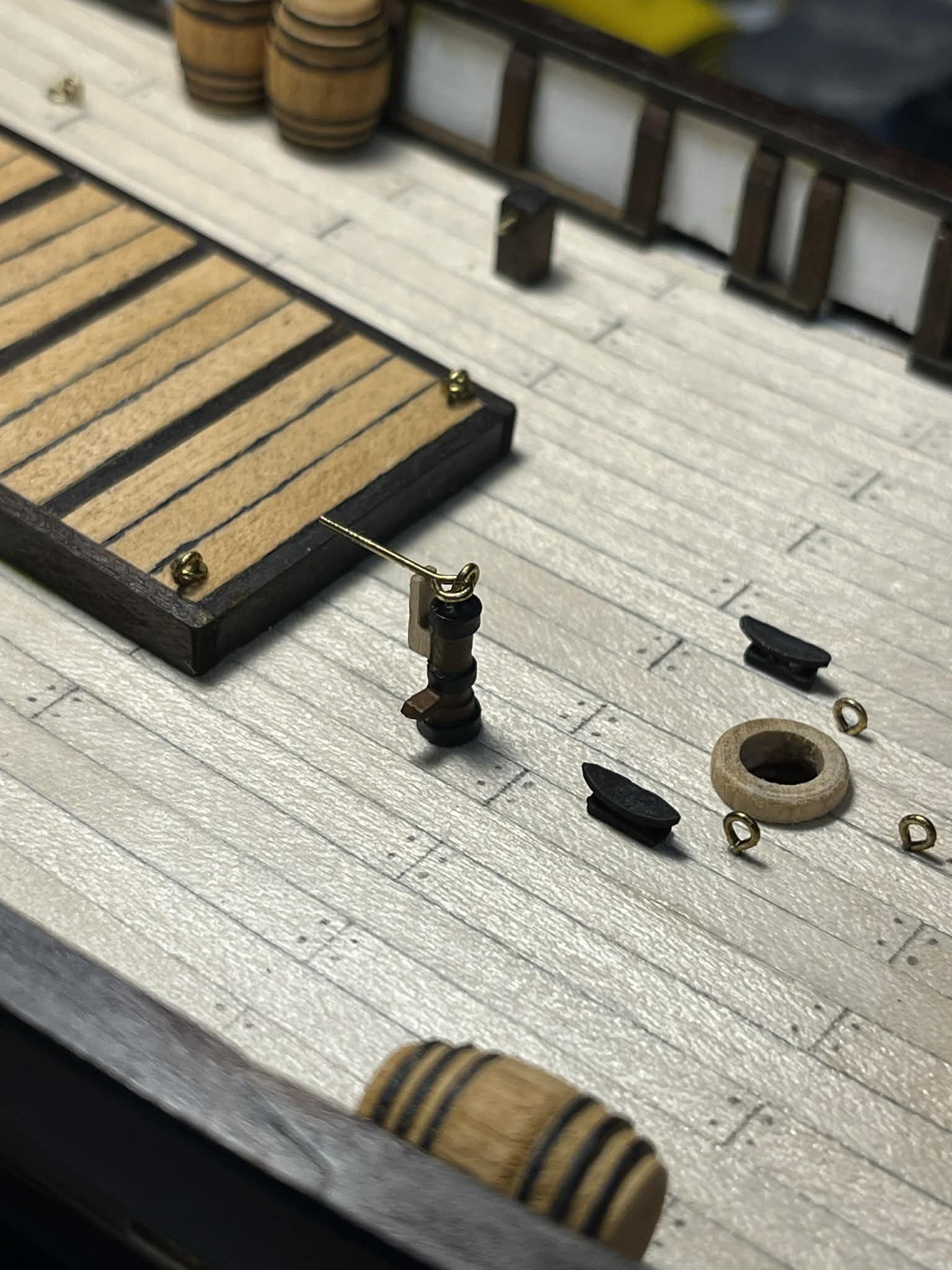 Używając kleju do drewna PVA zamontowałem wykonane wcześniej detale. Polakierowałem je przed przyklejeniem, żeby uniknąć pobrudzenia podładu farbą/bejcą. Dodatkowo postarzyłem elementy metalowe (knagi, kotwice, rury) płynem do czernienia - AK Metal Burnishing (kilkanaście sekund w specyfiku wystarczyło). W celu zamontowania uchwytów oczkowych zrobiłem najpierw dziurki wiertarką ręczną, a dopiero potem wbiłem szpilku z oczkami.